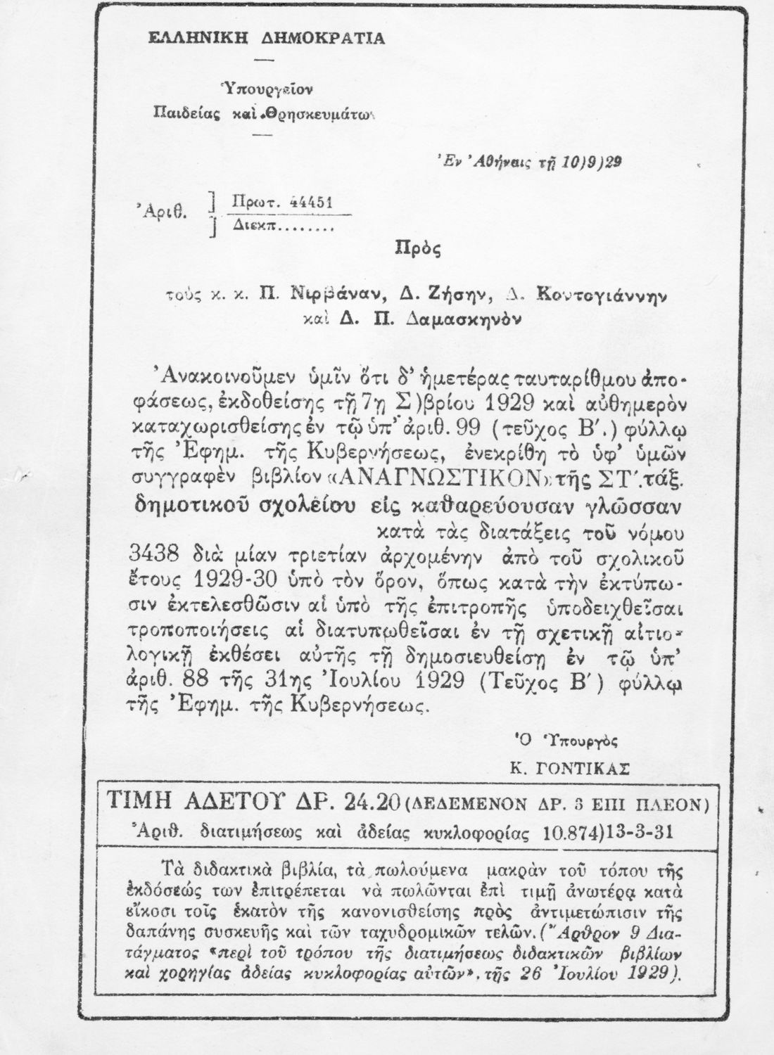 Εκδότης: Δημητράκος Έτος έκδοσης: 1931 Τόπος έκδοσης: Αθήνα Έκδοση: 2η Υπουργική απόφαση / Σύμβαση: 44451/7-9-1929 Έτος έγκρισης: 1929 |
