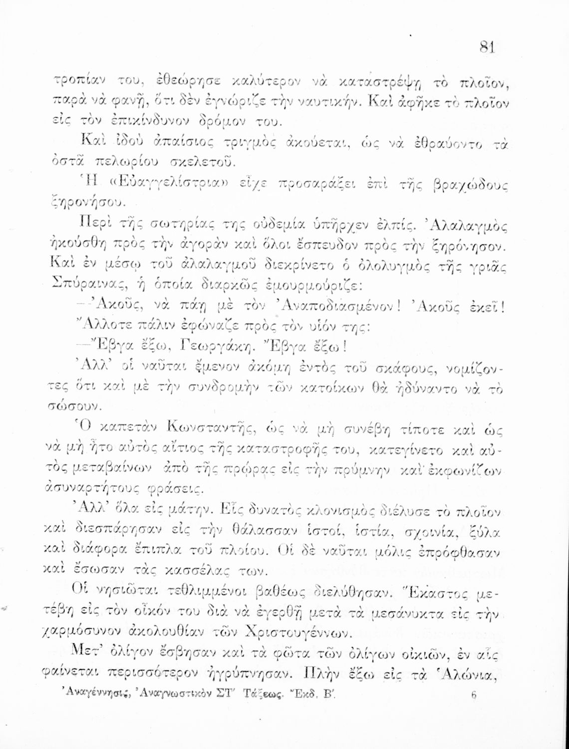 Βαθμίδα εκπαίδευσης: Πρωτοβάθμια Τάξη: ΣΤ' Δημοτικού Μάθημα: Νέα Ελληνικά Γλώσσα: Καθαρεύουσα Παρουσίαση περιεχομένου: Αναγνωστικό ΣΤ΄ Δημοτικού που περιλαμβάνει κείμενα Ελλήνων συγγραφέων εμπνευσμένα από την οικογενειακή παράδοση, τα θρησκευτικά ήθη και έθιμα, τις καθημερινές ασχολίες και επαγγέλματα των ανθρώπων, τα εθνικά σύμβολα, την αρχαία και νέα ελληνική ιστορία και την αγάπη για την φύση και τα ζώα. |