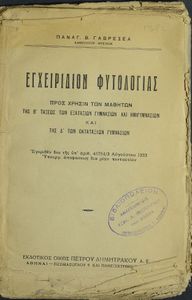 Κωδικός αναγνώρισης: 20-01397 Τίτλος: Εγχειρίδιον φυτολογίας προς χρήσιν των μαθητών της Β΄ τάξεως των Εξαταξίων Γυμνασίων και Ημιγυμνασίων Συγγραφέας: Παναγ. Β. Γαβρεσέας Μέγεθος και υπόστρωμα: Σχολικό εγχειρίδιο, 22εκ., μαλακό εξώφυλλο, 160 σελίδες. Σκίτσα (ασπρόμαυρα). |