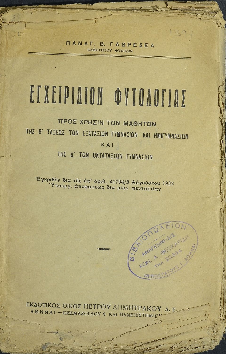 Εκδότης: Πέτρος Δημητράκος Έτος έκδοσης: 1933 Τόπος έκδοσης: Αθήνα Υπουργική απόφαση / Σύμβαση: 41794/3-8-1933 Έτος έγκρισης: 1933 |