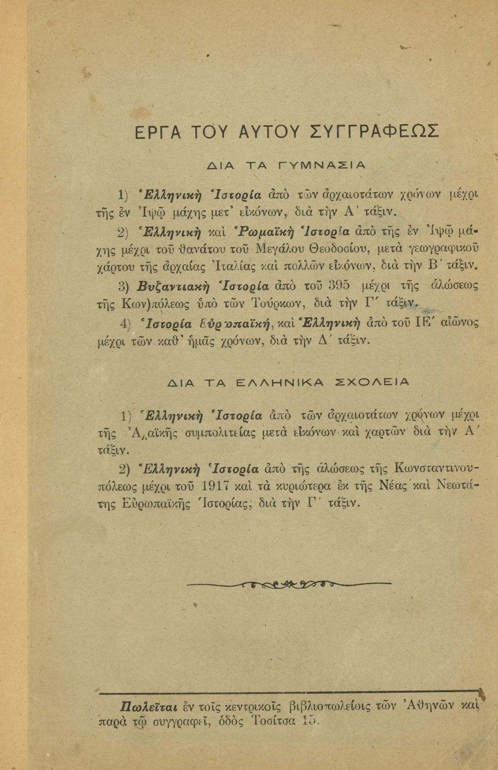 Τίτλος: Ελληνική ιστορία από των χρόνων της Αχαϊκής συμπολιτείας μέχρι της Αλώσεως της Κωνσταντινούπολης υπό των Φράγκων διά την Β΄ τάξιν του Ελληνικού Σχολείου