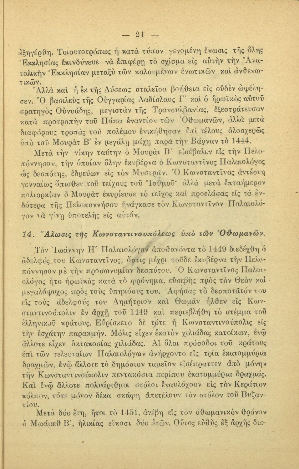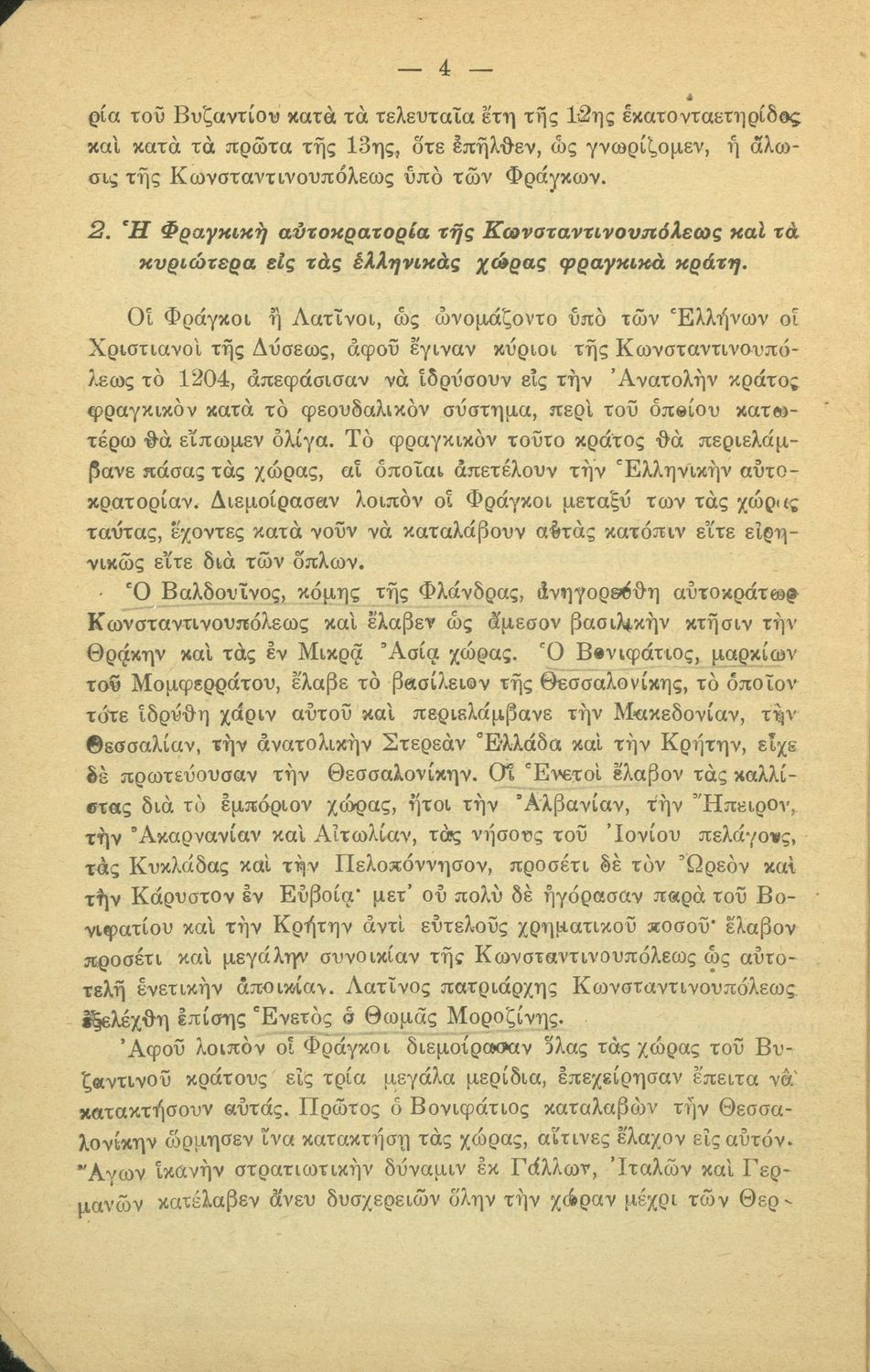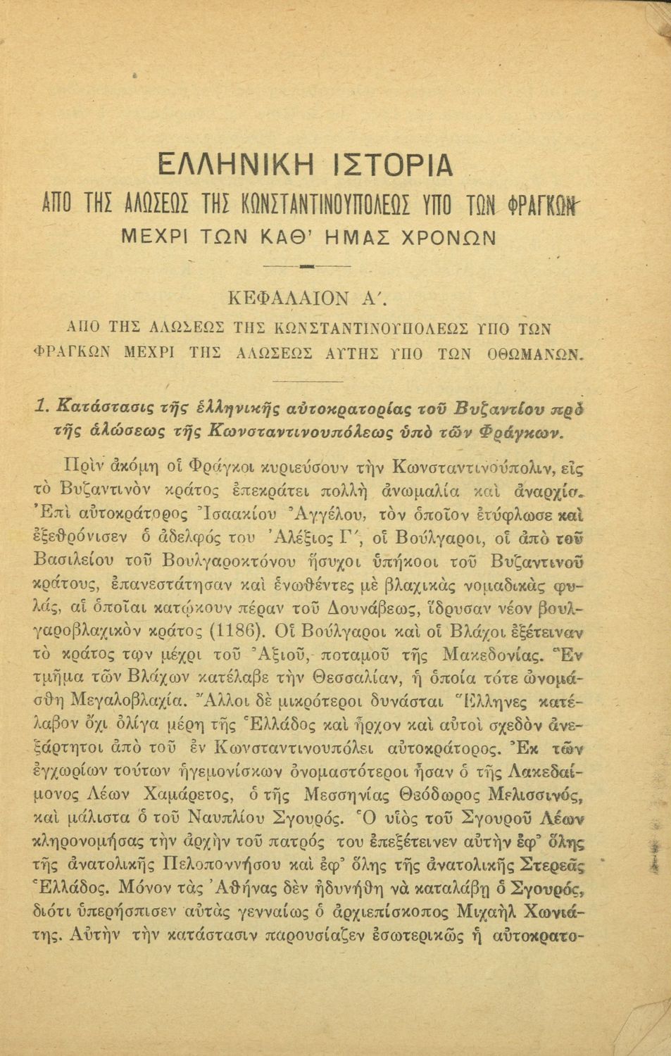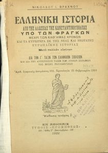 Βαθμίδα εκπαίδευσης: Δευτεροβάθμια Τάξη: Γ' Ελληνικού Σχολείου Μάθημα: Ιστορία Γλώσσα: Καθαρεύουσα Παρουσίαση περιεχομένου: Σχολικό εγχειρίδιο Ιστορίας Γ' Ελληνικού Σχολείου που καλύπτει την περίοδο από την άλωση της Κωνσταντινούπολης από τους Φράγκους μέχρι την συνθήκη του Βουκουρεστίου. |