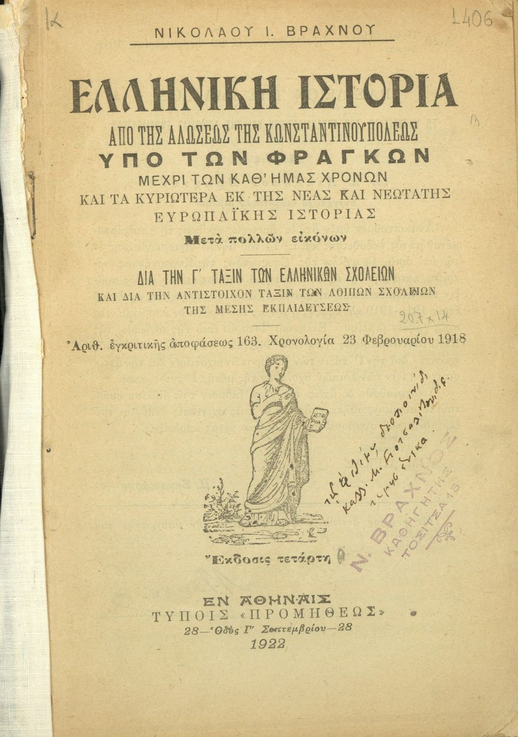 Κωδικός αναγνώρισης: 20-01406 Τίτλος: Ελληνική ιστορία από των χρόνων της Αχαϊκής συμπολιτείας μέχρι της Αλώσεως της Κωνσταντινούπολης υπό των Φράγκων μέχρι των καθ'ημάς χρόνων και τα κυριωτέρα εκ της νέας και νεωτάτης ευρωπαϊκής ιστορίας διά την Γ΄ τάξιν των Ελληνικών Σχολείων Συγγραφέας: Νικόλαος Ι. Βραχνός Μέγεθος και υπόστρωμα: Σχολικό εγχειρίδιο, 20εκ., μαλακό εξώφυλλο, 162 σελίδες. Σκίτσα (ασπρόμαυρα). |