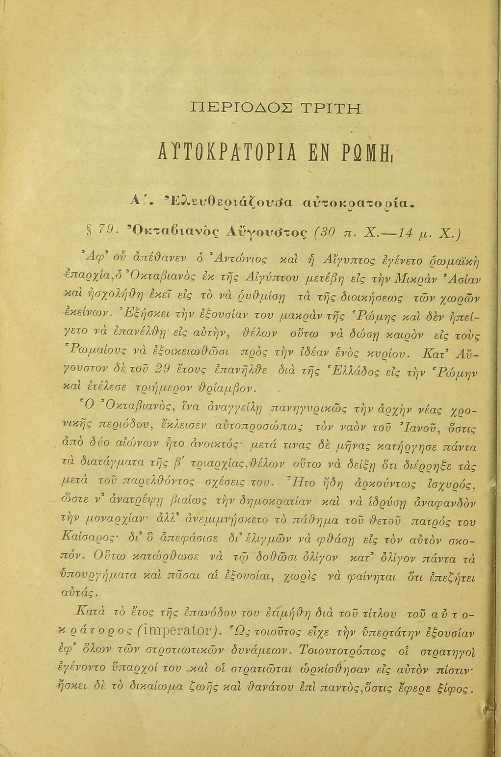 Βαθμίδα εκπαίδευσης: Δευτεροβάθμια Τάξη: Γυμνάσιο Μάθημα: Ιστορία Γλώσσα: Καθαρεύουσα Παρουσίαση περιεχομένου: Μαθητικό βοήθημα Ιστορίας Γυμνασίου που καλύπτει το διάστημα από τη ίδρυση της Ρώμης ως την περίοδο του Διοκλητιανού. |