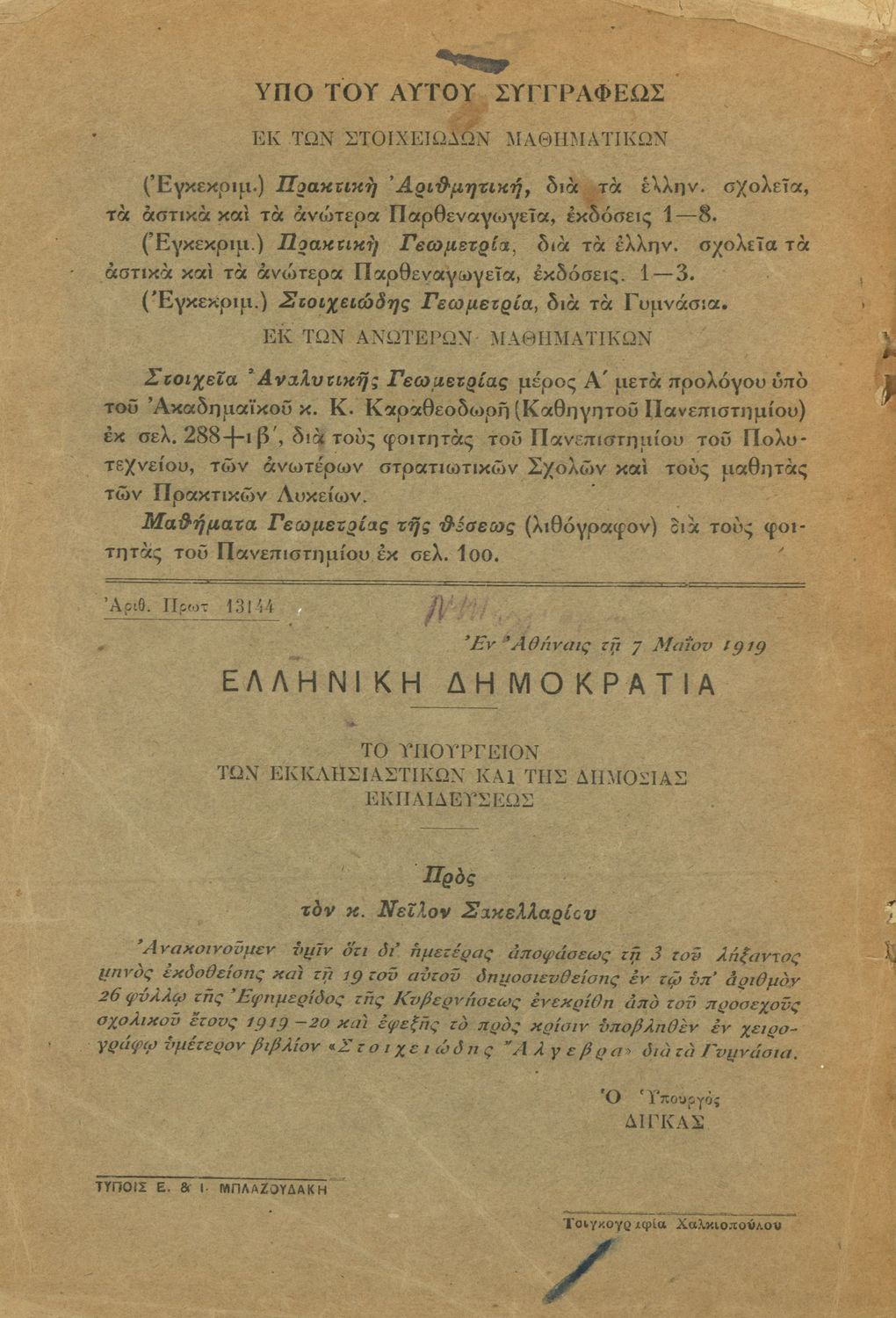 Βαθμίδα εκπαίδευσης: Δευτεροβάθμια Μάθημα: Άλγεβρα Γλώσσα: Καθαρεύουσα Παρουσίαση περιεχομένου: Σχολικό εγχειρίδιο Άλγεβρας που εστιάζει στις αριθμητικές πράξεις πράξεις, τις δυνάμεις, τις αλγεβρικές παραστάσεις, τις συναρτήσεις και πολυώνυμα, τις εξισώσεις πρώτου και δευτέρου βαθμού, τις προόδους και τις πιθανότητες. |