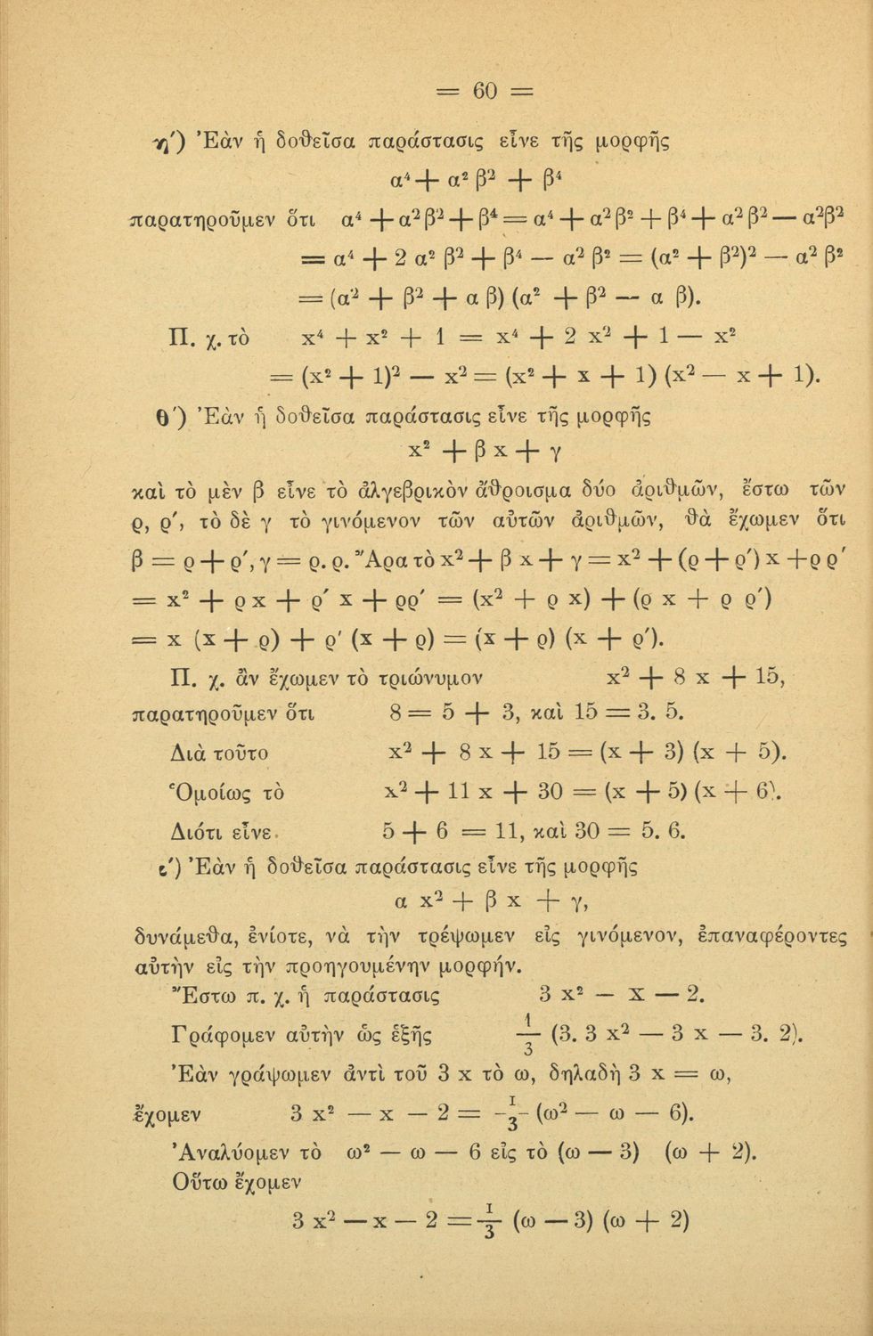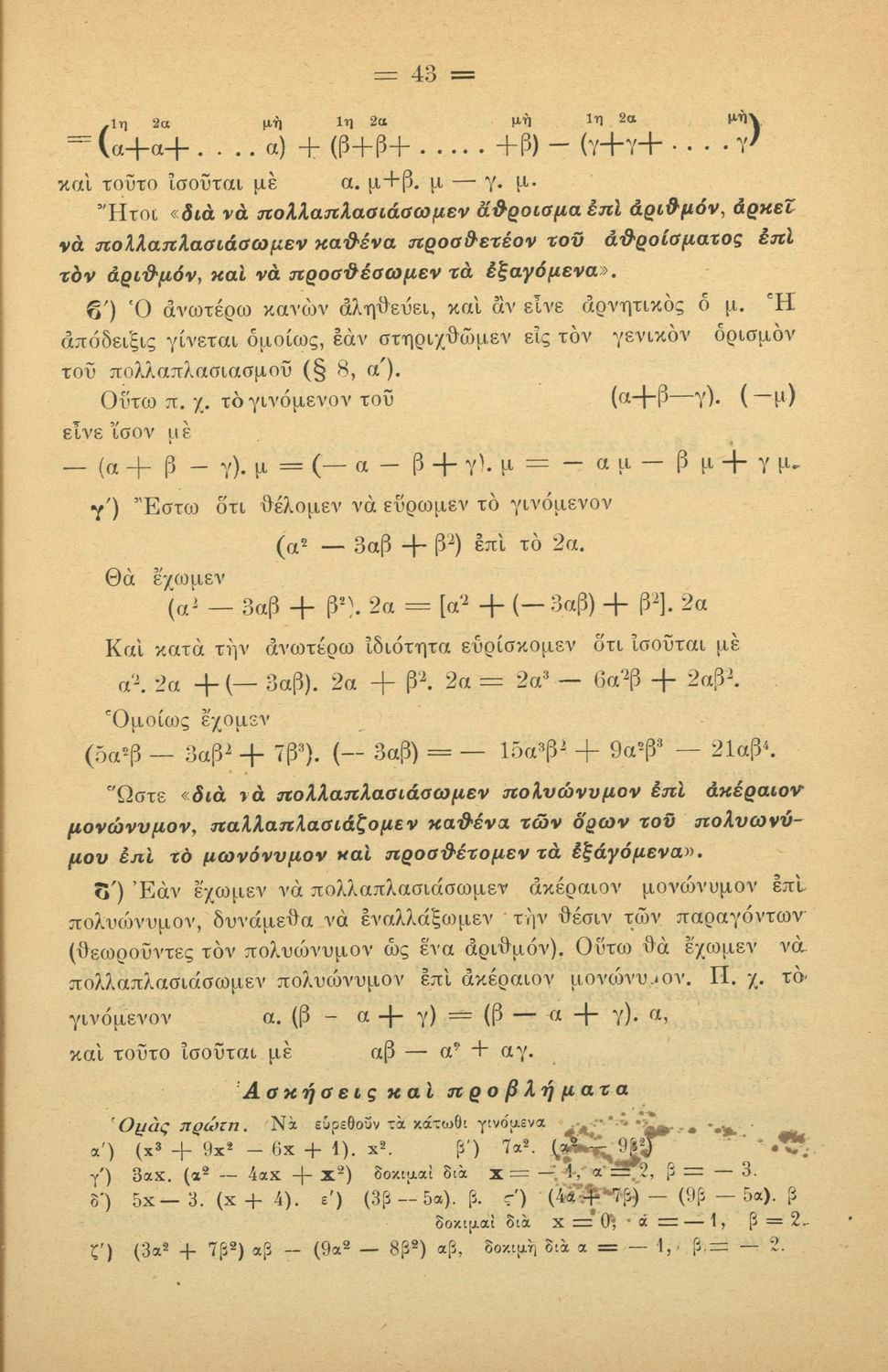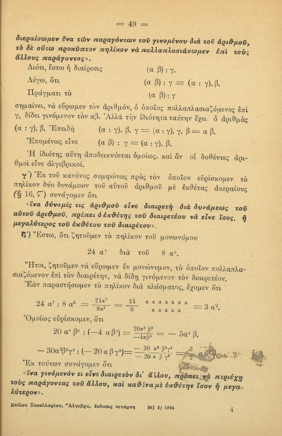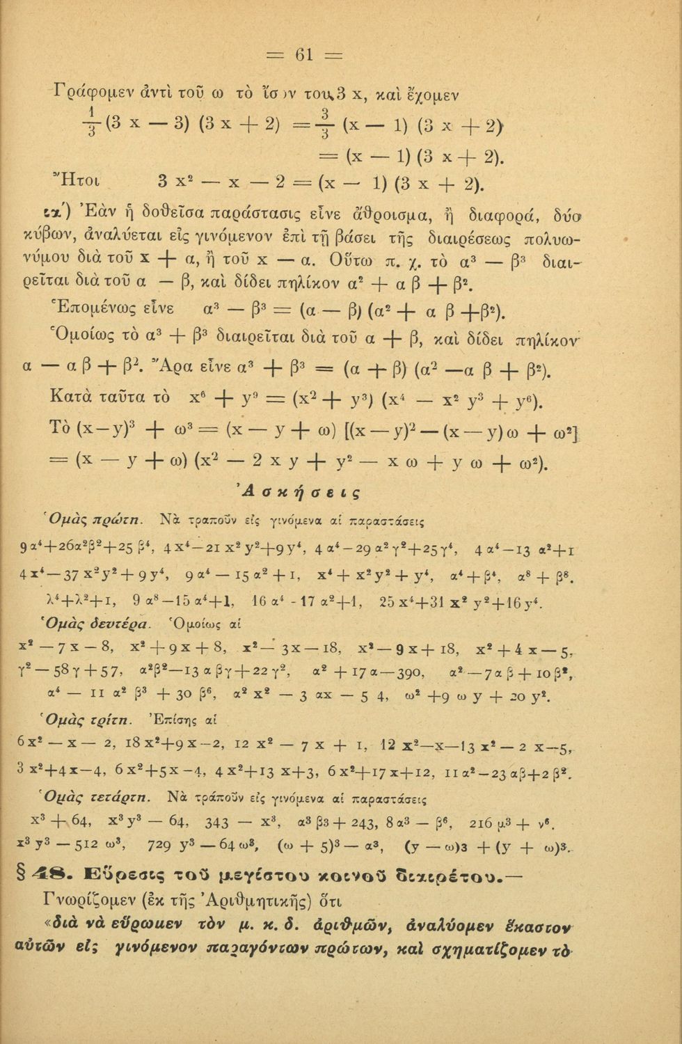 Σχολικό εγχειρίδιο Άλγεβρας για τα Γυμνάσια χωρισμένο σε θεωρία και ασκήσεις. Ο συγγραφέας ήταν καθηγητής στο Πανεπιστήμιο Αθηνών.