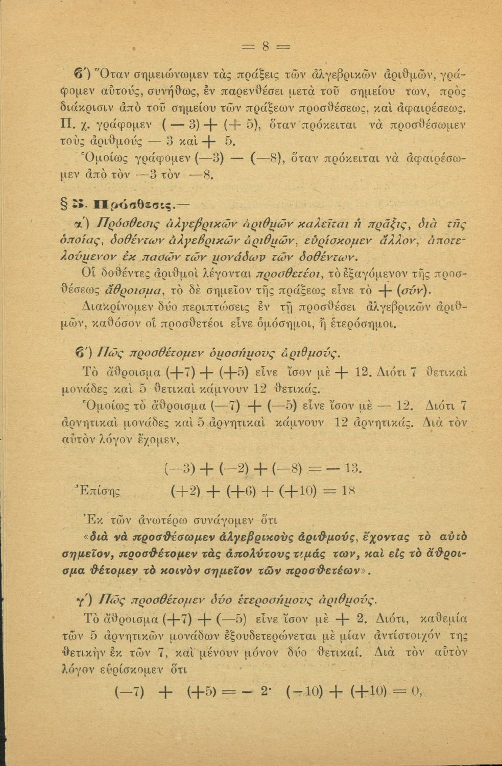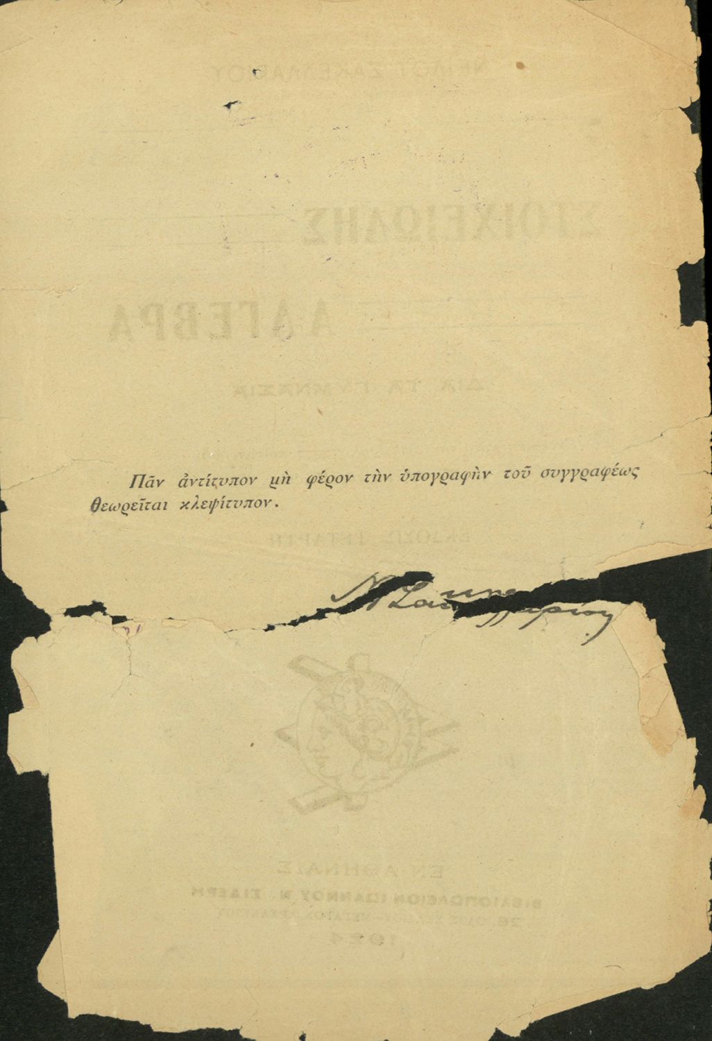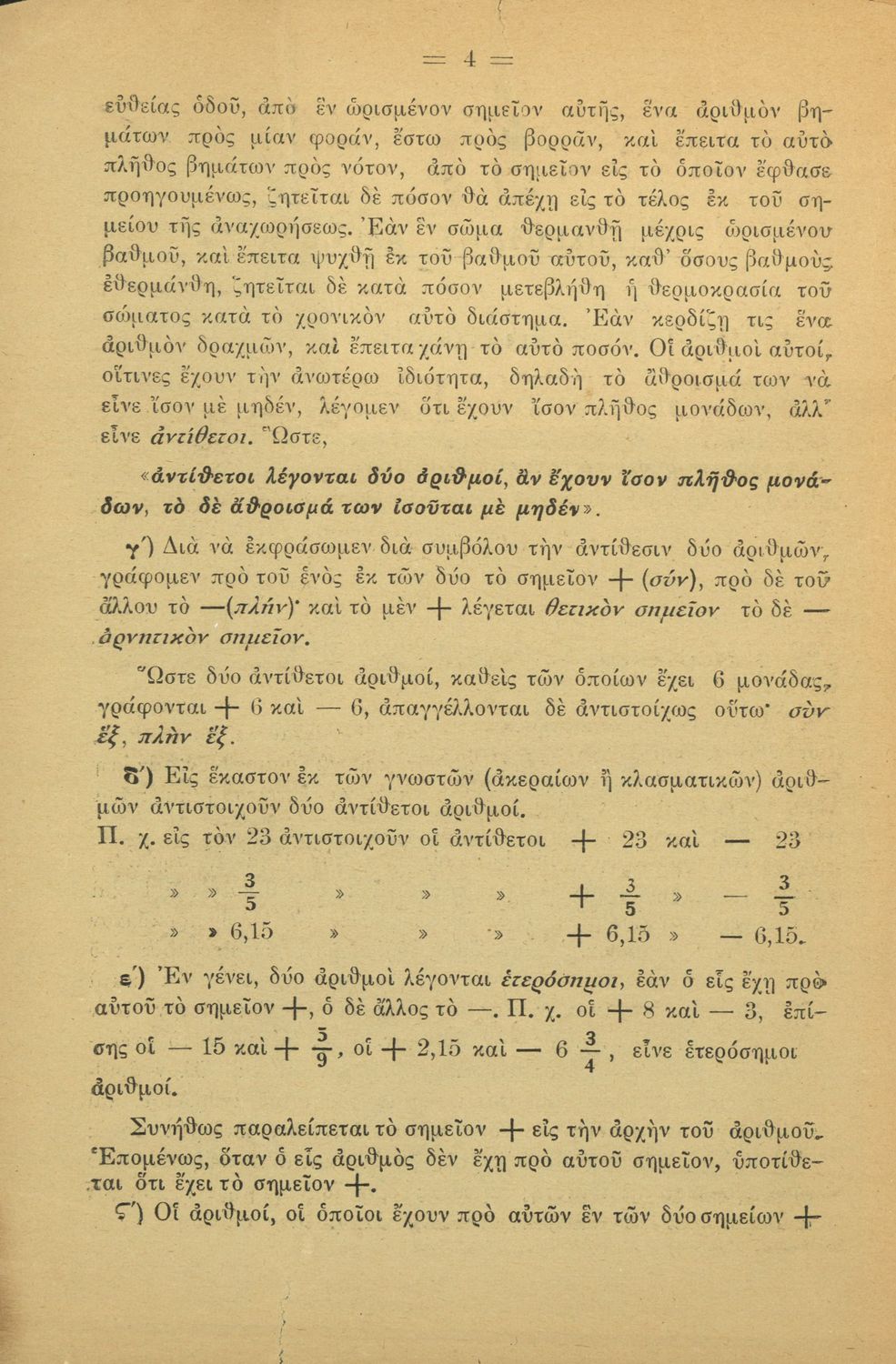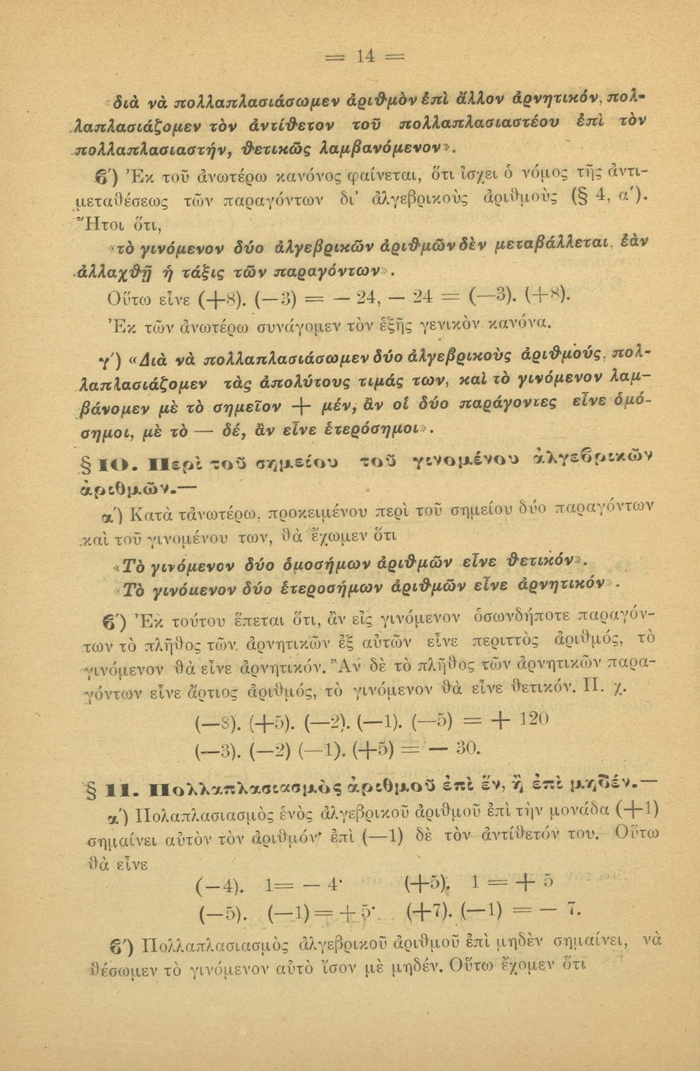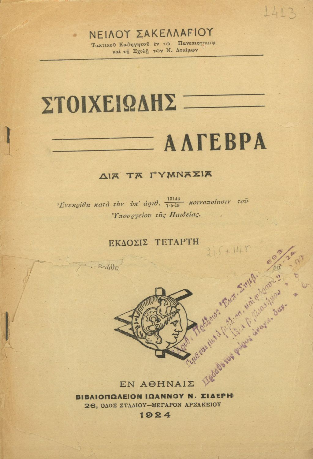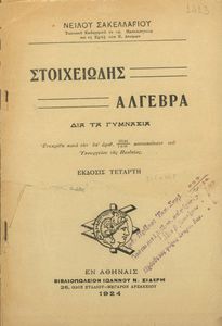 Βαθμίδα εκπαίδευσης: Δευτεροβάθμια Μάθημα: Άλγεβρα Γλώσσα: Καθαρεύουσα Παρουσίαση περιεχομένου: Σχολικό εγχειρίδιο Άλγεβρας που εστιάζει στις αριθμητικές πράξεις πράξεις, τις δυνάμεις, τις αλγεβρικές παραστάσεις, τις συναρτήσεις και πολυώνυμα, τις εξισώσεις πρώτου και δευτέρου βαθμού, τις προόδους και τις πιθανότητες. |