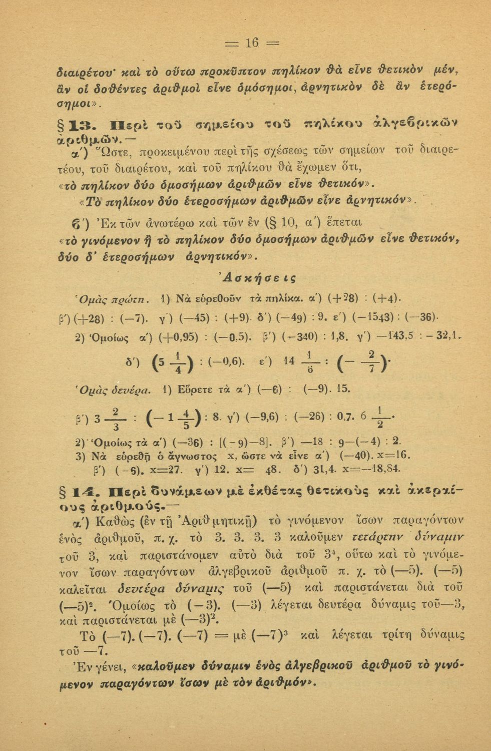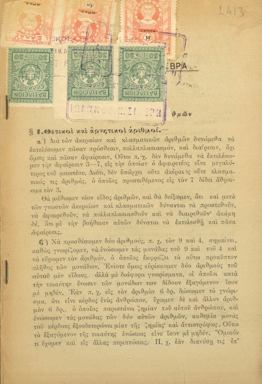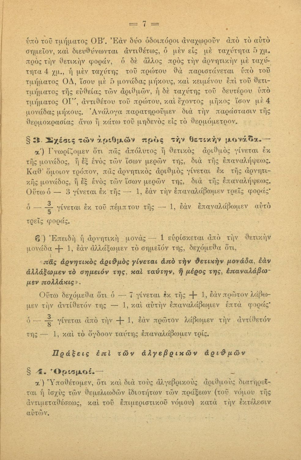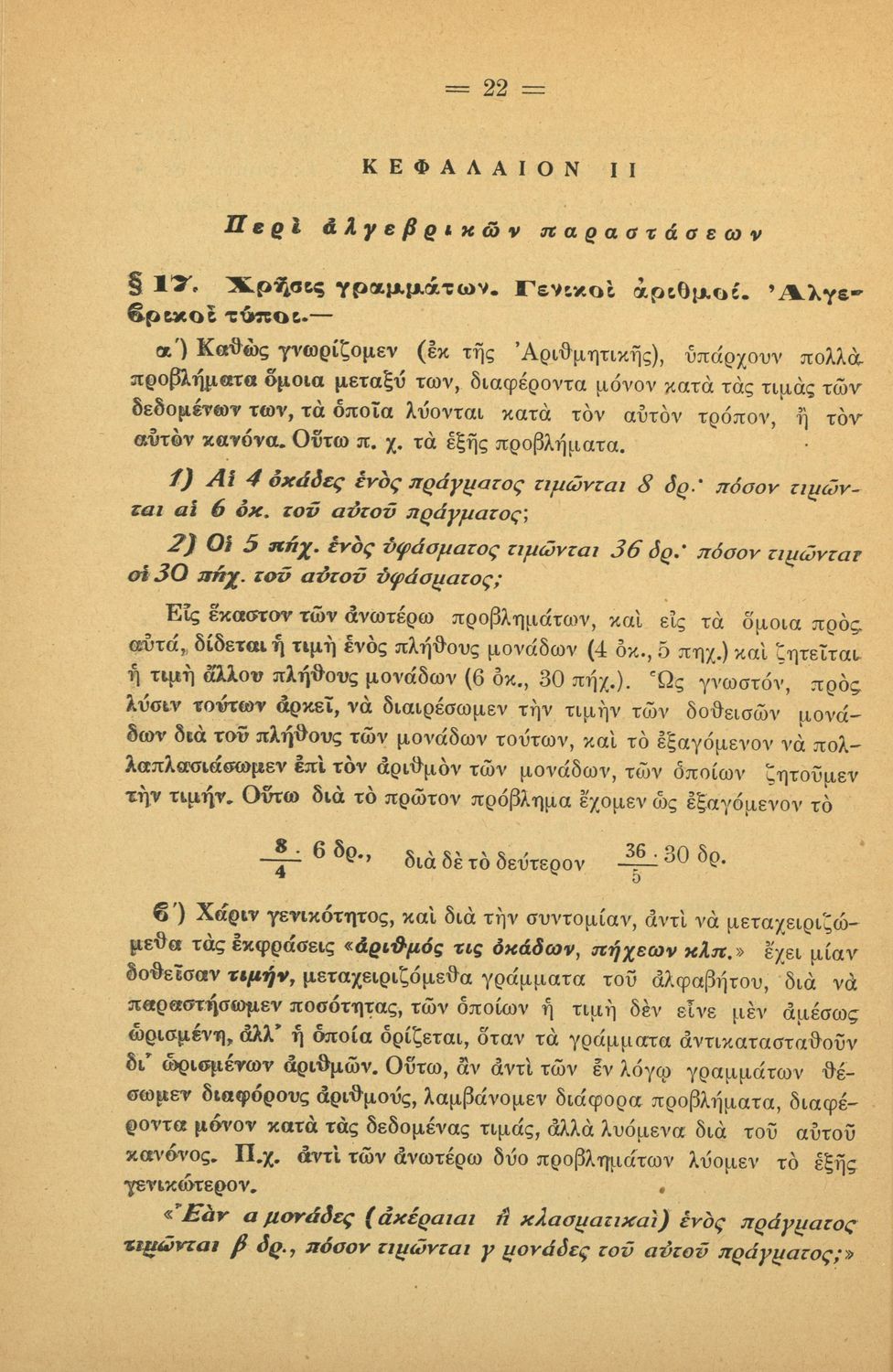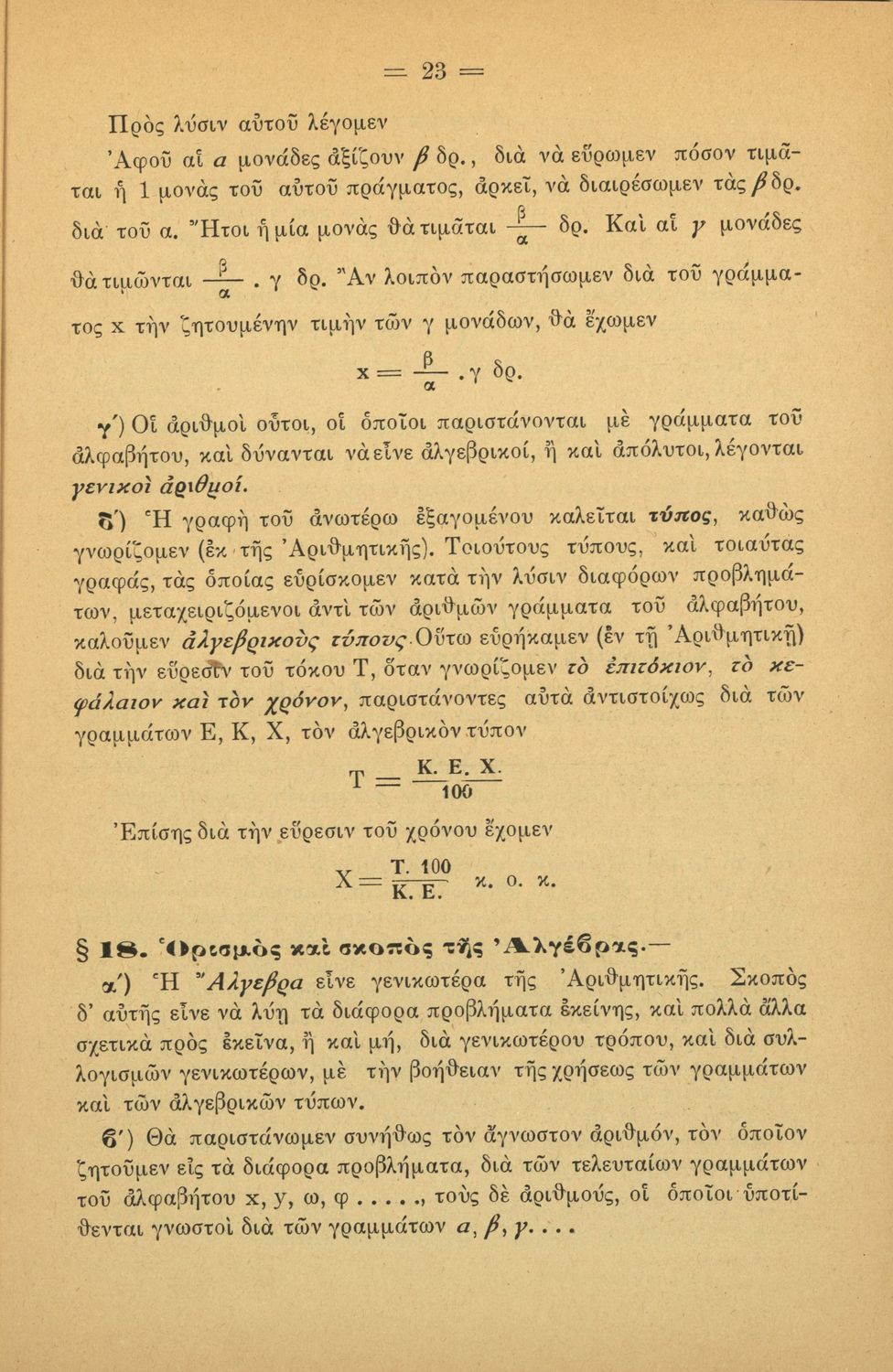 Βαθμίδα εκπαίδευσης: Δευτεροβάθμια Μάθημα: Άλγεβρα Γλώσσα: Καθαρεύουσα Παρουσίαση περιεχομένου: Σχολικό εγχειρίδιο Άλγεβρας που εστιάζει στις αριθμητικές πράξεις πράξεις, τις δυνάμεις, τις αλγεβρικές παραστάσεις, τις συναρτήσεις και πολυώνυμα, τις εξισώσεις πρώτου και δευτέρου βαθμού, τις προόδους και τις πιθανότητες. |