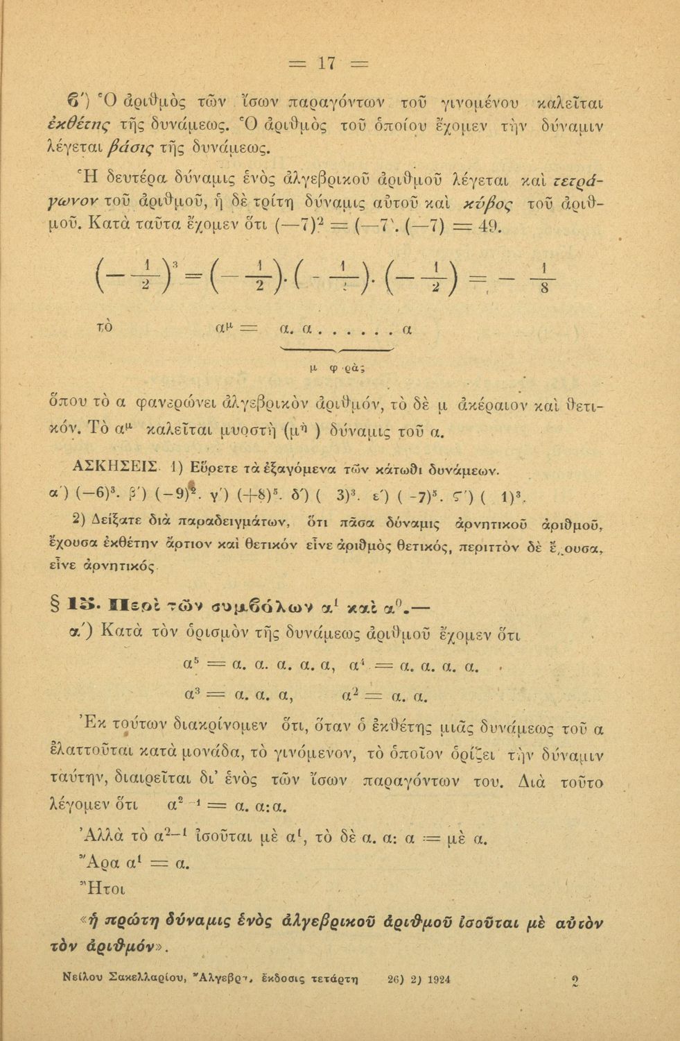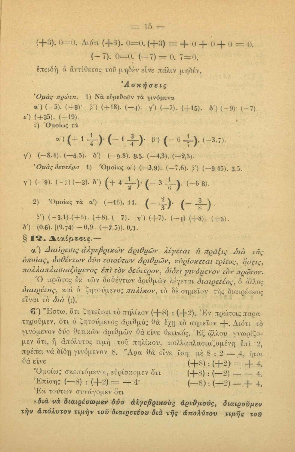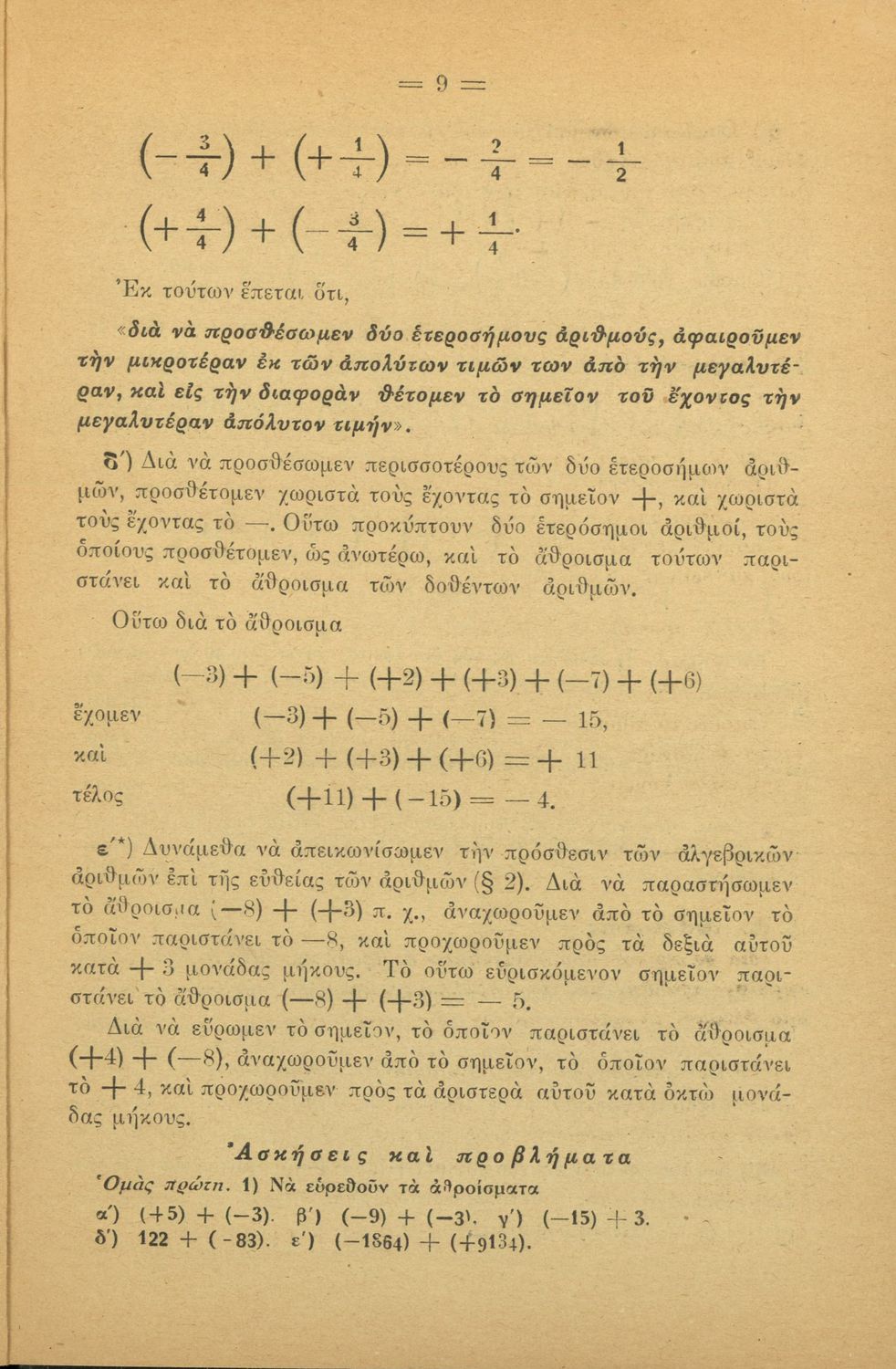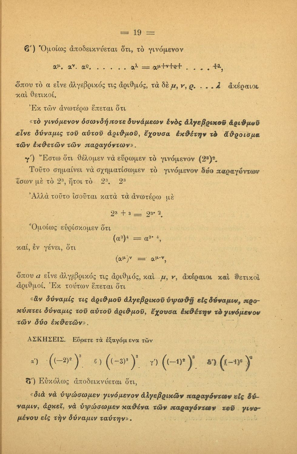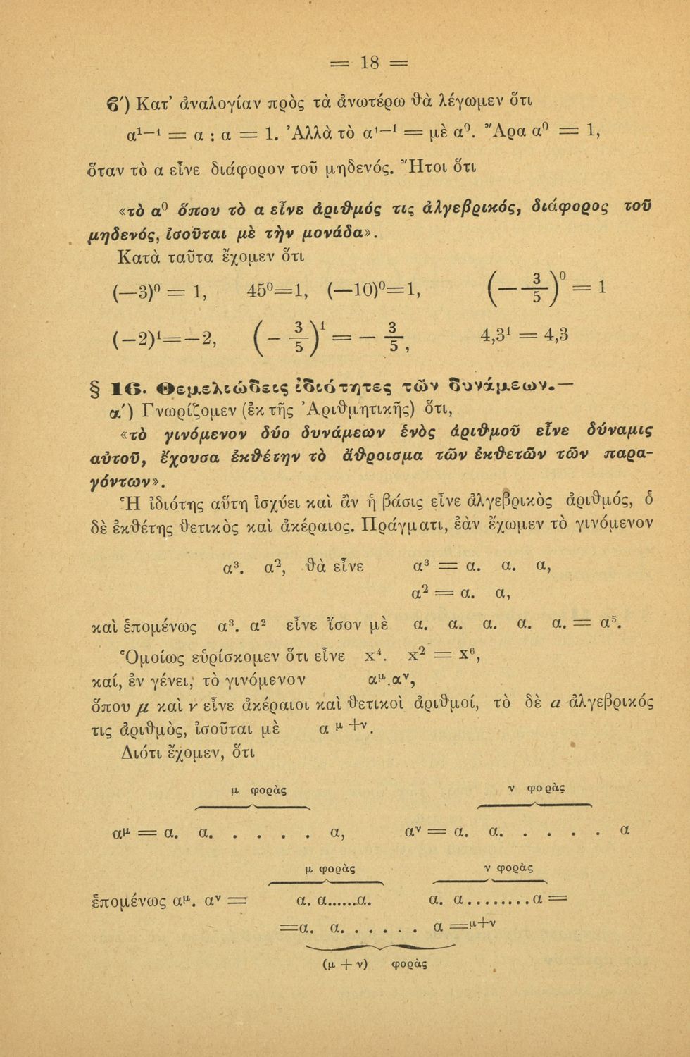 Βαθμίδα εκπαίδευσης: Δευτεροβάθμια Μάθημα: Άλγεβρα Γλώσσα: Καθαρεύουσα Παρουσίαση περιεχομένου: Σχολικό εγχειρίδιο Άλγεβρας που εστιάζει στις αριθμητικές πράξεις πράξεις, τις δυνάμεις, τις αλγεβρικές παραστάσεις, τις συναρτήσεις και πολυώνυμα, τις εξισώσεις πρώτου και δευτέρου βαθμού, τις προόδους και τις πιθανότητες. |
