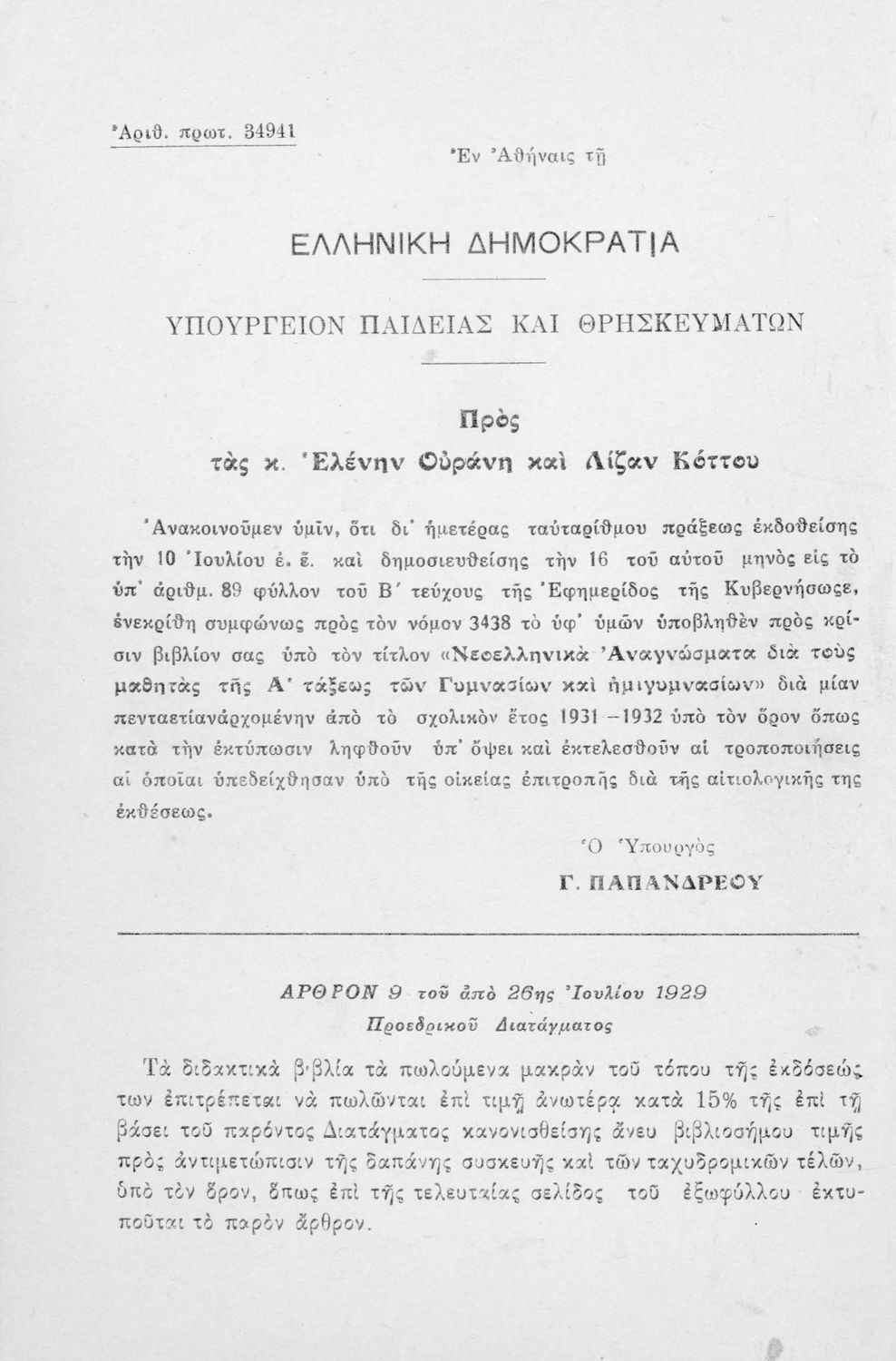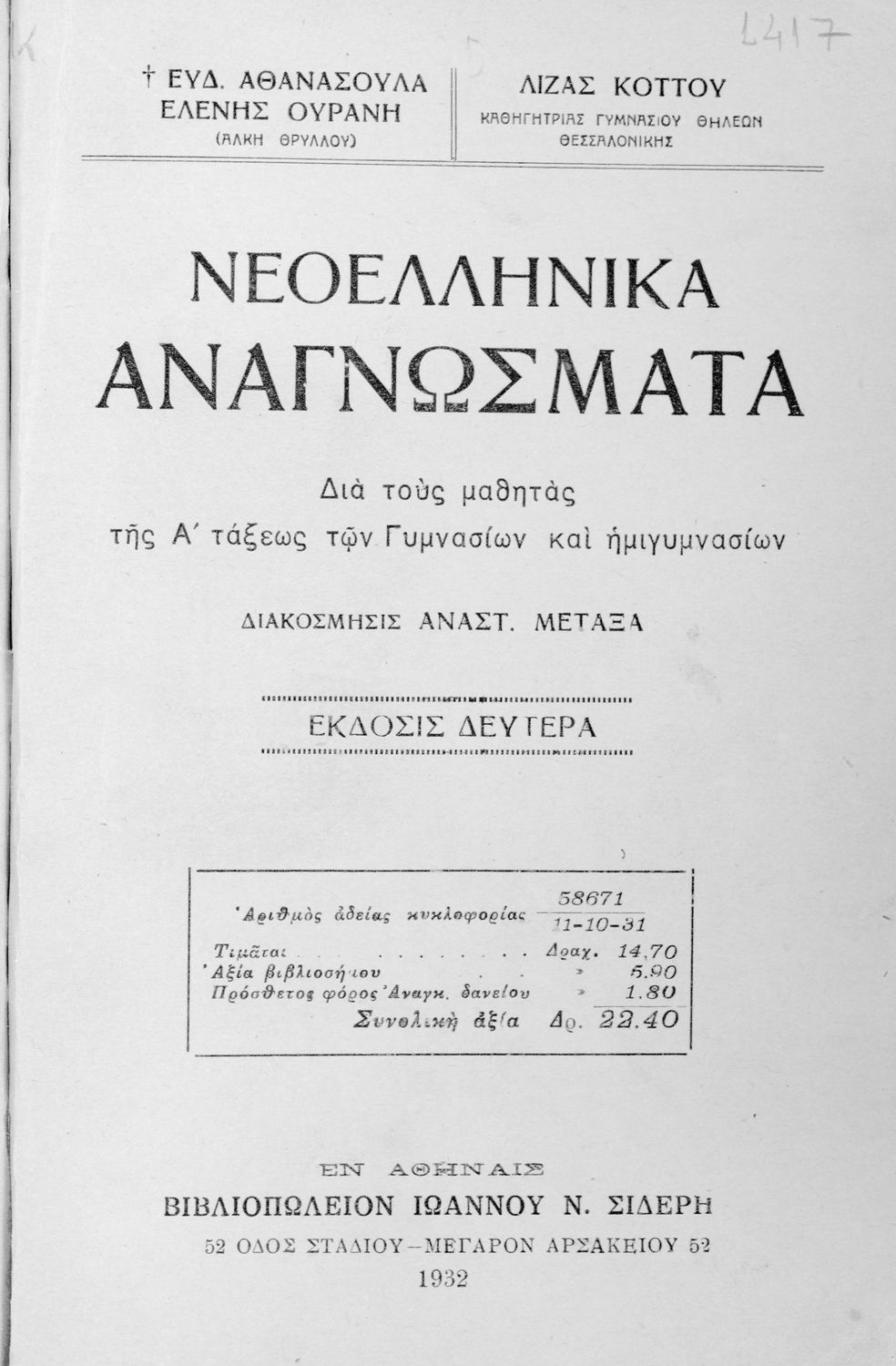 Εκδότης: Ιωάννης Ν. Σιδέρης Έτος έκδοσης: 1932 Τόπος έκδοσης: Αθήνα Έκδοση: 2η Υπουργική απόφαση / Σύμβαση: 58671/11-10-1931 Έτος έγκρισης: 1931 |