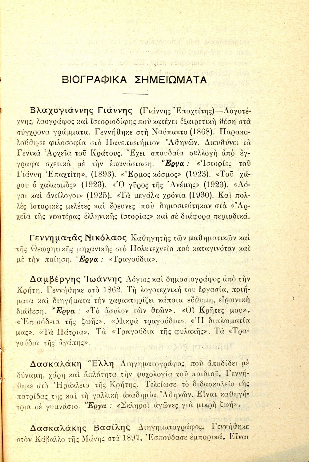 LDR 01584 2200229 4500 035 ## _a20-01418 040 ## _aΚΕΝΕΚ - Εταιρεία Σπουδών Νεοελληνικού Πολιτισμού και Παιδείας 041 ## _ael 100 ## _aΕιρήνη Δημητρακοπούλου _aΜαρία Πολυμενάκου 110 ## _a1418 245 0# _aΝεοελληνικά αναγνώσματα διά τους μαθητάς της Α΄ τάξη των Γυμνασίων και Ημιγυμνασίων 250 ## _a3η Έκδοση 260 ## _aΑθήνα _bΙωάννης Ν. Σιδέρης _c1936 300 ## _a210 _bΣκίτσα (ασπρόμαυρα) _c20 520 ## _aΣχολικό εγχειρίδιο Νέων Ελληνικών Α΄ Γυμνασίου που περιλαμβάνει κείμενα εμπνευσμένα από την αρχαία ελληνική ιστορία και μυθολογία, την σύγχρονη ελληνική ιστορία, τη ζωή στην ύπαιθρο και στην πόλη, και τη θρησκευτική παράδοση. Περιέχει και παράρτημα με βιογραφίες των συγγραφέων και λεξιλόγιο. 521 ## _aΑ' Γυμνασίου 522 ## _aΕλλάδα 546 ## _aΚαθαρεύουσα / Δημοτική 563 ## _aΜαλακό Εξώφυλλο 583 ## _a41719/26-8-1933 _c1933 650 #4 _aΙμβριώτη _aΠαλαμάς _aΠαπαδιαμάντης _aΠαπαρρηγόπουλος 700 ## _aΚαστανάκης, Σπαχής