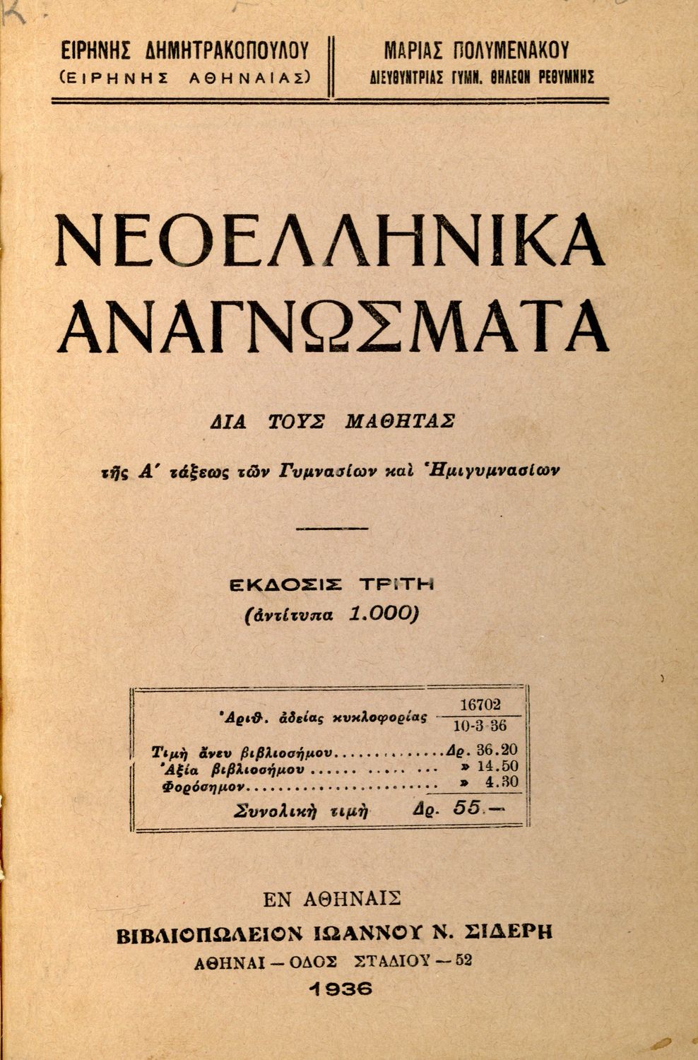 Τίτλος: Νεοελληνικά αναγνώσματα διά τους μαθητάς της Α΄ τάξη των Γυμνασίων και Ημιγυμνασίων