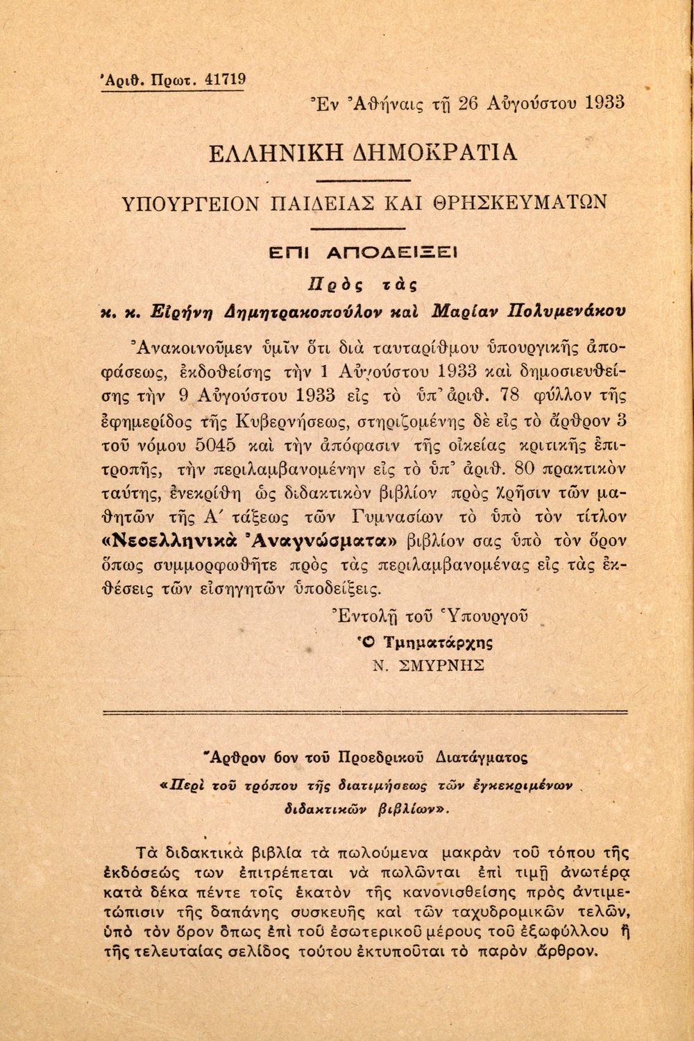 Υπουργική απόφαση / Σύμβαση: 41719/26-8-1933