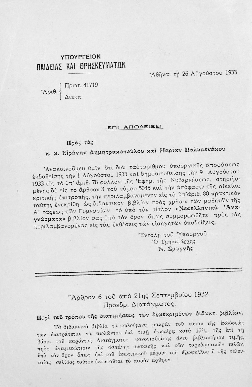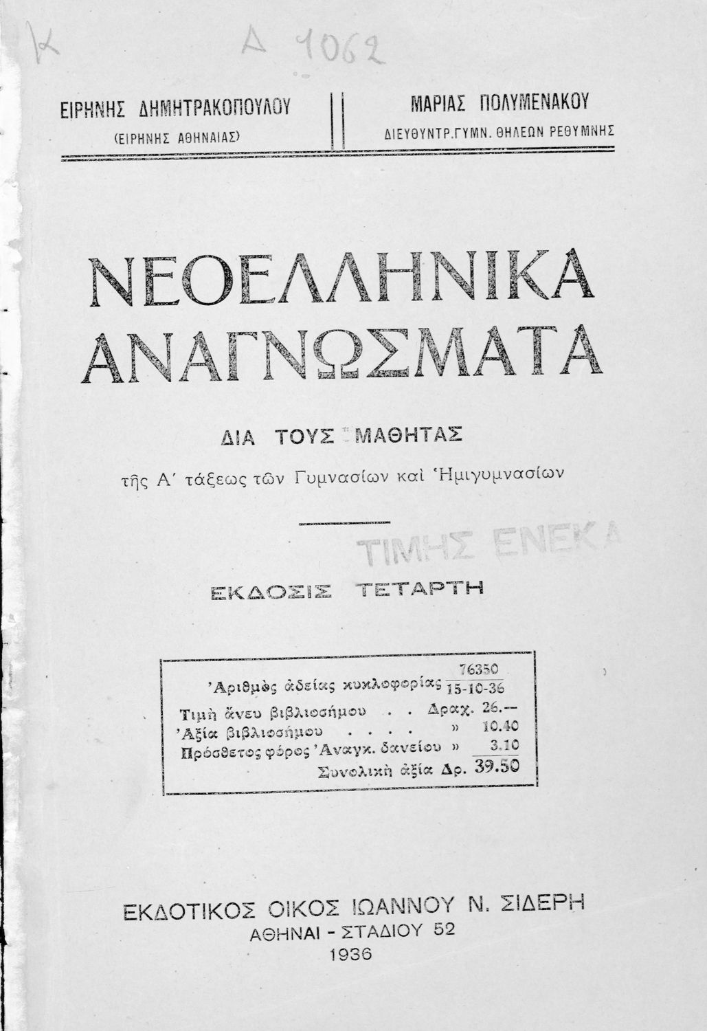 Τίτλος: Νεοελληνικά αναγνώσματα διά τους μαθητάς της Α΄ τάξη των Γυμνασίων και Ημιγυμνασίων