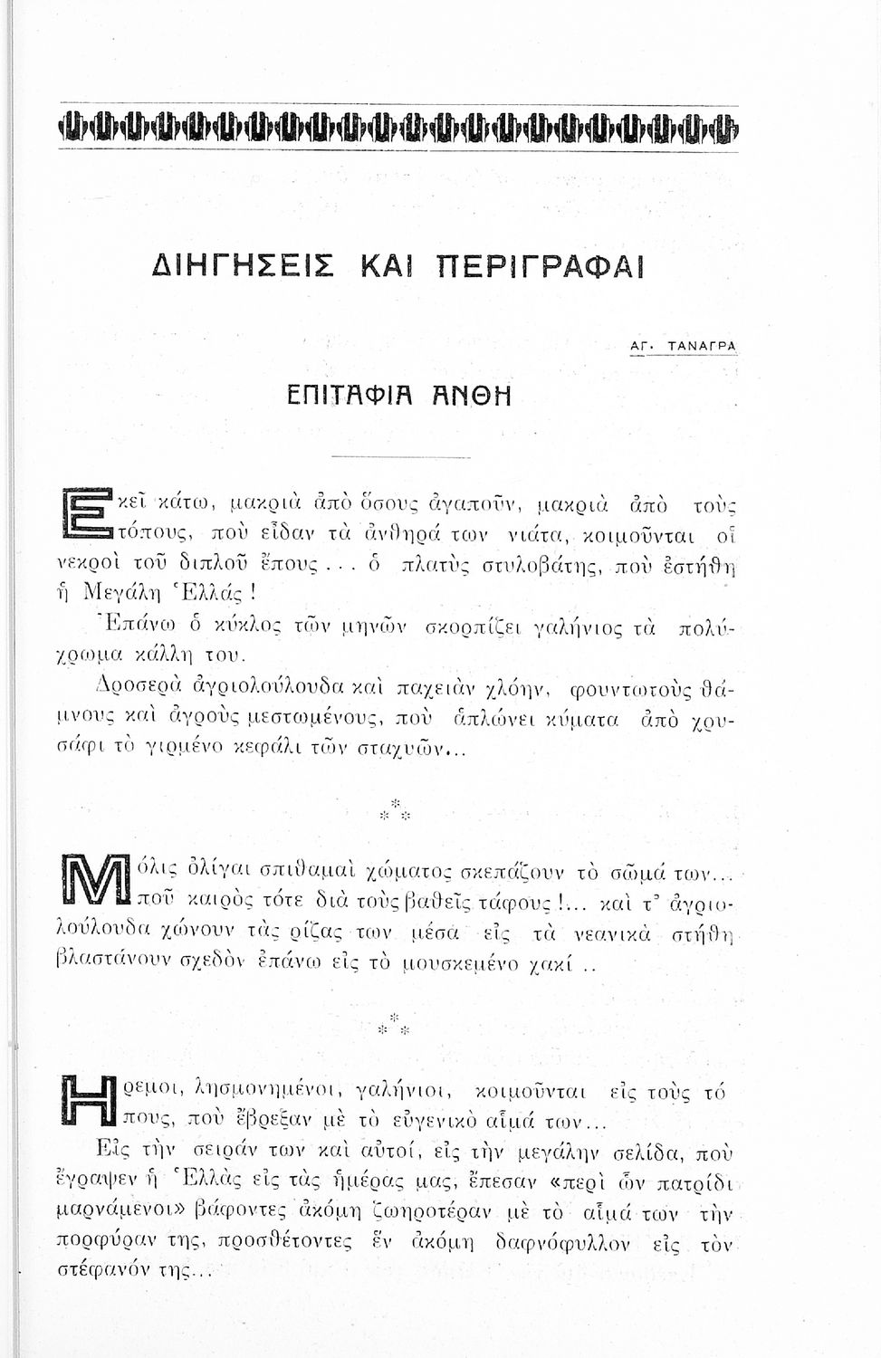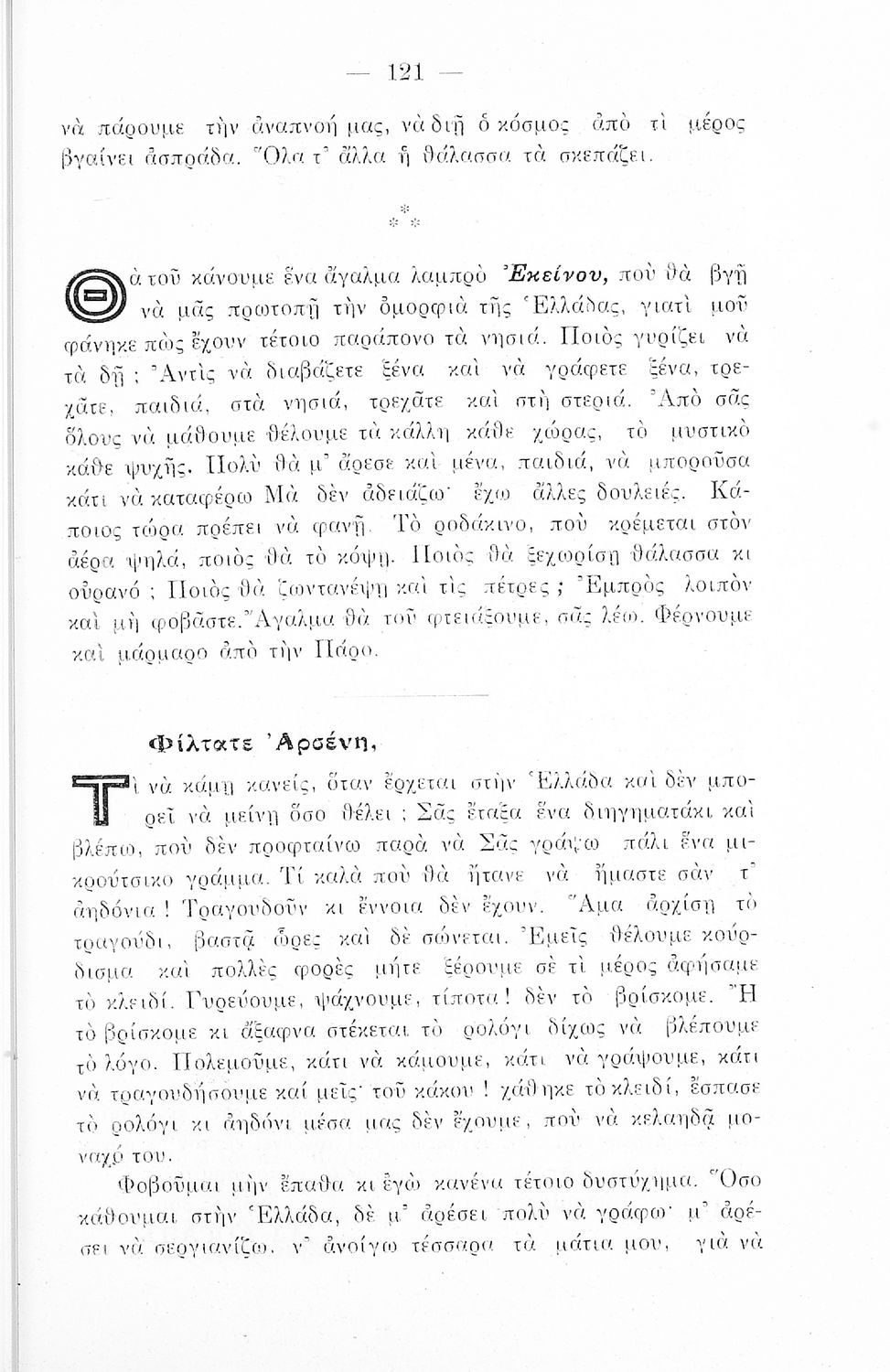 Σχολικό εγχειρίδιο για την Β΄ Γυμνασίου και την Γ΄ Αστικού Θηλέων για το μάθημα των Νέων Ελληνικών. Το εγχειρίδιο αποτελείται από κείμενα πεζού λόγου, επικολυρικά ποιήματα, ωδές, ηθογραφικά διηγήματα, ρητορικά