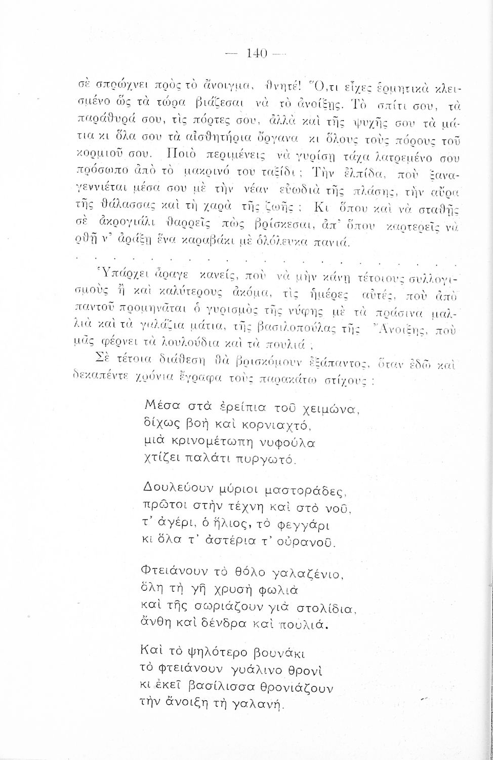 Σχολικό εγχειρίδιο Νέων Ελληνικών Δ' Εξαταξίου Γυμνασίου που περιλαμβάνει ποιήματα και πεζά Ελλήνων συγγραφέων εμπνευσμένα από την οικογενειακή και κοινωνική ζωή, την σύγχρονη ελληνική ιστορία, τη θρησκευτική παράδοση και την ελληνική φύση. Περιέχει και παράρτημα με βιογραφίες των συγγραφέων και λεξιλόγιο.