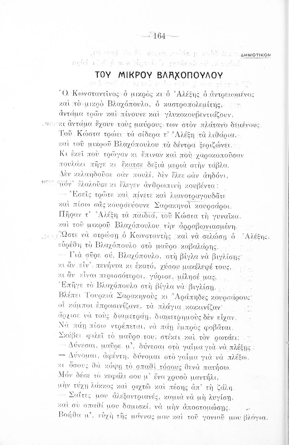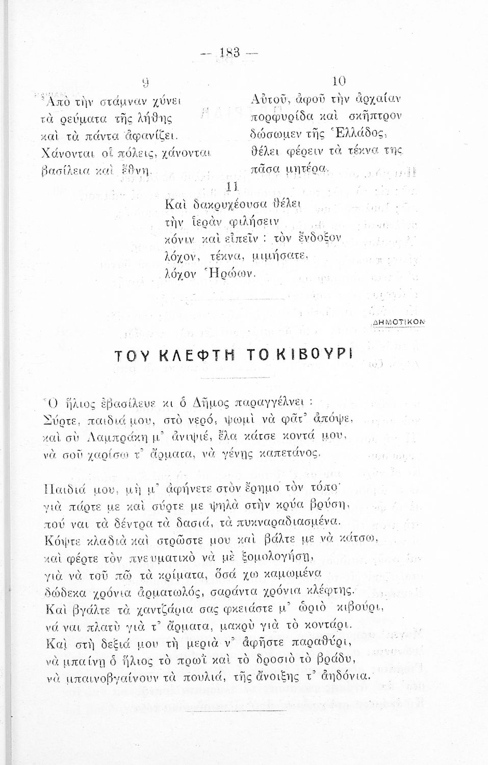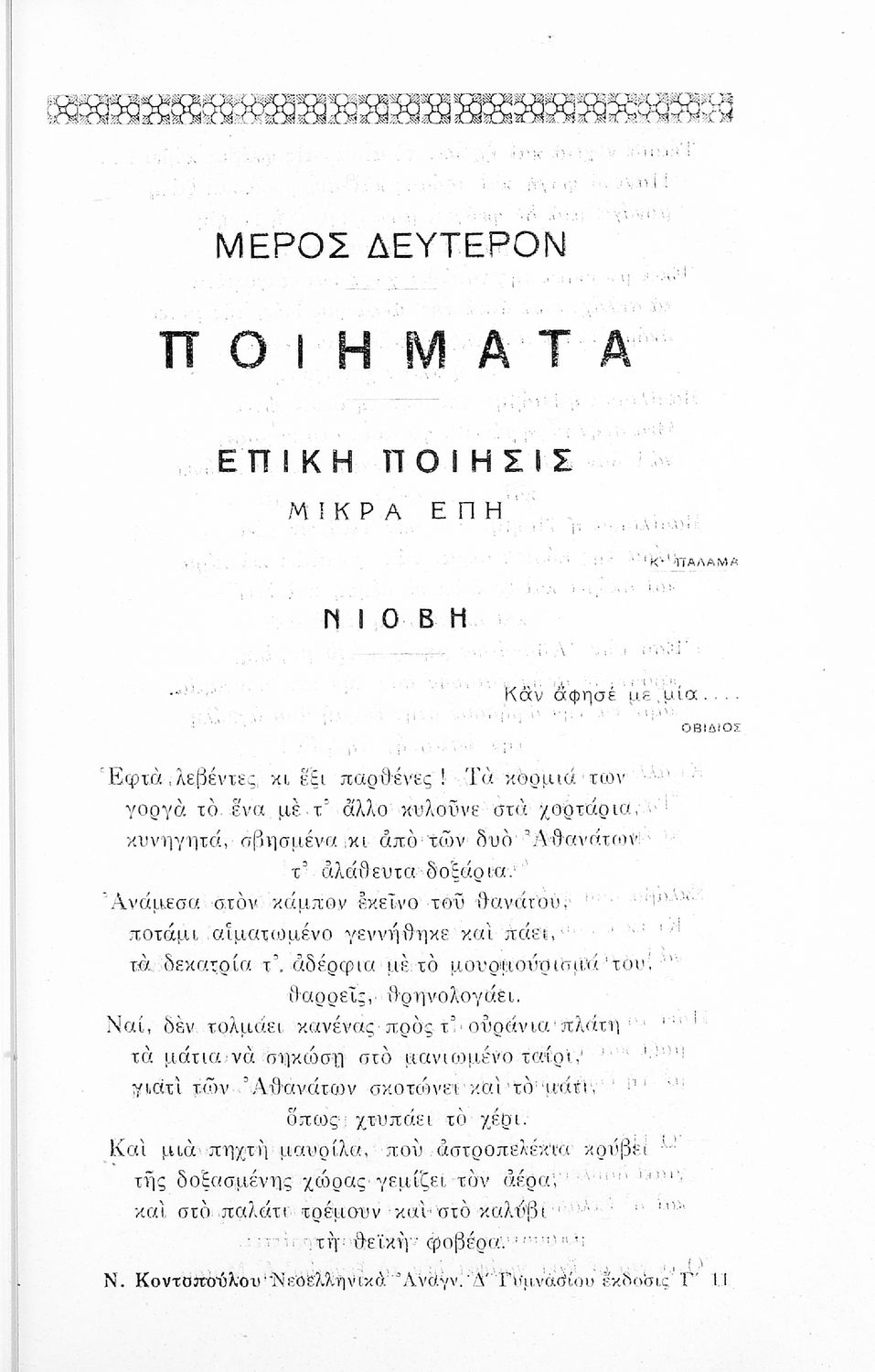 Σχολικό εγχειρίδιο για την Β΄ Γυμνασίου και την Γ΄ Αστικού Θηλέων για το μάθημα των Νέων Ελληνικών. Το εγχειρίδιο αποτελείται από κείμενα πεζού λόγου, επικολυρικά ποιήματα, ωδές, ηθογραφικά διηγήματα, ρητορικά