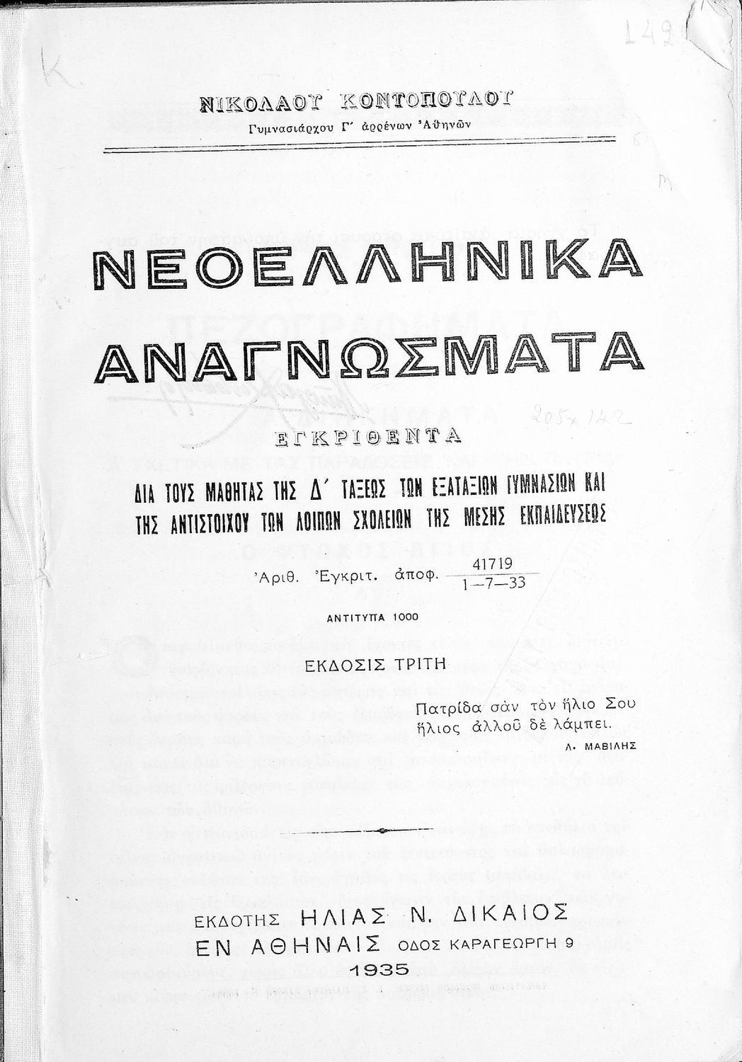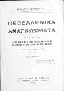Τίτλος: Νεοελληνικά αναγνώσματα εγκριθέντα διά τους μαθητάς της Δ΄ τάξεως των Εξατάξιων Γυμνασίων και της αντιστοίχου των λοιπών σχολείων της Μέσης Εκπαιδεύσεως