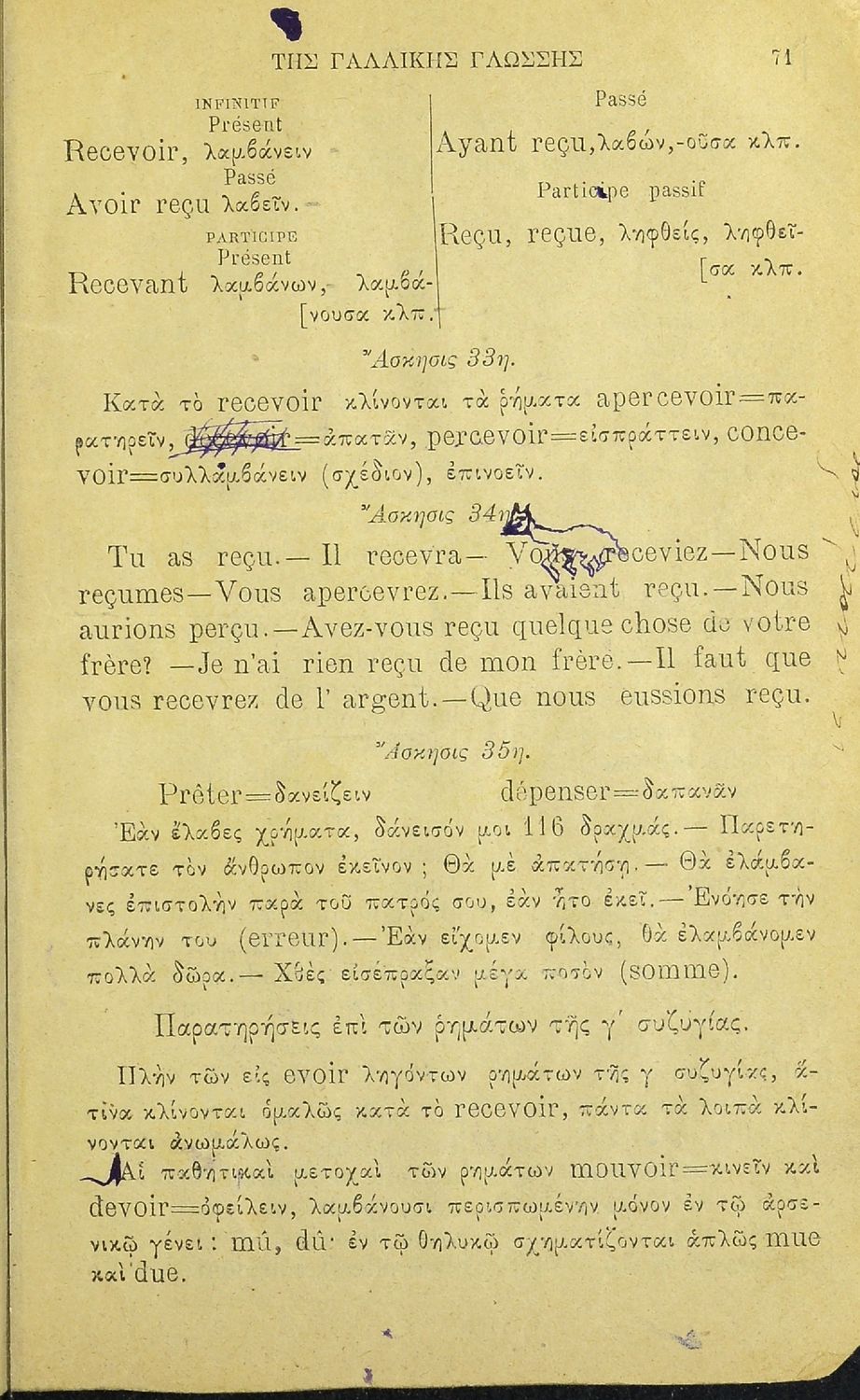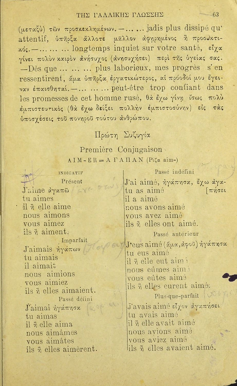 Σχολικό εγχειρίδιο Γαλλικών για τοΕλληνικό Σχολείο, το Αστικό Σχολείο, το Παρθεναγωγείο, το Διδασκαλείο και τις Εμπορικές Σχολές που αποτελείται από κείμενα, γραμματική και συντακτικό της γαλλικής γλώσσας και ...