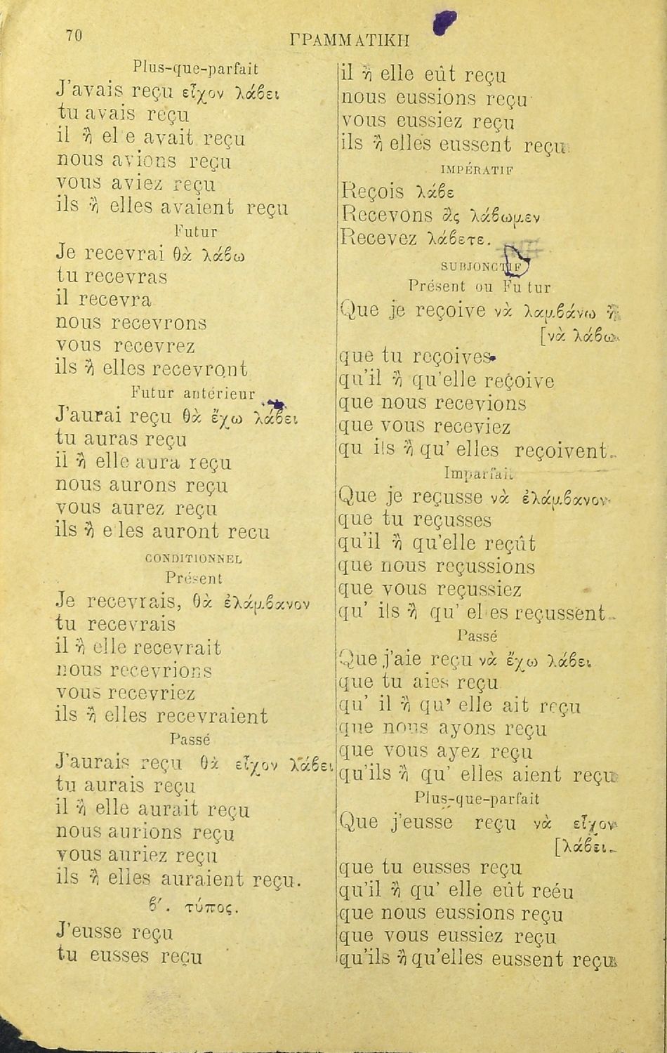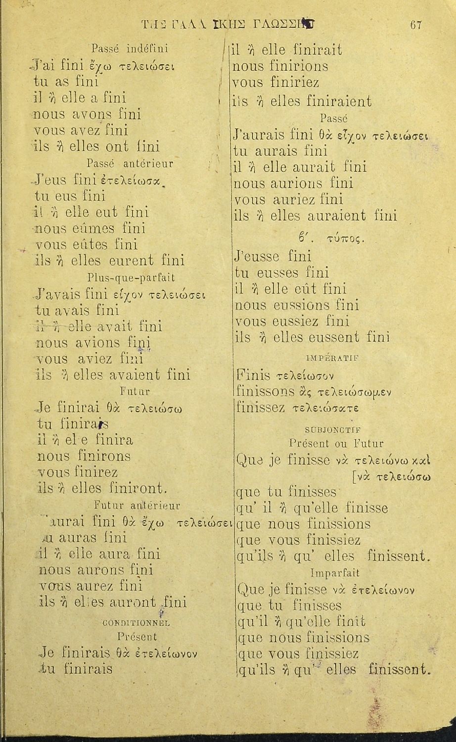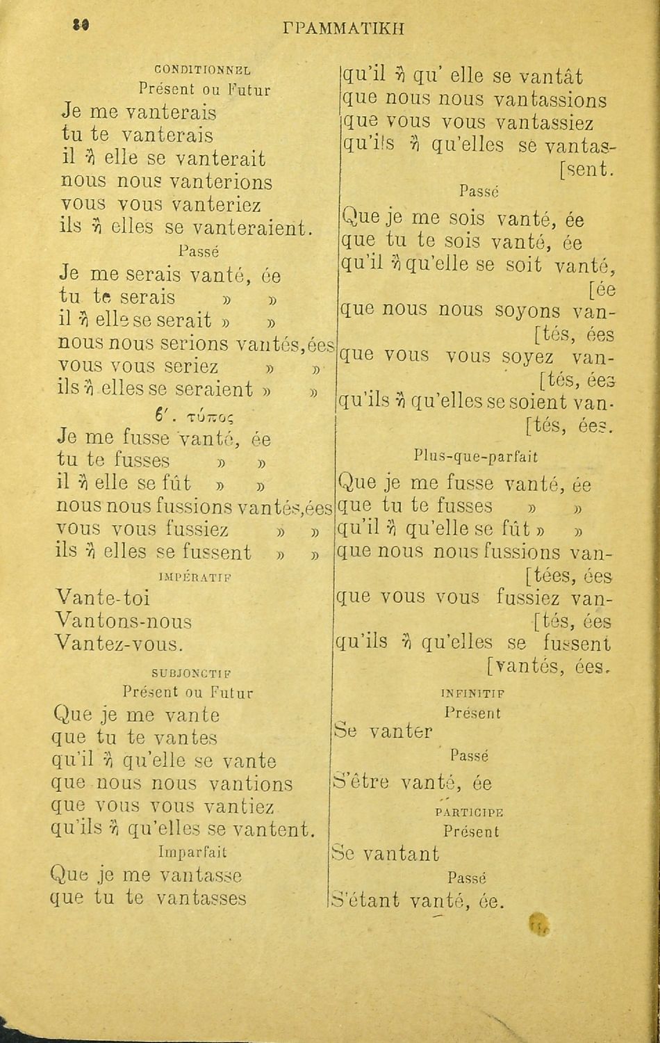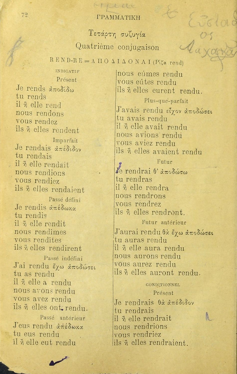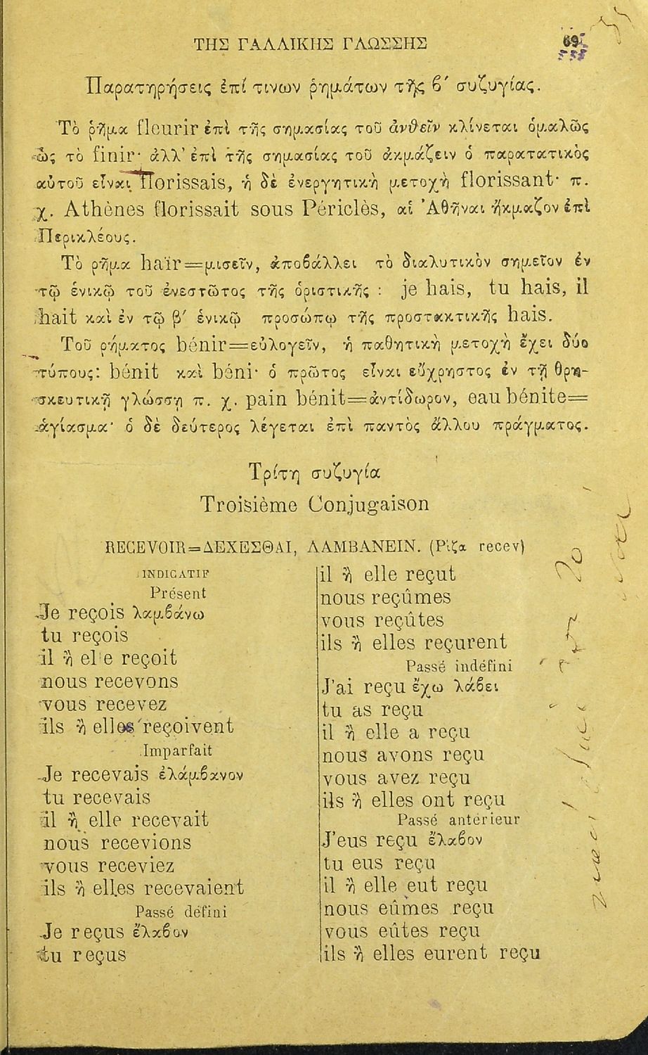 Σχολικό εγχειρίδιο για τα Ελληνικά Σχολεία και Παρθεναγωγεία περιλαμβάνει τους βασικούς κανόνες γραμματικής της γαλλικής γλώσσας.