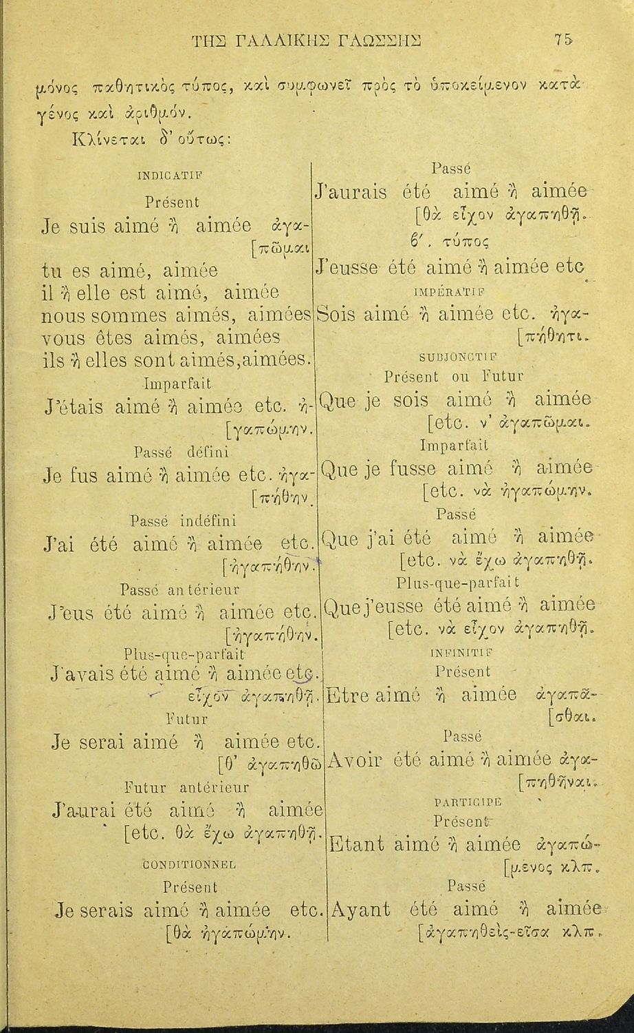 Γραμματική της Γαλλικής γλώσσας για τα Ελληνικά Σχολεία και Παρθεναγωγεία που αναλύει τα μέρη του λόγου και περιέχει παραδείγματα και ασκήσεις.