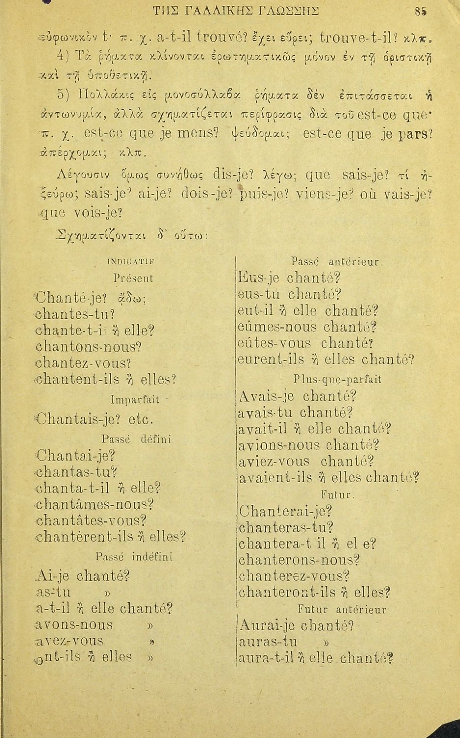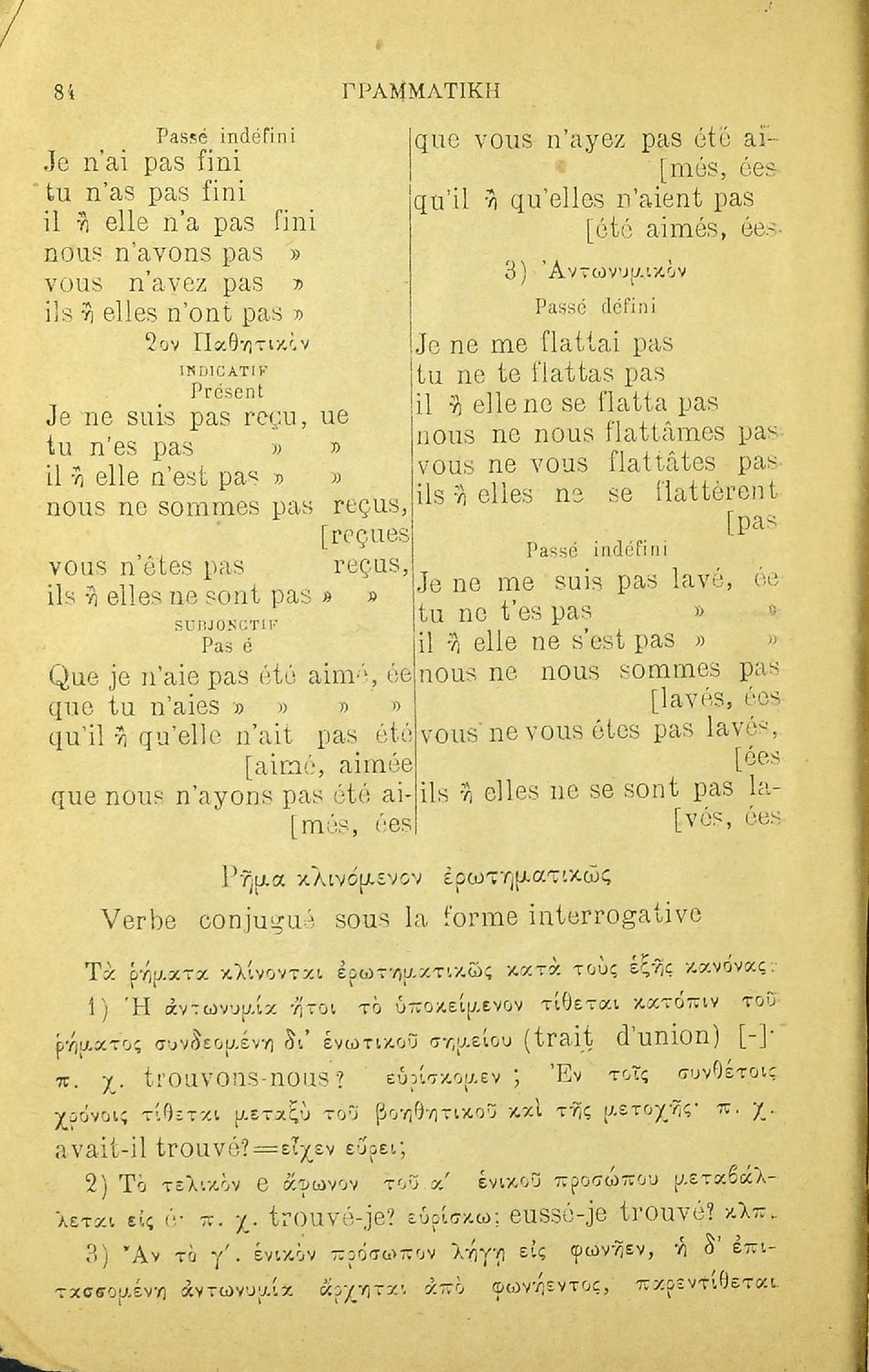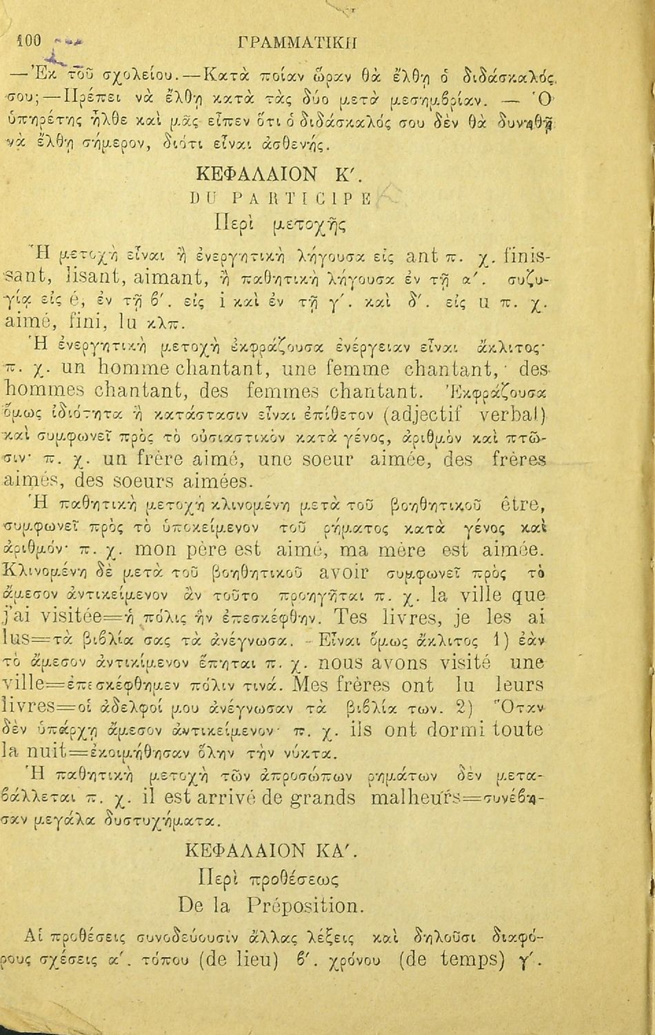Σχολικό εγχειρίδιο για τα Ελληνικά Σχολεία και Παρθεναγωγεία περιλαμβάνει τους βασικούς κανόνες γραμματικής της γαλλικής γλώσσας.