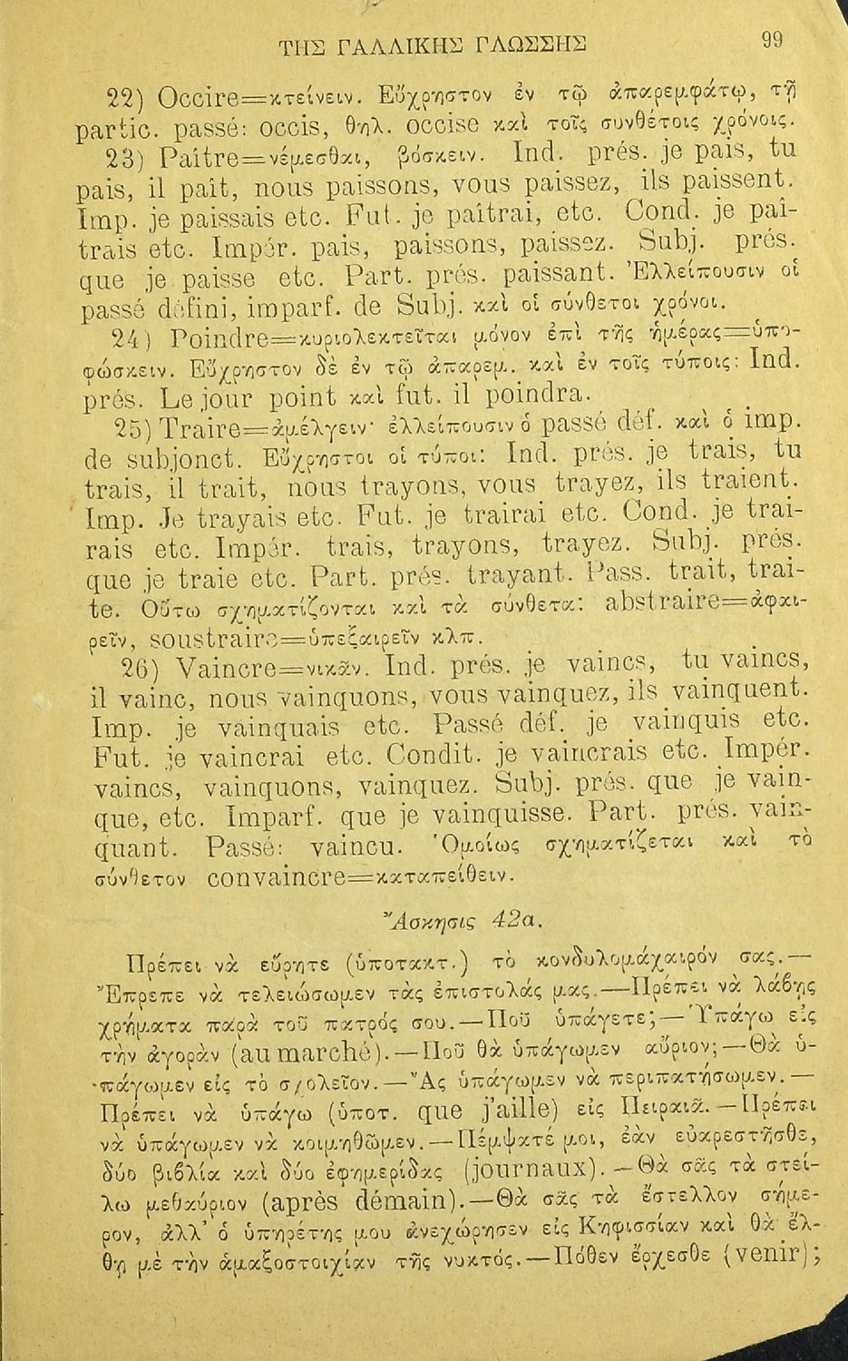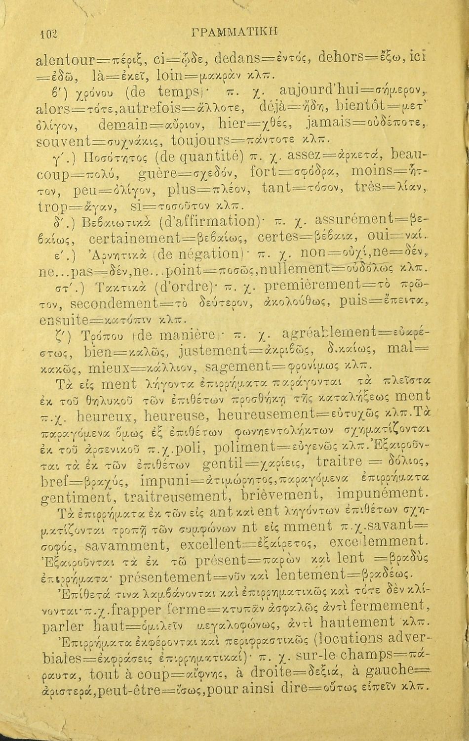 Γραμματική της Γαλλικής γλώσσας για τα Ελληνικά Σχολεία και Παρθεναγωγεία που αναλύει τα μέρη του λόγου και περιέχει παραδείγματα και ασκήσεις.