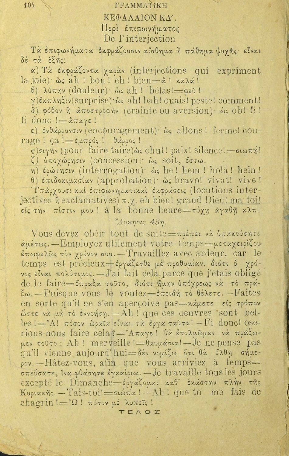 Σχολικό εγχειρίδιο Αρχαίων Ελληνικών για τα Ελληνικά Σχολεία, Παρθεναγωγεία και Γυμνάσια που περιέχει τους κανόνες γραμματικής και είναι χωρισμένο σε φθογγολογικό, τυπολογικό και ετυμολογικό μέρος.