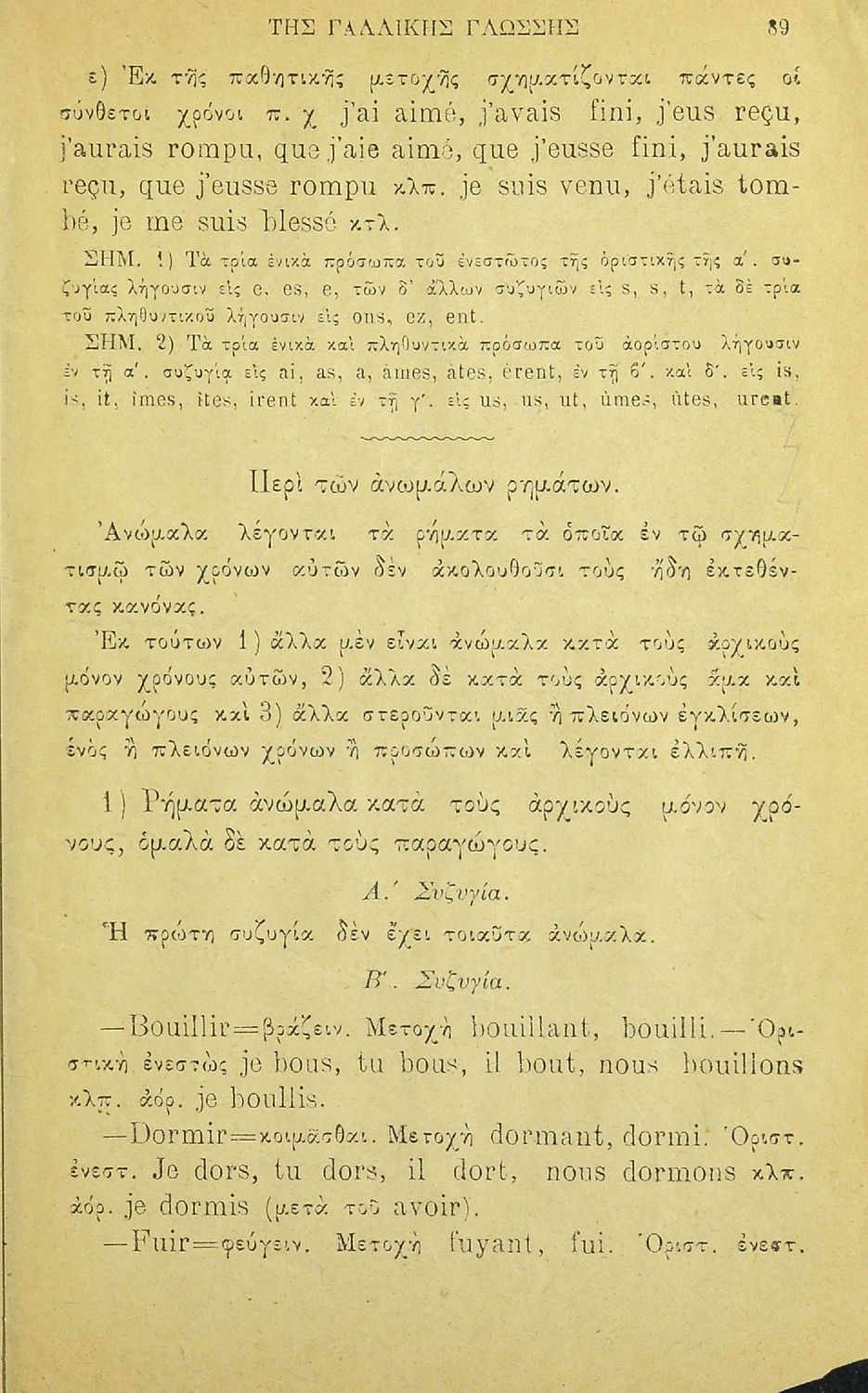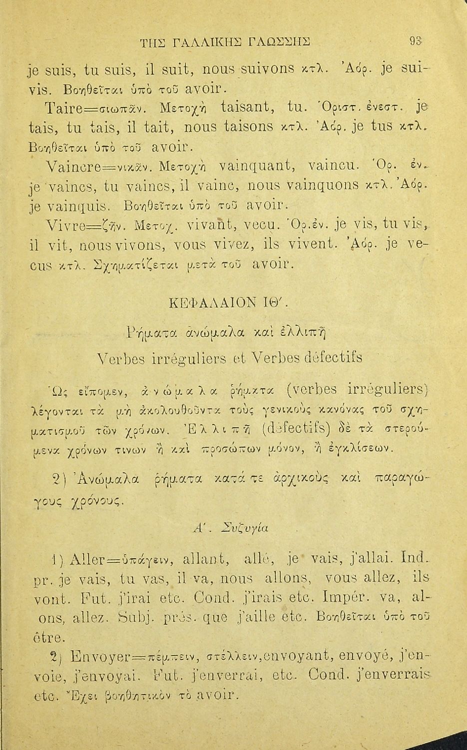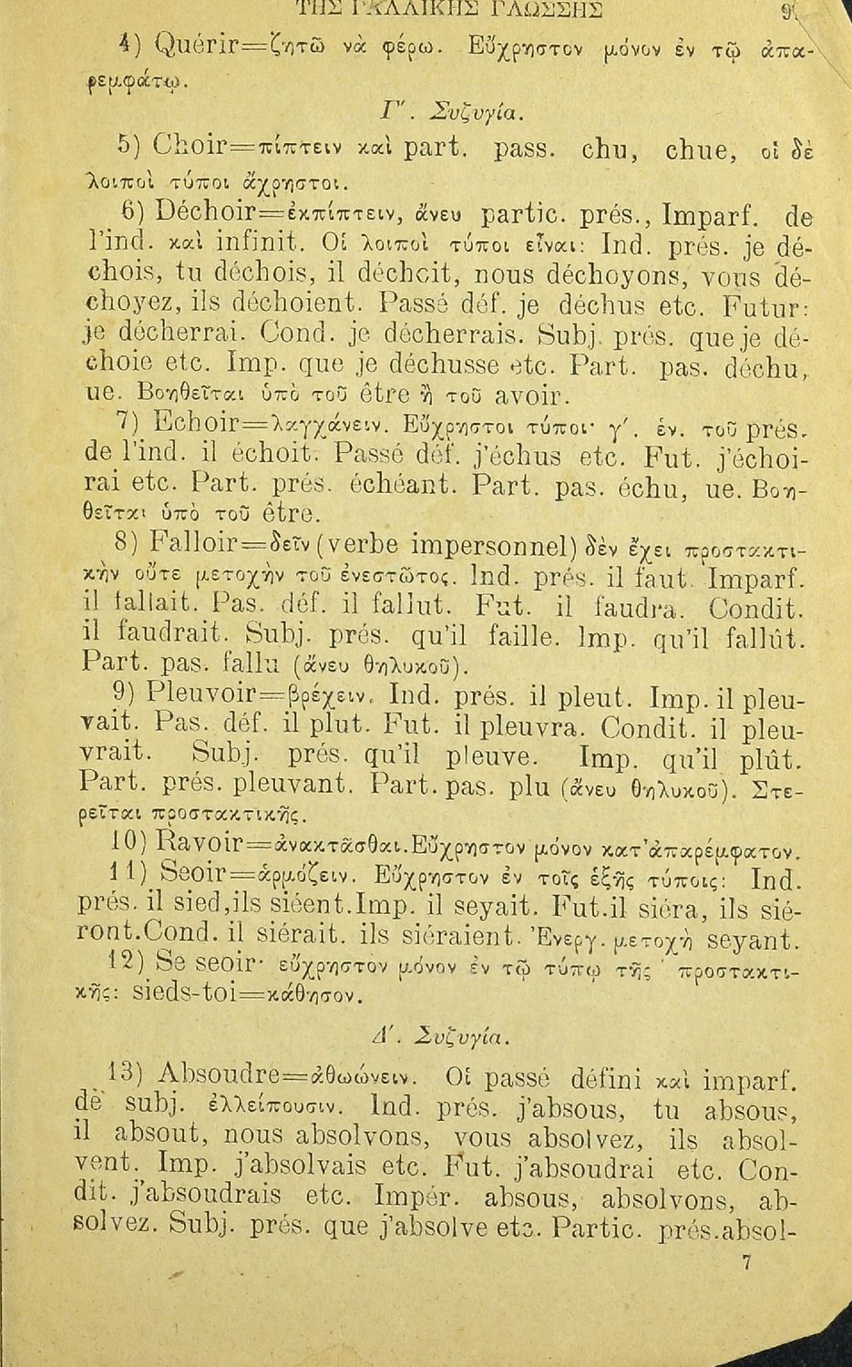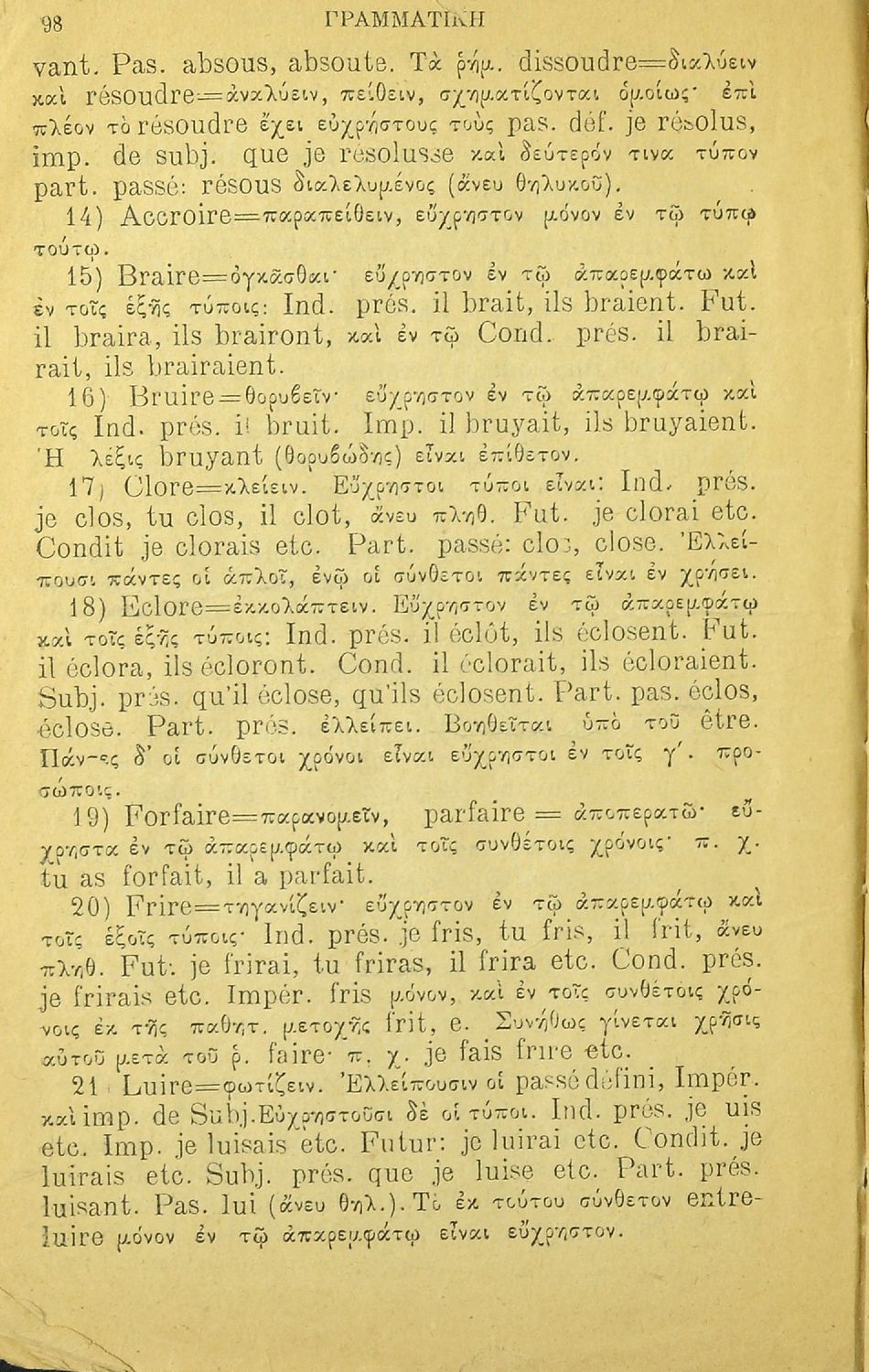 Μαθητικό βοήθημα Αρχαίων Ελληνικών για τα Ελληνικά Σχολεία, Παρθεναγωγεία και Γυμνάσια που περιλαμβάνει γραμματική της αρχαίας ελληνικής και κατάλογο ανωμάλων ρημάτων.