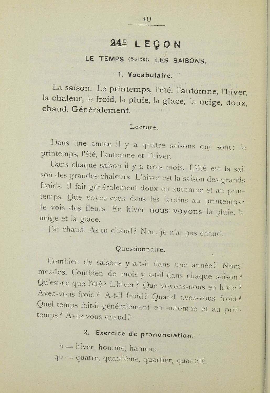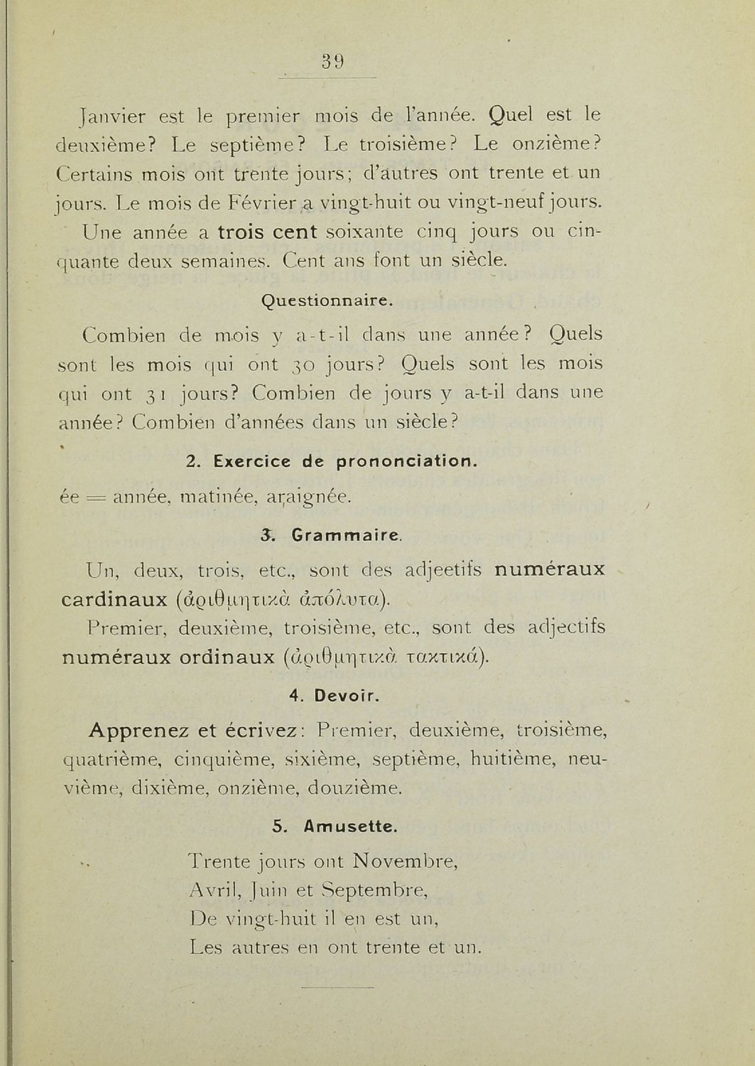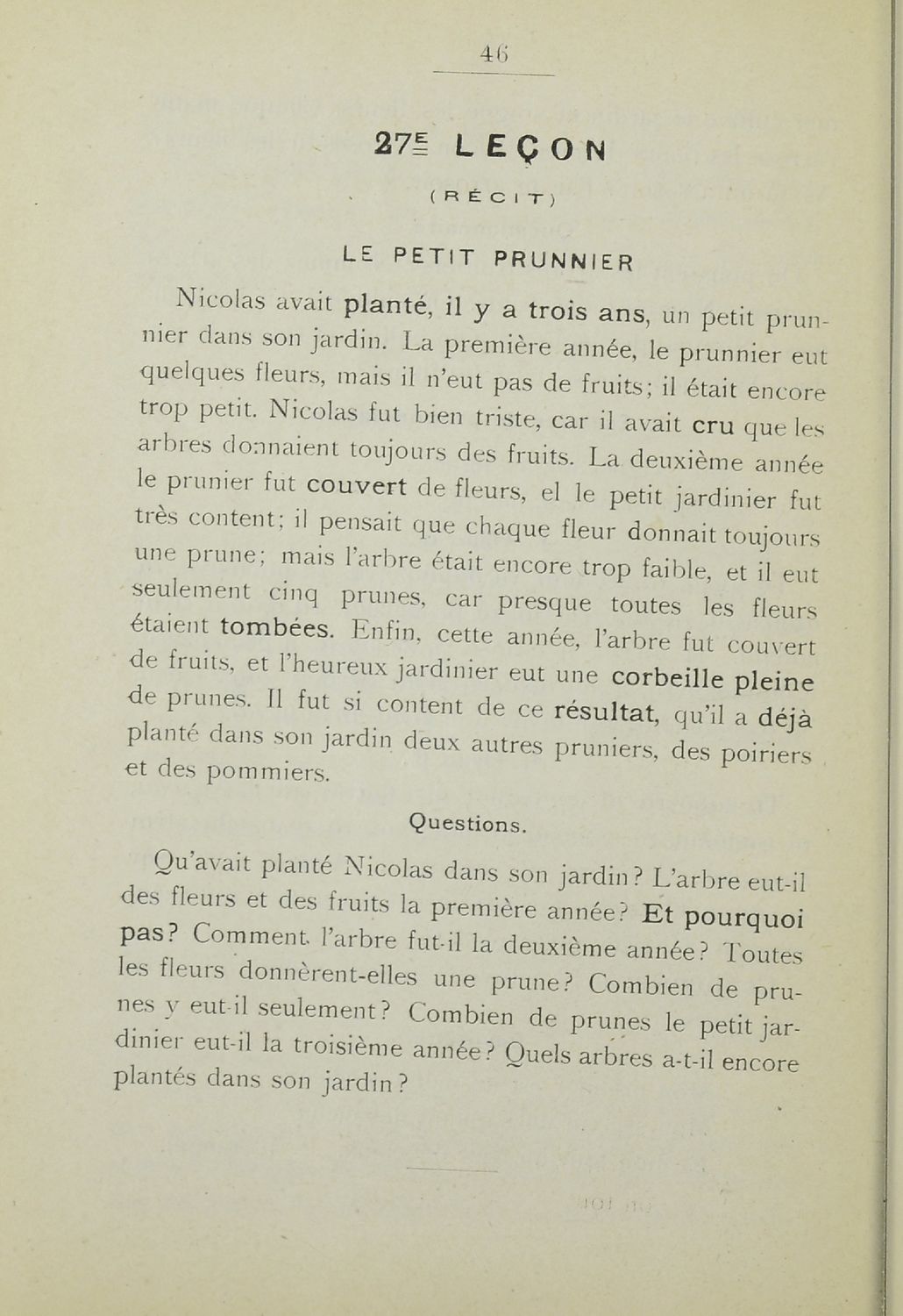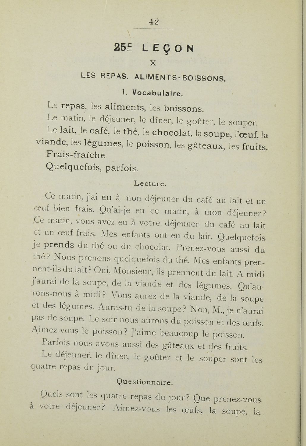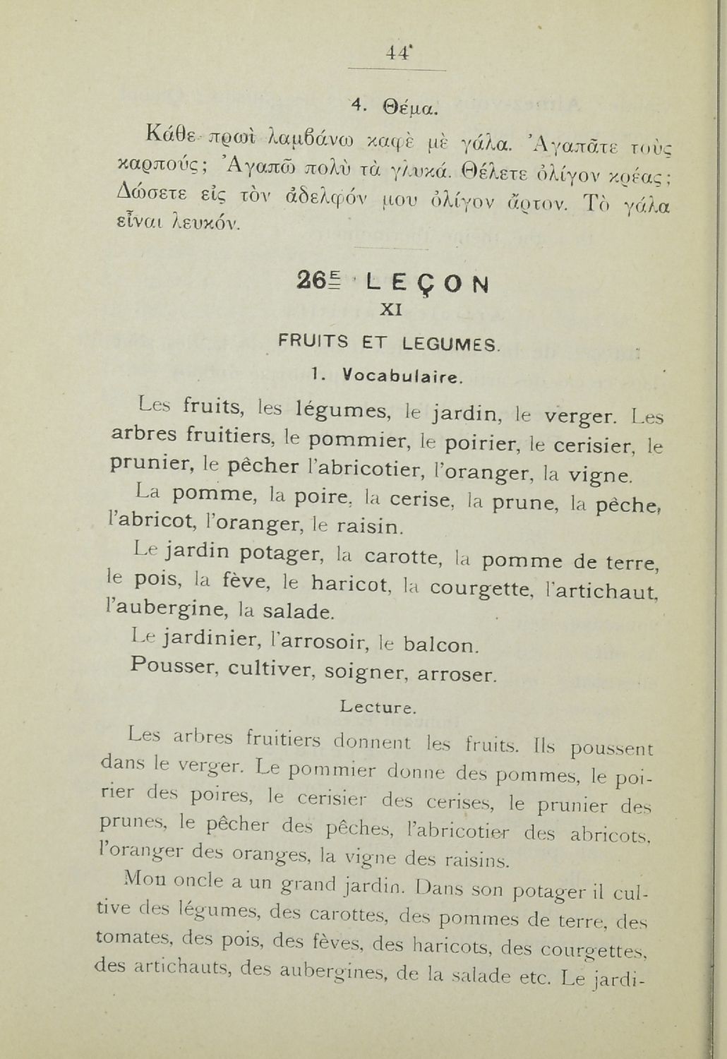 Σχολικό εγχειρίδιο Γαλλικών που περιλαμβάνει 54 κείμενα για τη διδασκαλία των γραμματικών και συντακτικών φαινομένων και της ορθογραφίας, λεξιλόγιο και παράρτημα με τους κανόνες συλλαβισμού.