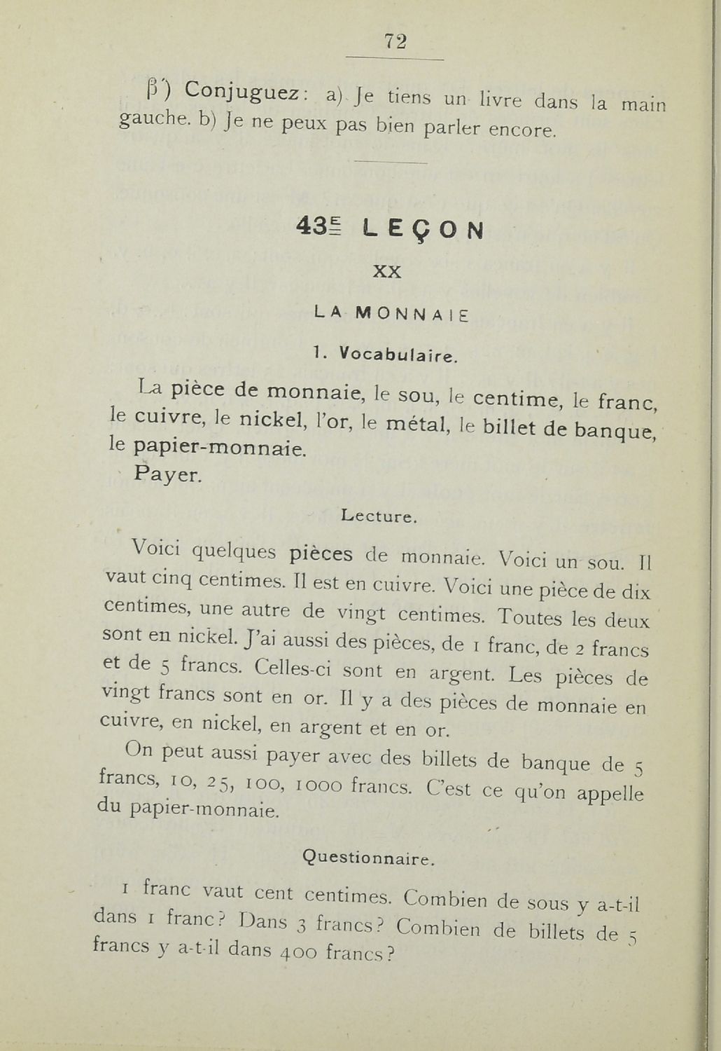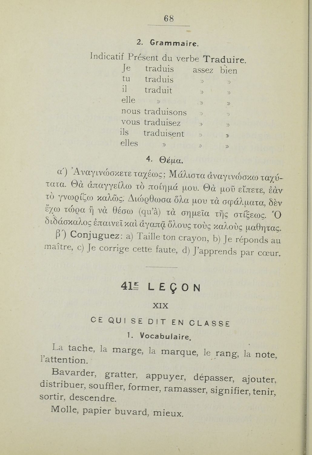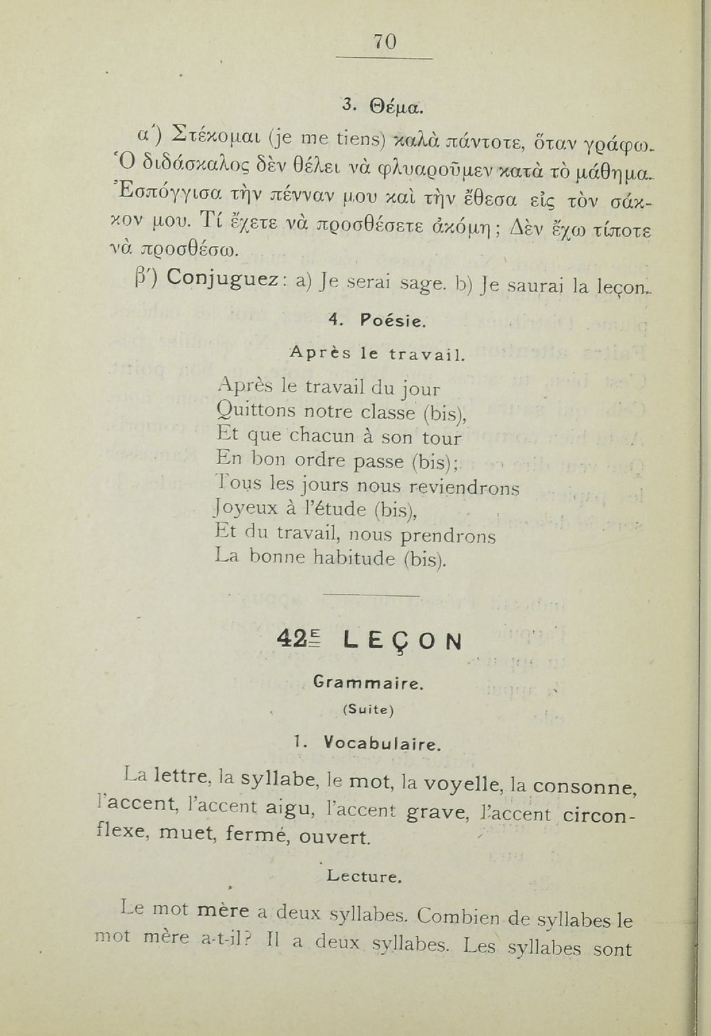 Σχολικό εγχειρίδιο Γαλλικών που περιλαμβάνει 54 κείμενα για τη διδασκαλία των γραμματικών και συντακτικών φαινομένων και της ορθογραφίας, λεξιλόγιο και παράρτημα με τους κανόνες συλλαβισμού.