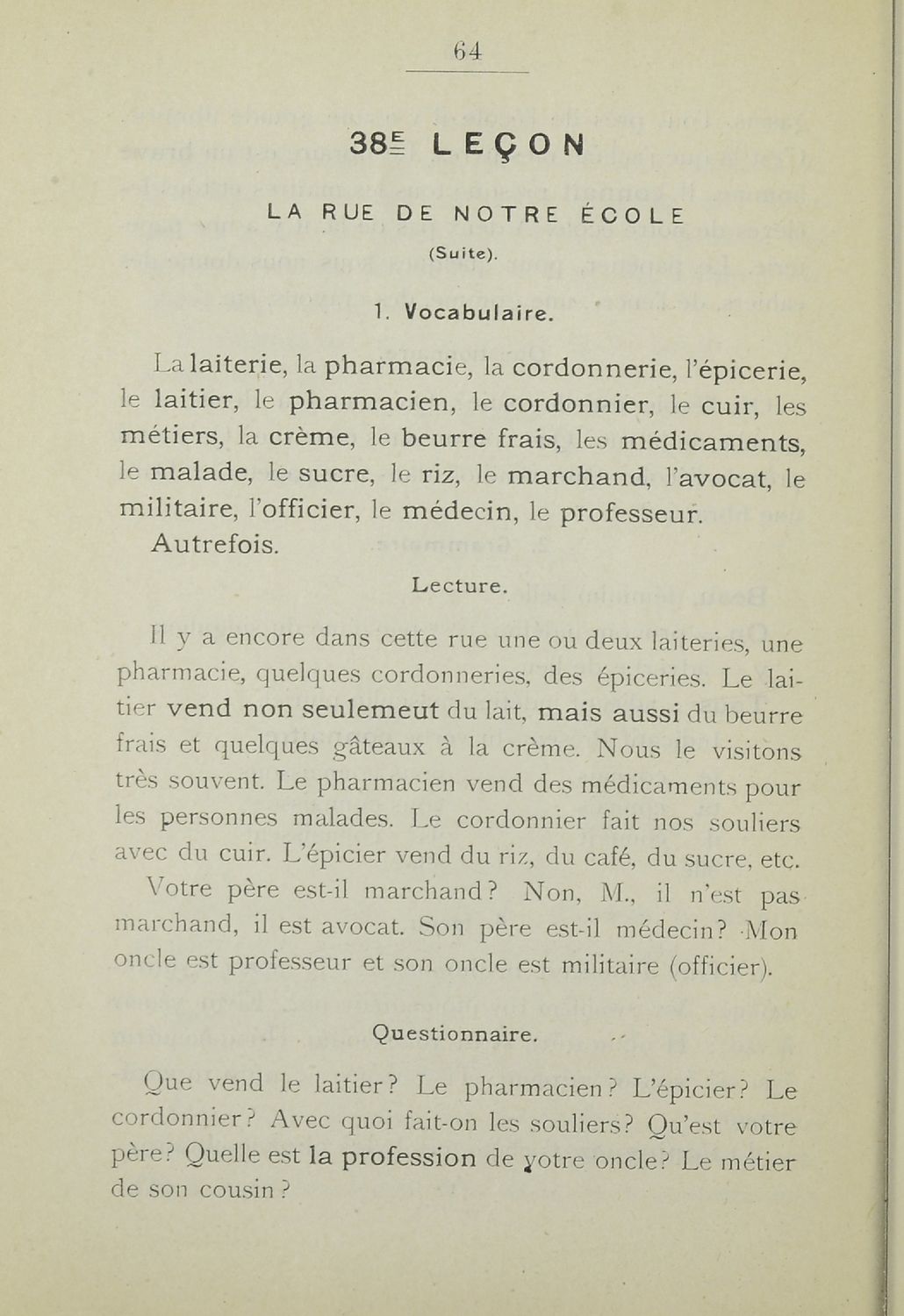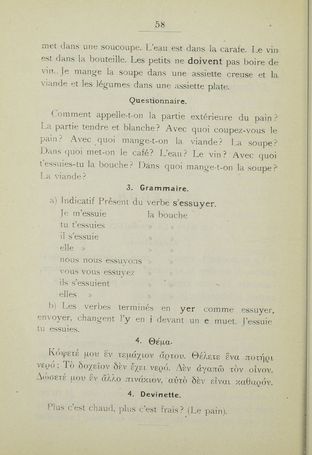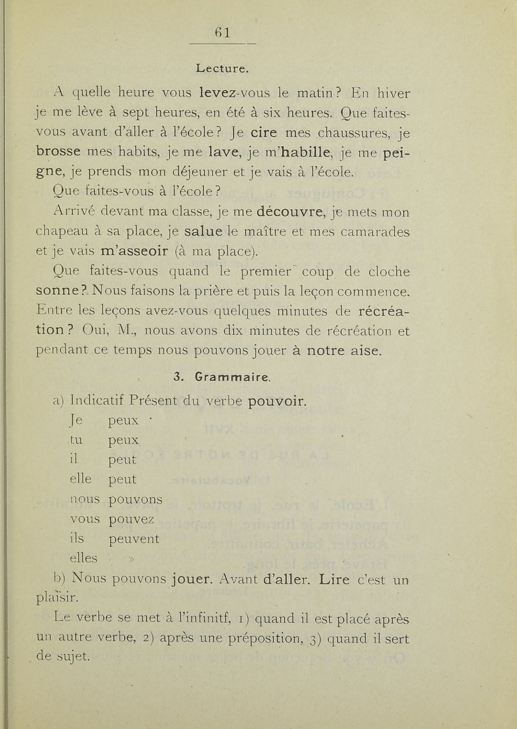 Σχολικό εγχειρίδιο Γαλλικών που περιλαμβάνει 54 κείμενα για τη διδασκαλία των γραμματικών και συντακτικών φαινομένων και της ορθογραφίας, λεξιλόγιο και παράρτημα με τους κανόνες συλλαβισμού.