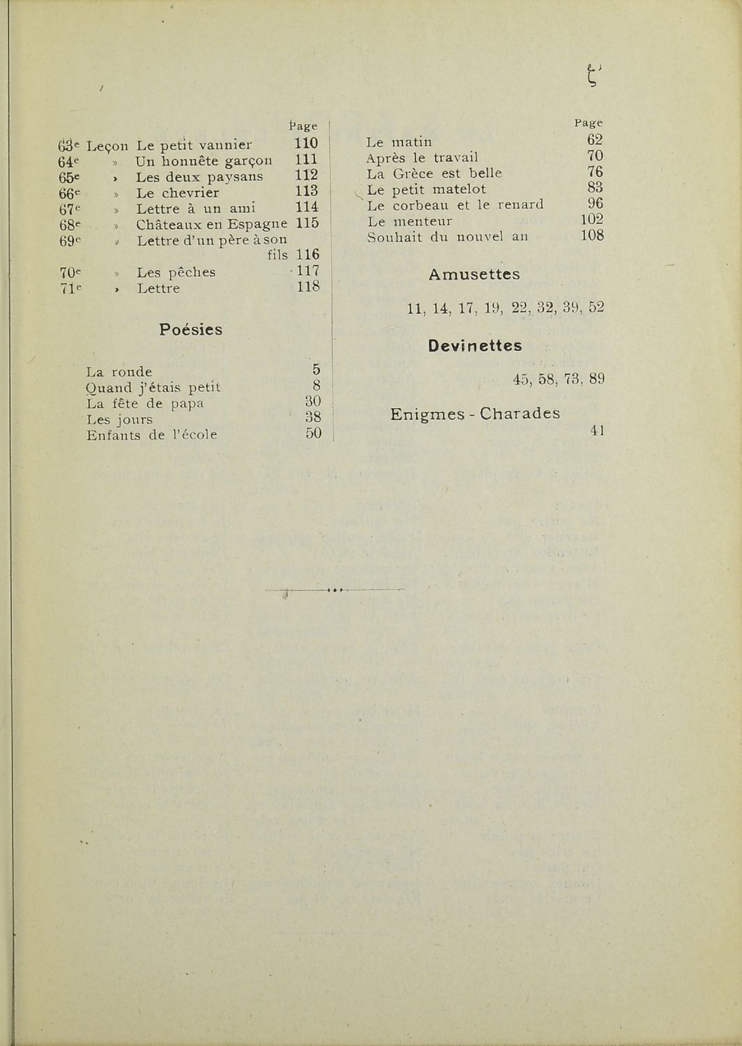Σχολικό εγχειρίδιο Γαλλικών που περιλαμβάνει 54 κείμενα για τη διδασκαλία των γραμματικών και συντακτικών φαινομένων και της ορθογραφίας, λεξιλόγιο και παράρτημα με τους κανόνες συλλαβισμού.