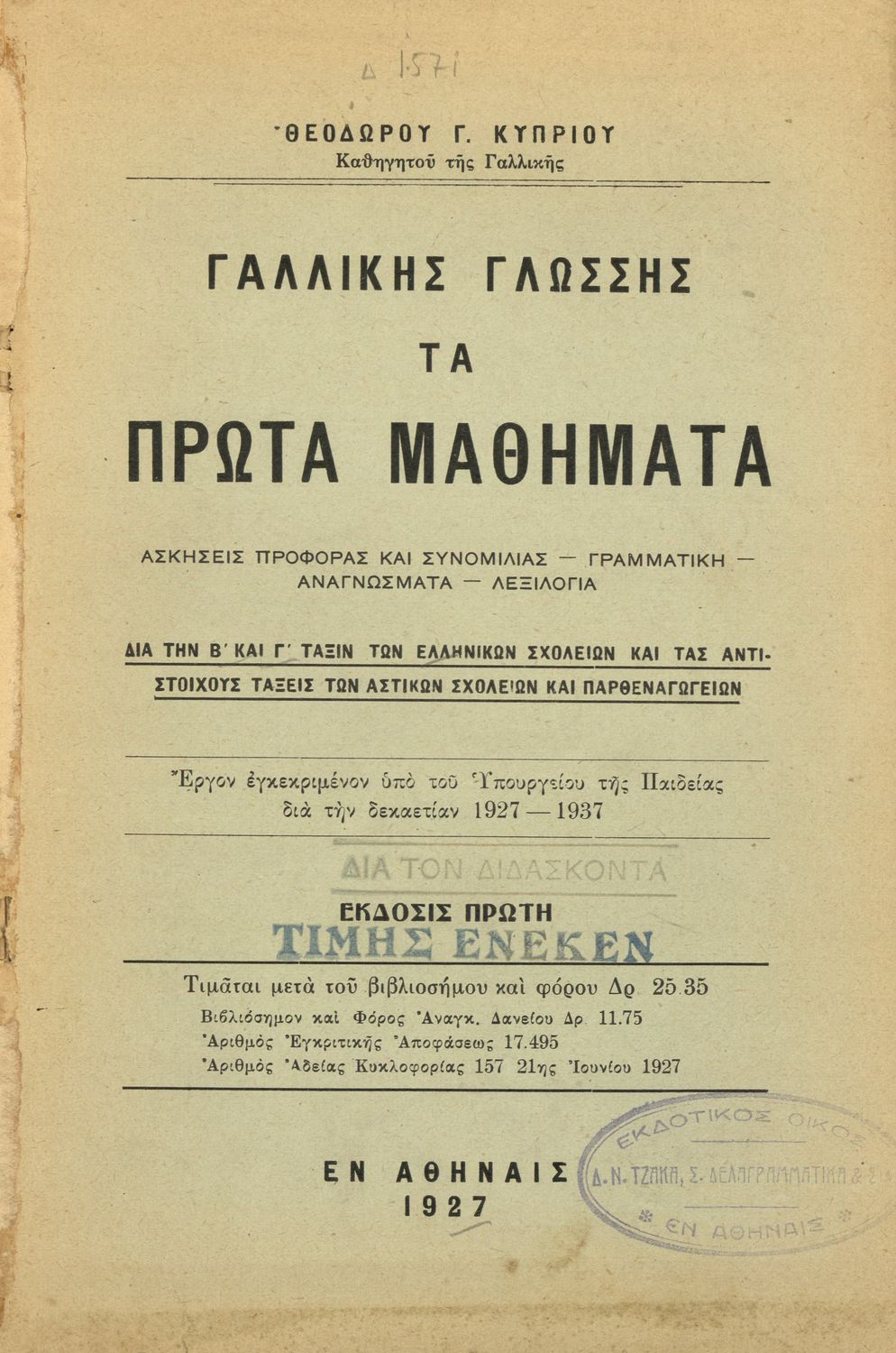 Τίτλος: Γαλλικής γλώσσης τα πρώτα μαθήματα διά την Β΄ και Γ΄ τάξιν των Ελληνικών Σχολείων και τας αντιστοίχους τάξεις των Αστικών Σχολείων και Παρθεναγωγείων