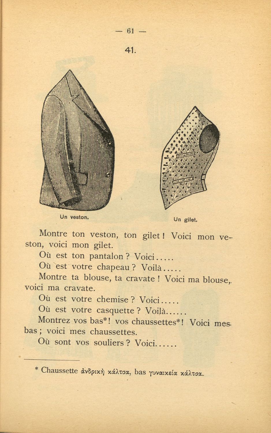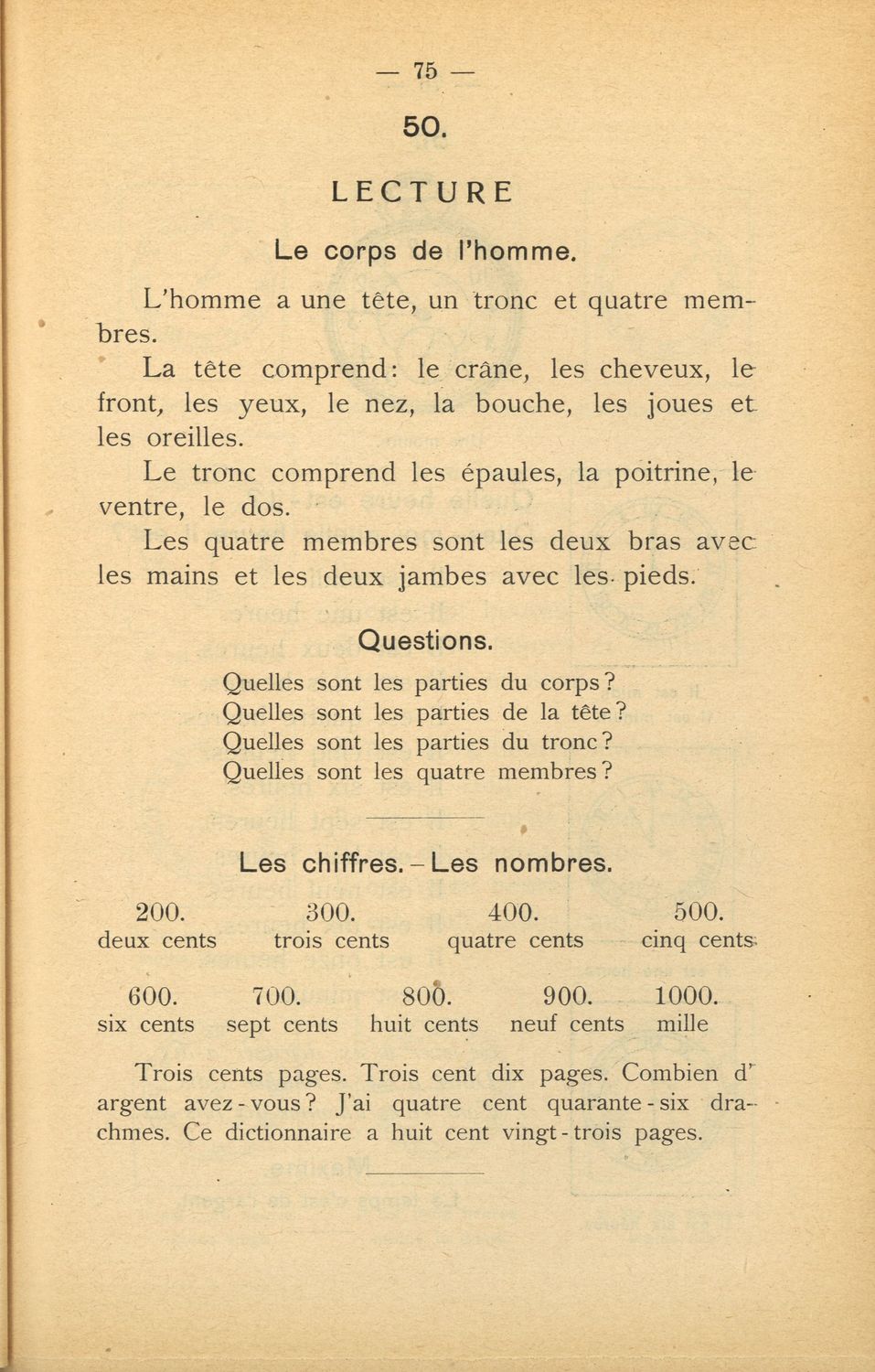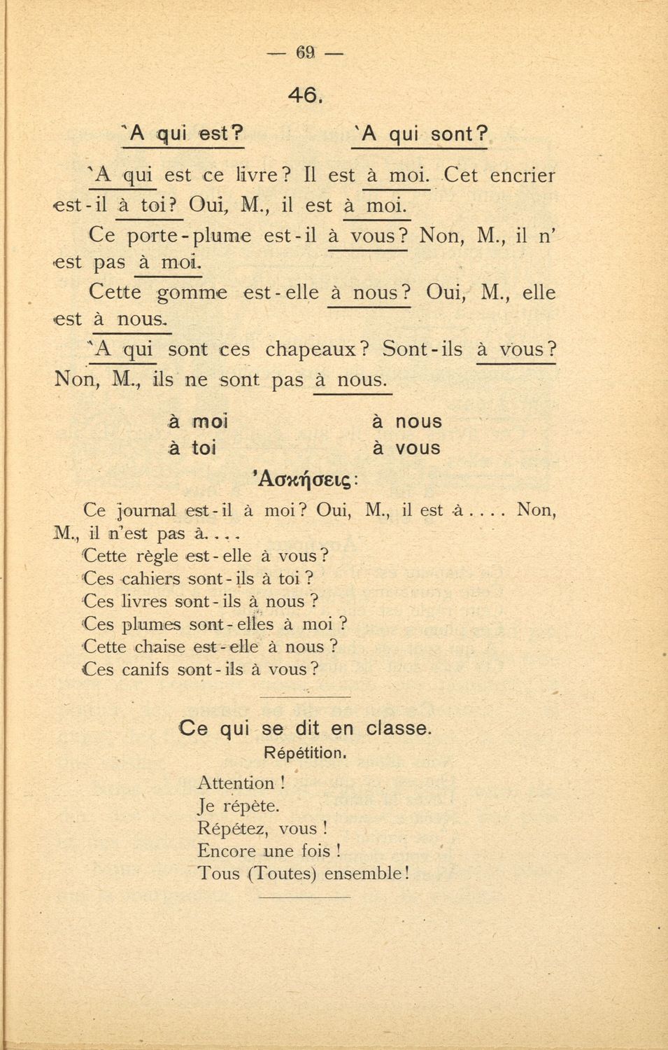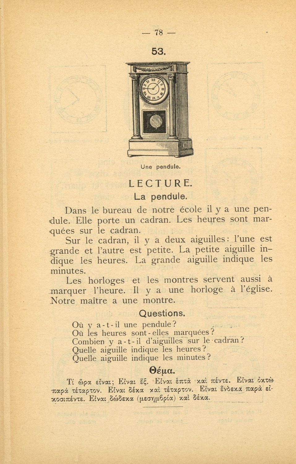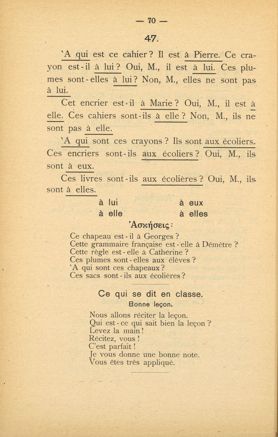 Σχολικό εγχειρίδιο Γαλλικών Β΄ και Γ' Ελληνικού Σχολείου, Αστικού Σχολείου και Παρθεναγωγείου που περιλαμβάνει κείμενα, κανόνες γραμματικής και συντακτικού, ερωτήσεις και ασκήσεις κατανόησης, και λεξιλογικά και πραγματολογικά σχόλια.