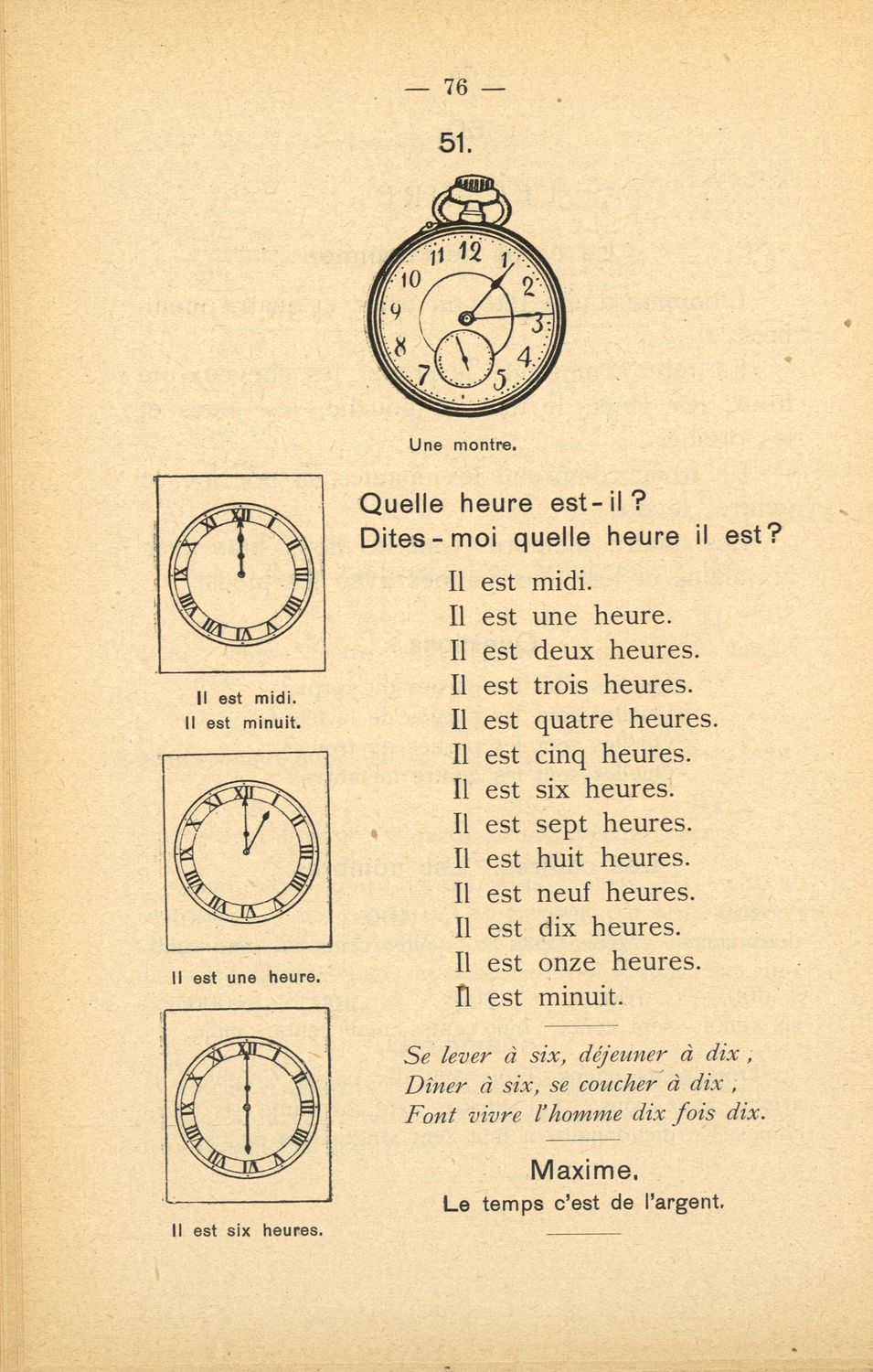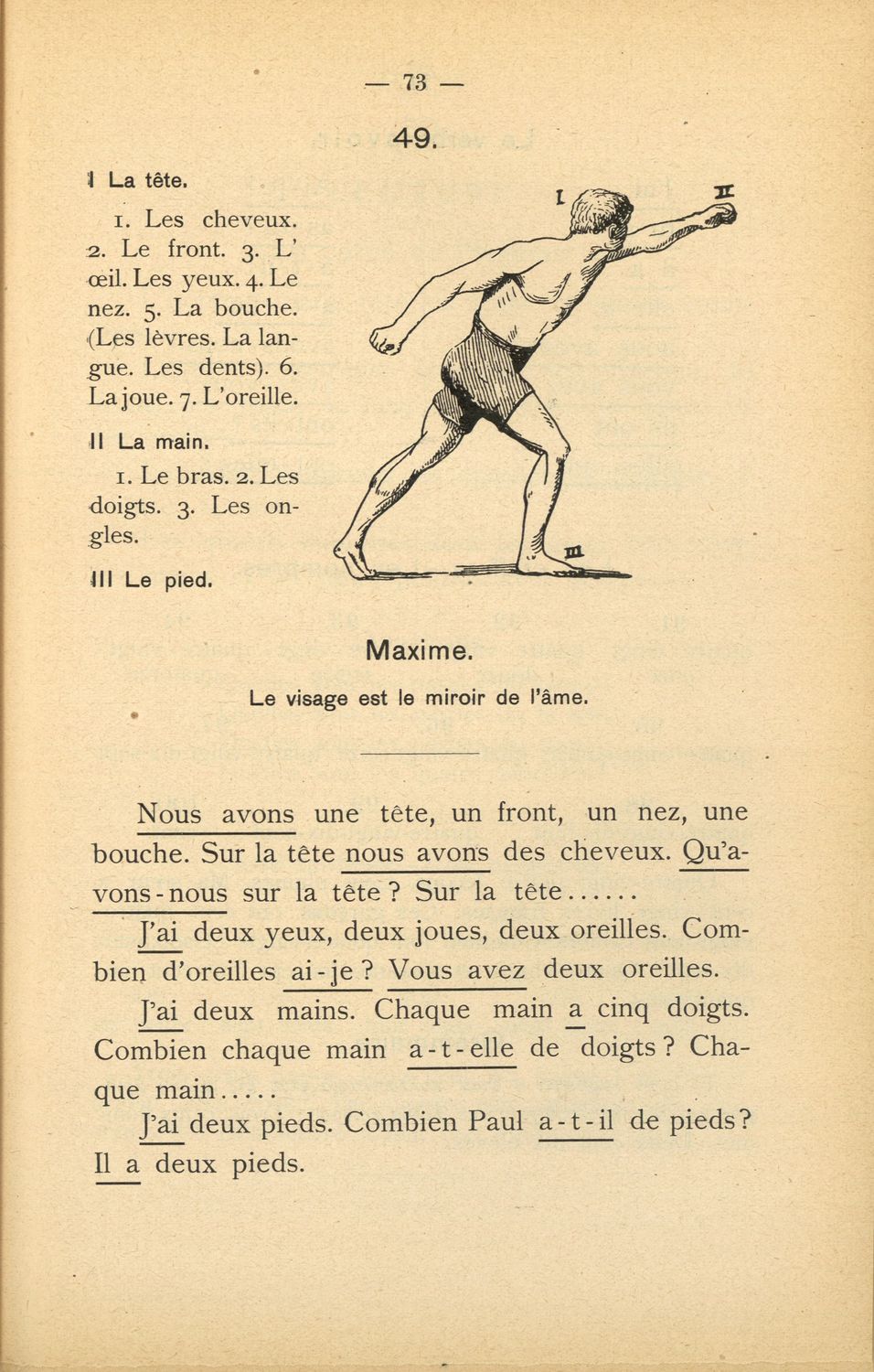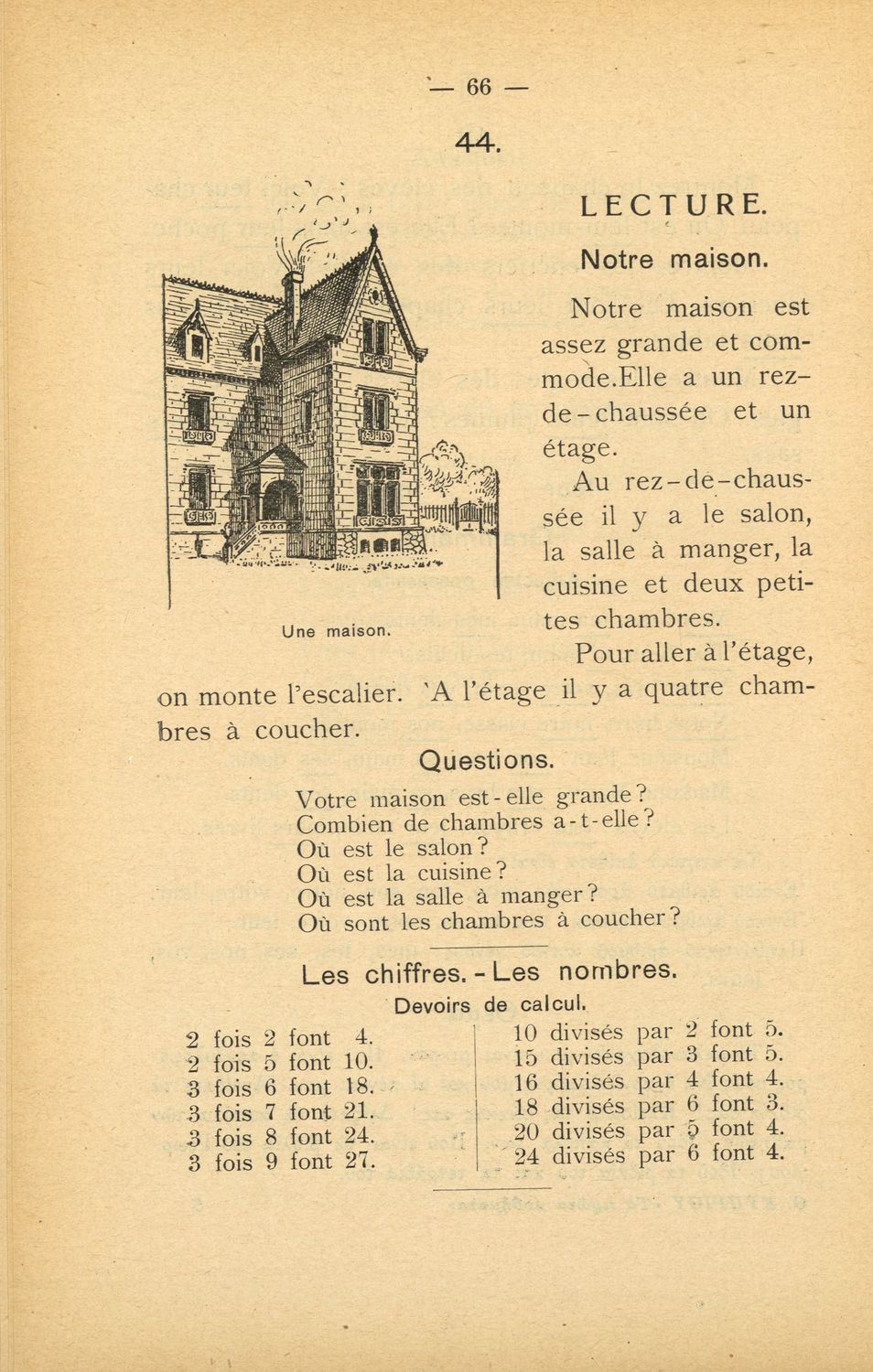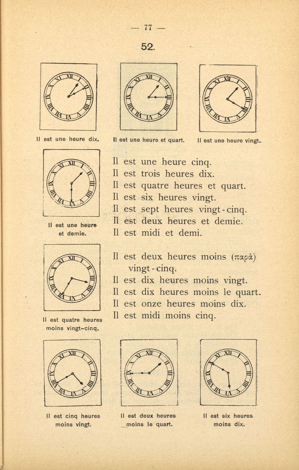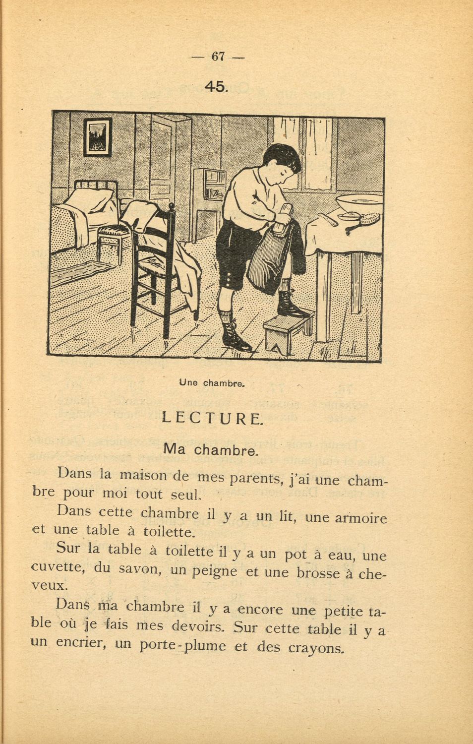 Σχολικό εγχειρίδιο Γαλλικών Β΄ και Γ' Ελληνικού Σχολείου, Αστικού Σχολείου και Παρθεναγωγείου που περιλαμβάνει κείμενα, κανόνες γραμματικής και συντακτικού, ερωτήσεις και ασκήσεις κατανόησης, και λεξιλογικά και πραγματολογικά σχόλια.