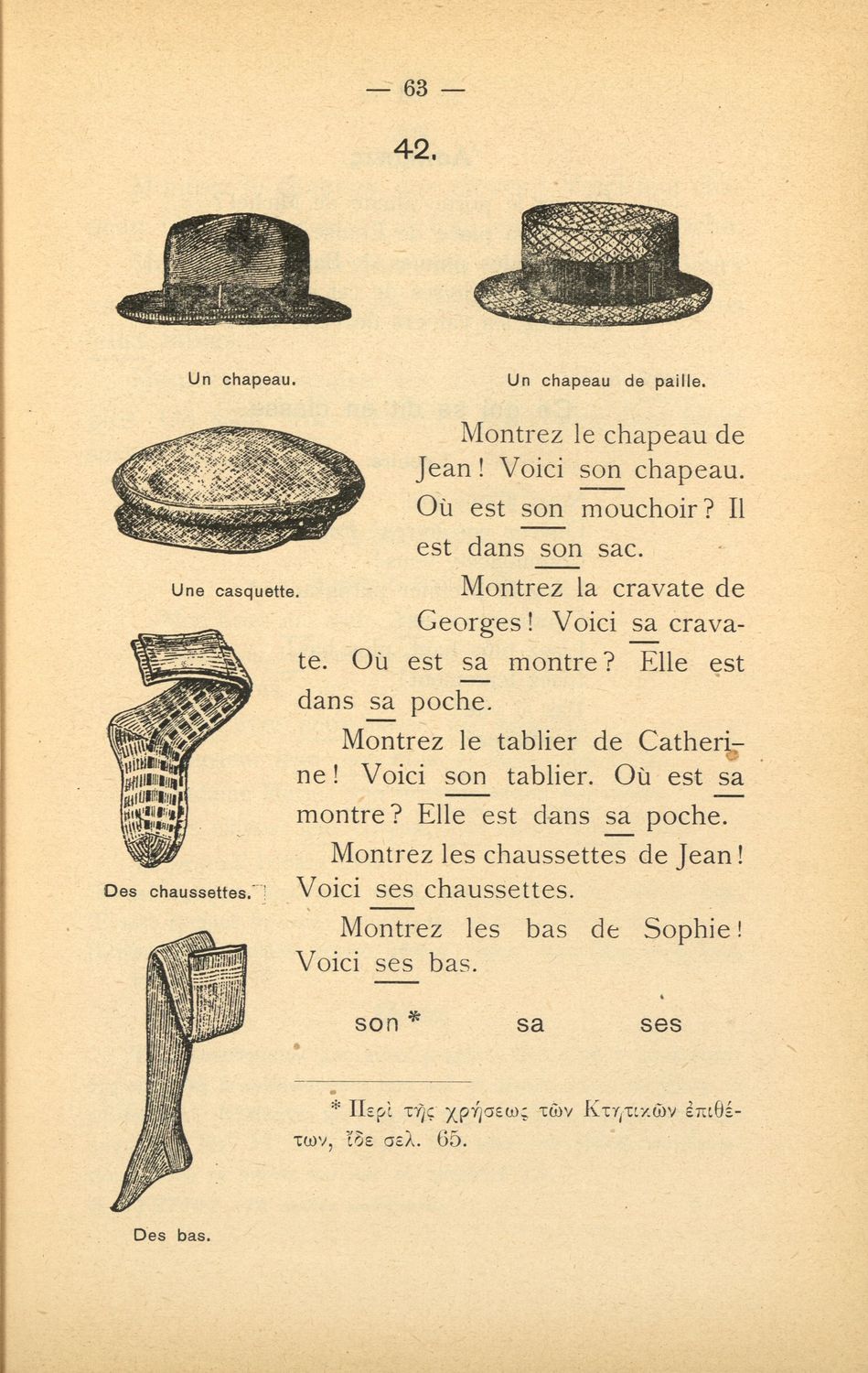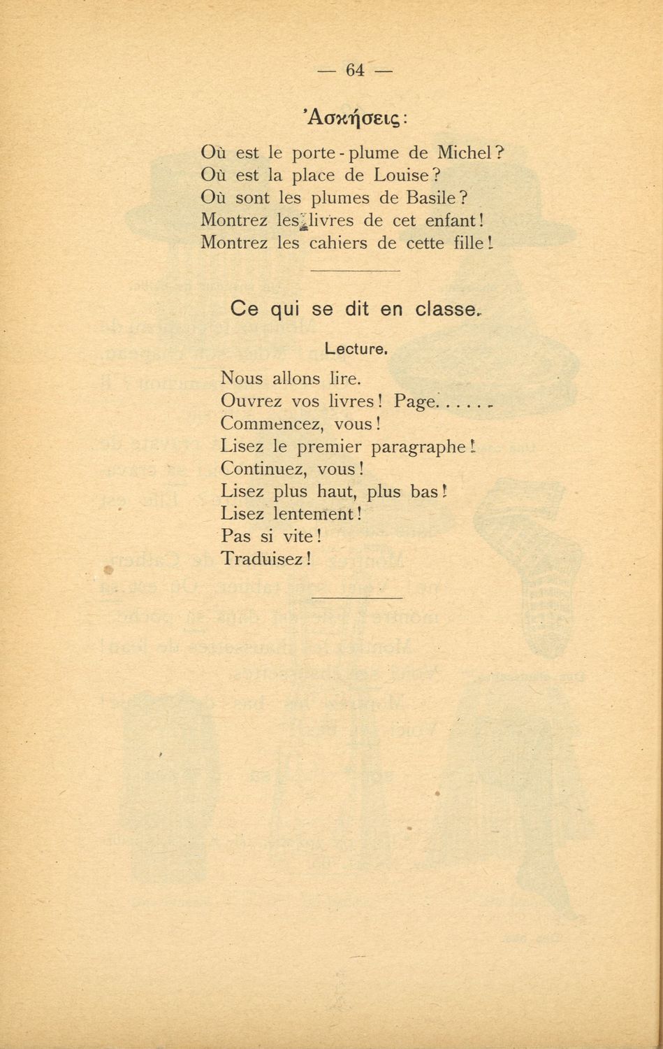 Σχολικό εγχειρίδιο Γαλλικών των Γυμνασίων, Αστικών Σχολείων θηλέων και Διδασκαλείων Δημοτικής Εκπαίδευσης. Κείμενα, ποιήματα, από εποχές και τον κοινωνικό και οικογενειακό βίο, τα οποία συνοδεύονται ασκήσεις ...