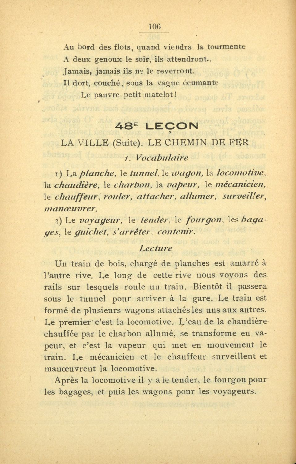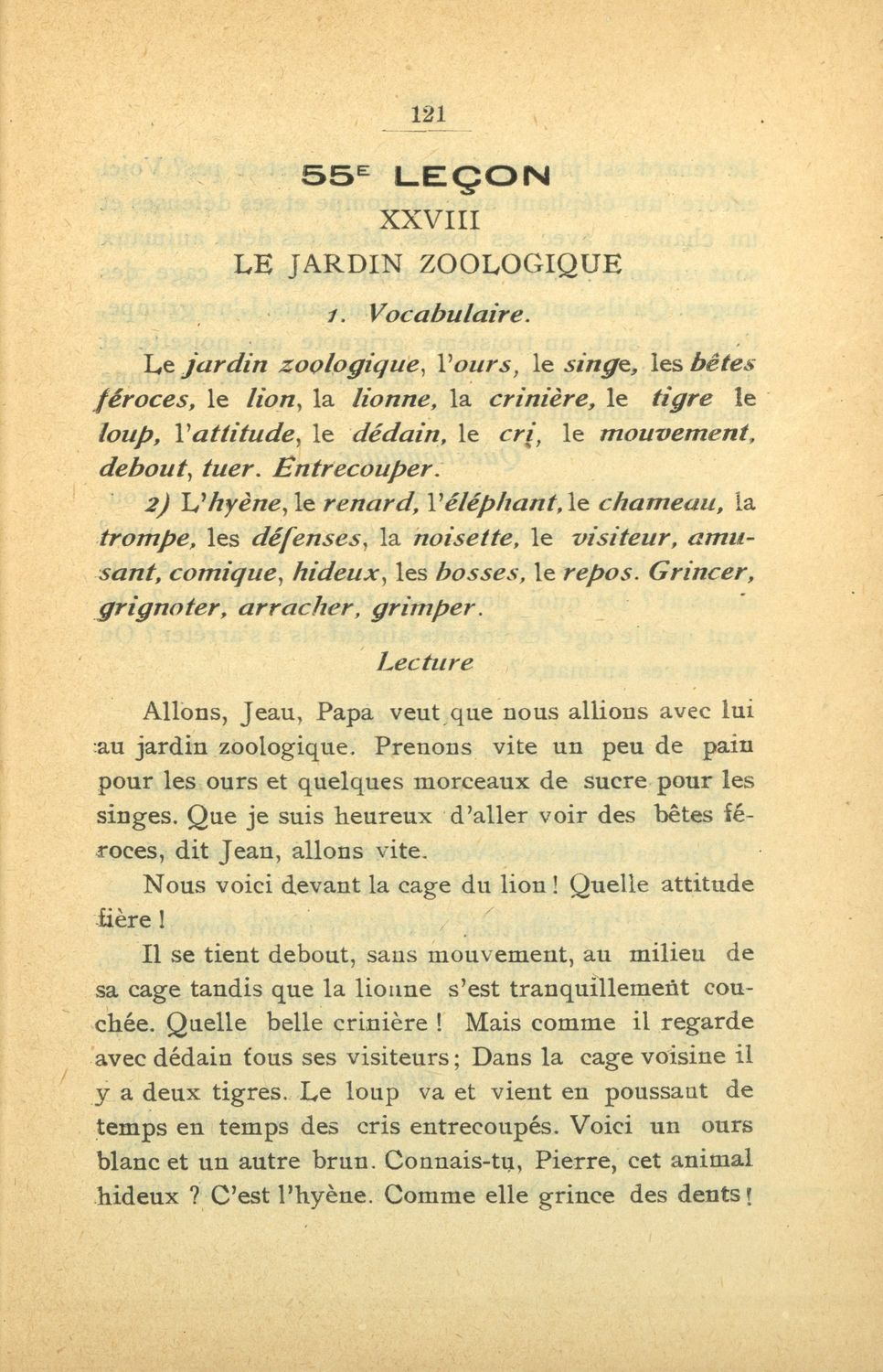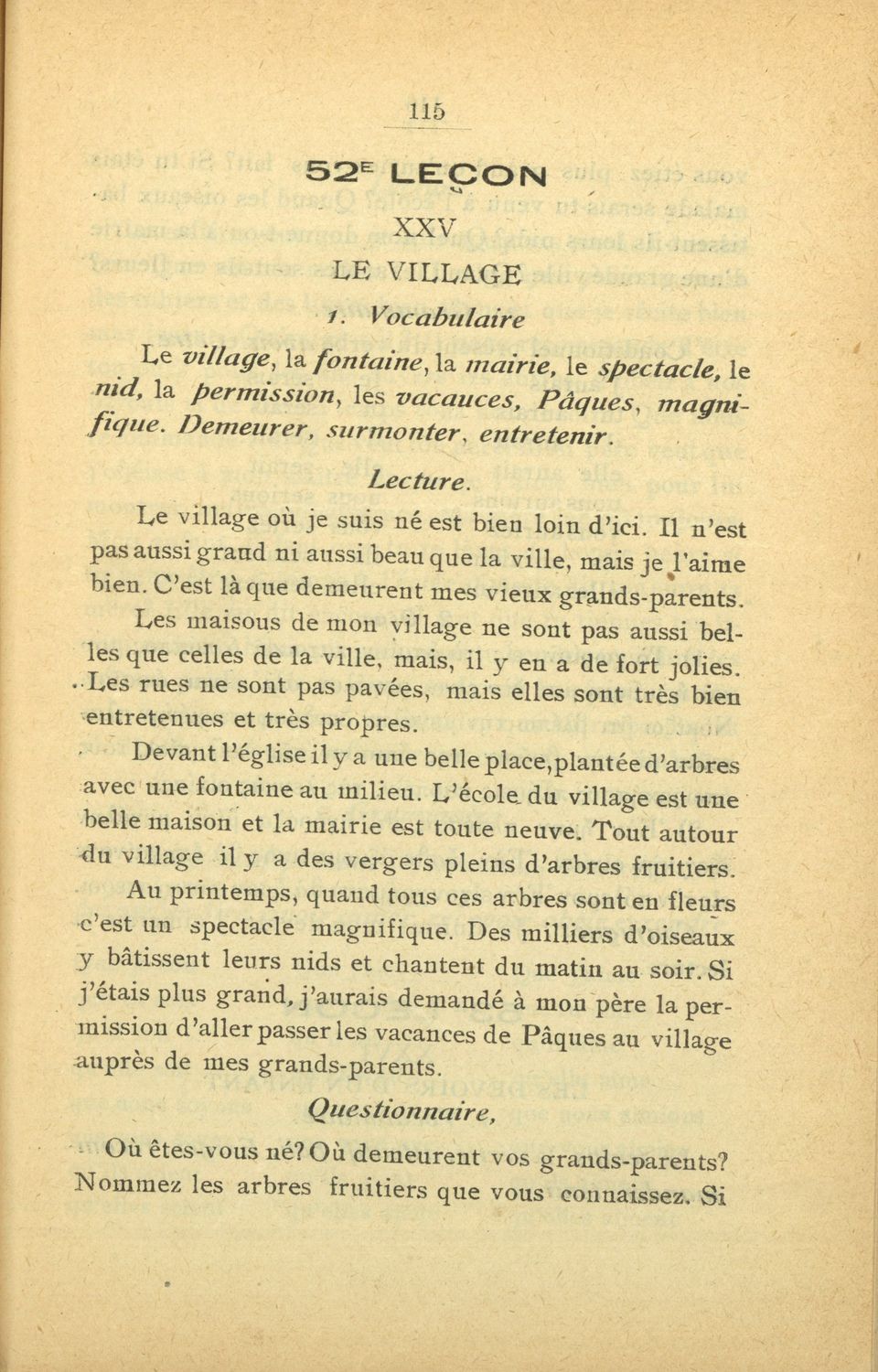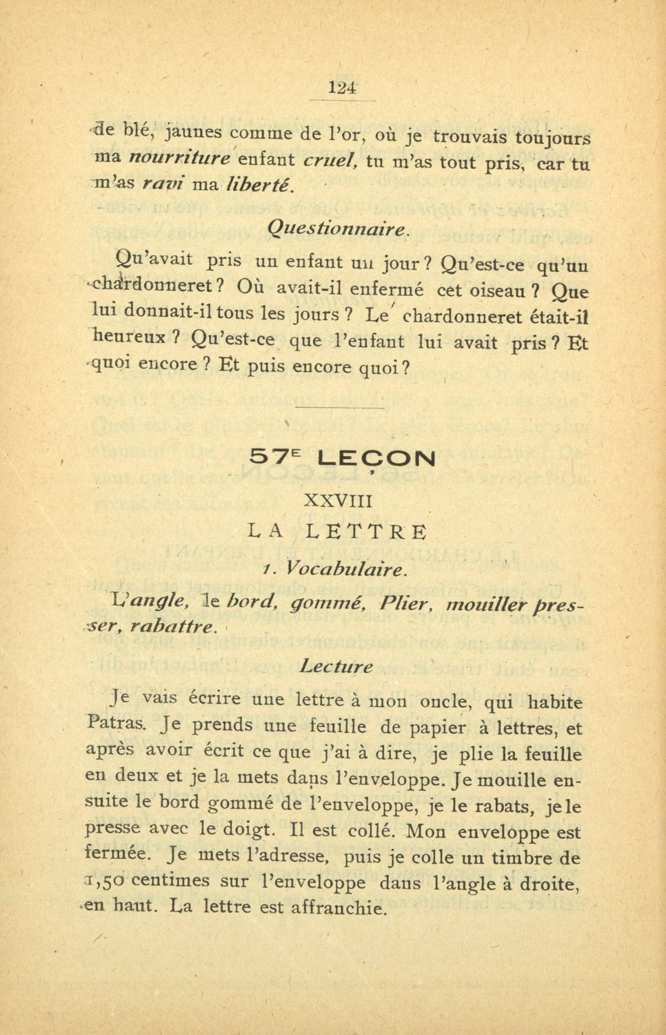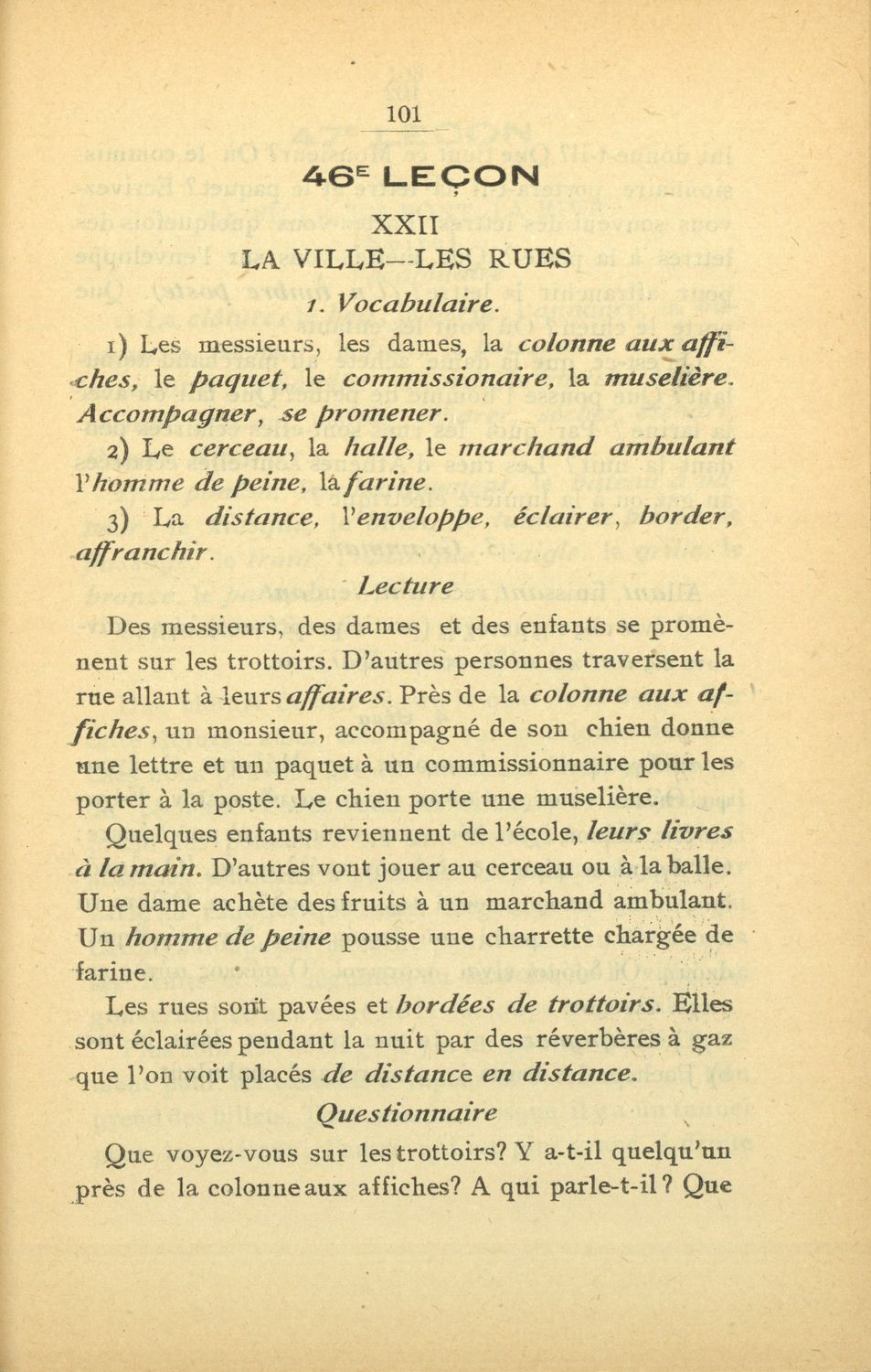 Σχολικό εγχειρίδιο Γαλλικών που περιλαμβάνει 54 κείμενα για τη διδασκαλία των γραμματικών και συντακτικών φαινομένων και της ορθογραφίας, λεξιλόγιο και παράρτημα με τους κανόνες συλλαβισμού.