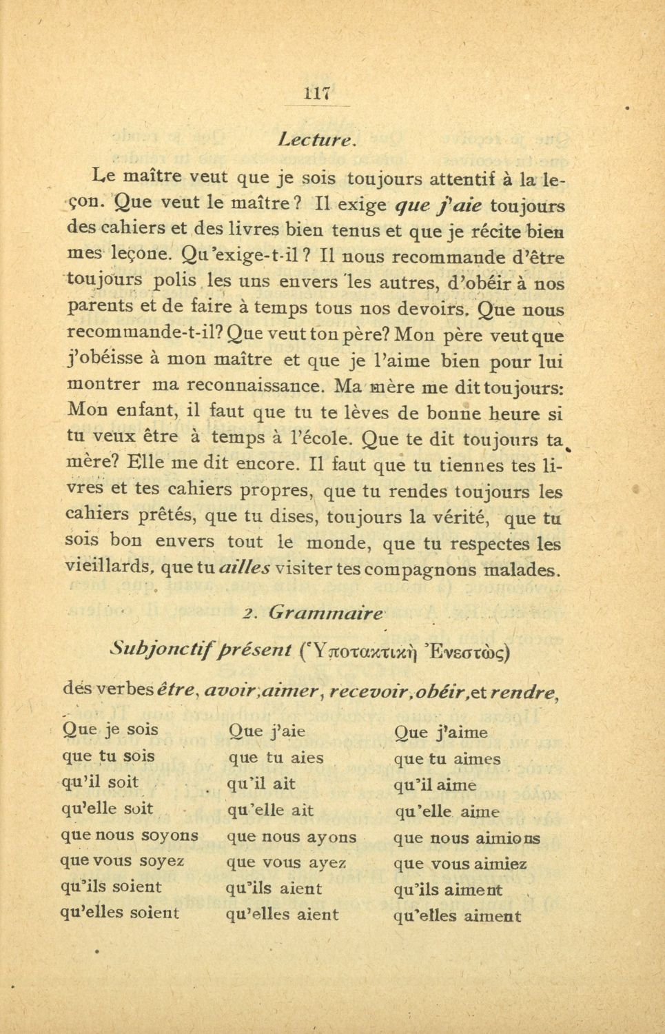 Σχολικό εγχειρίδιο Γαλλικών για τις Β΄ και Γ' Ελληνικού Σχολείου, Αστικού Σχολείου και Παρθεναγωγείου που περιλαμβάνει κείμενα, κανόνες γραμματικής και συντακτικού, και λεξιλογικά και πραγματολογικά σχόλια.
