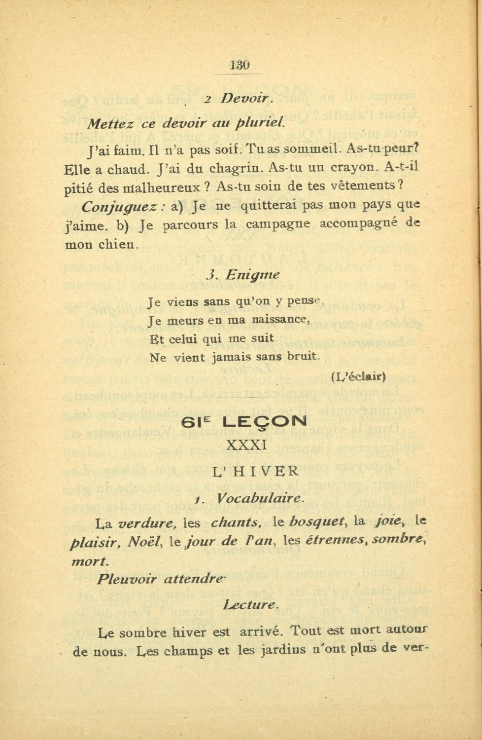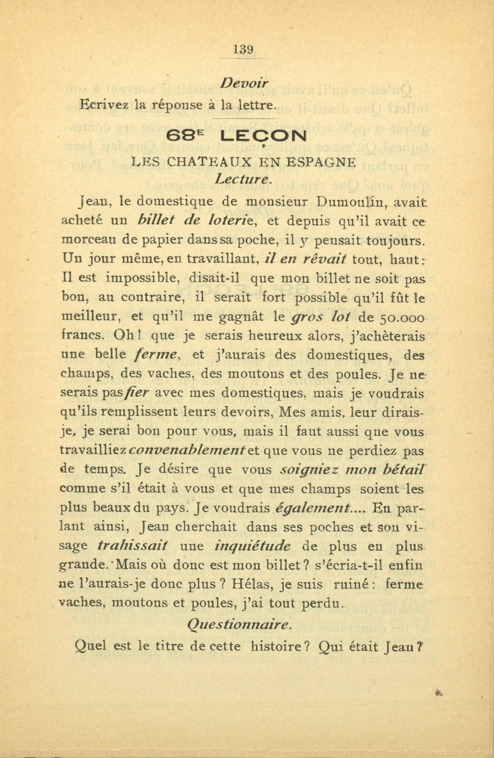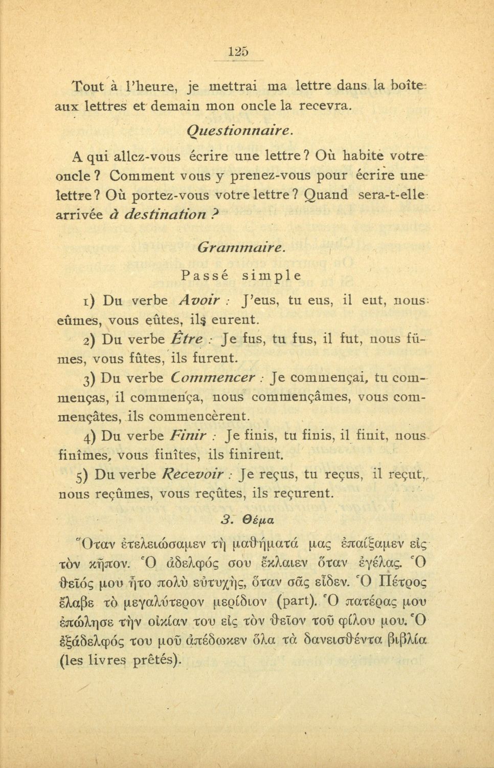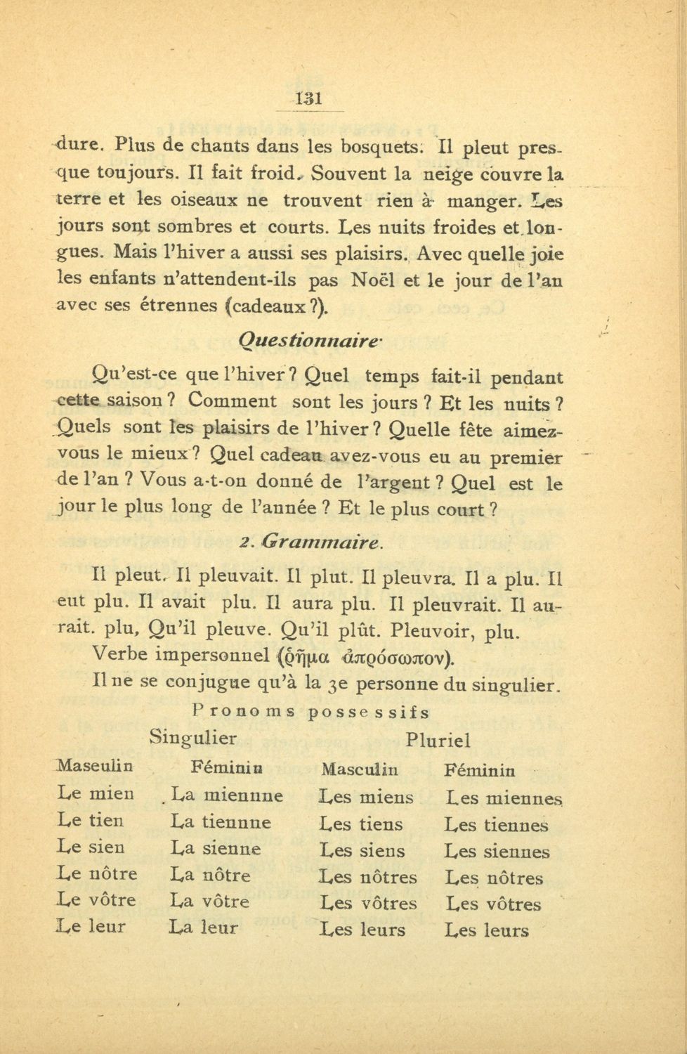 Σχολικό εγχειρίδιο Γαλλικών για τις Β΄ και Γ' Ελληνικού Σχολείου, Αστικού Σχολείου και Παρθεναγωγείου που περιλαμβάνει κείμενα, κανόνες γραμματικής και συντακτικού, και λεξιλογικά και πραγματολογικά σχόλια.