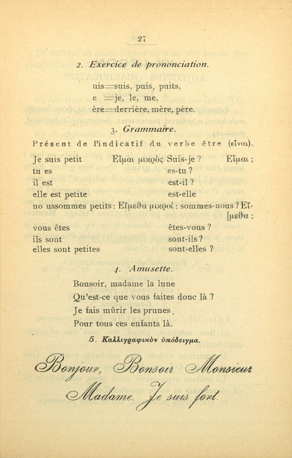 Σχολικό εγχειρίδιο Γαλλικών για τις Β’ και Γ’ Ελληνικού και Αστικού Σχολείου και Παρθεναγωγείου που περιλαμβάνει ασκήσεις προφοράς, συνομιλίας και γραμματικής, και λεξιλόγιο.