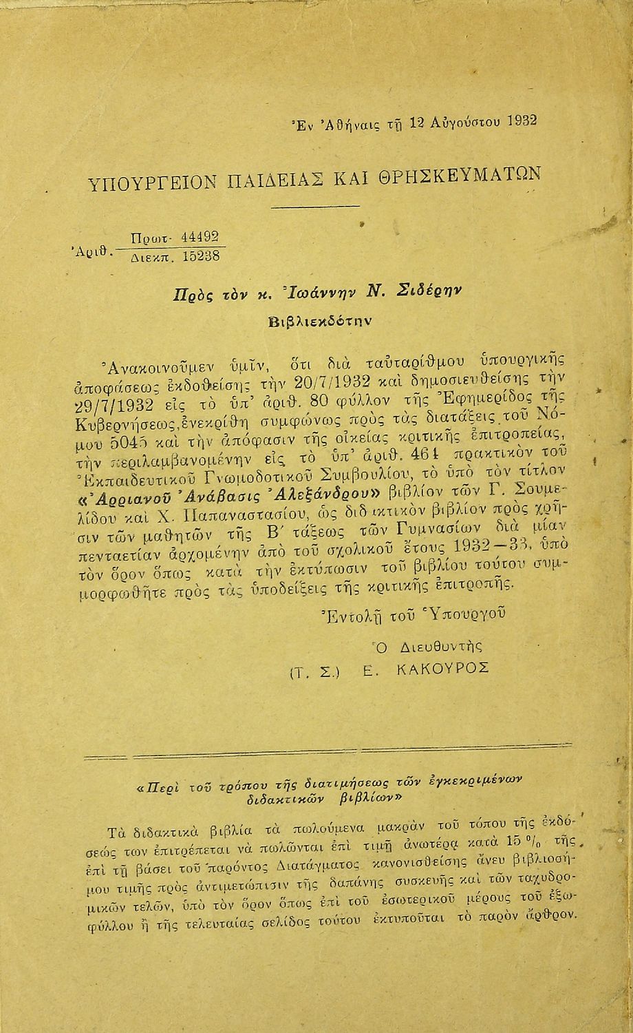 Σχολικό εγχειρίδιο Αρχαίων Ελληνικών που περιλαμβάνει αποσπάσματα από το έργο του Αρριανού Αλέξανδρου Ανάβασις και του Ηρόδοτου Ιστορίαι, ερμηνευτικές και λεξιλογικές παρατηρήσεις καθώς και τοπογραφικούς ...