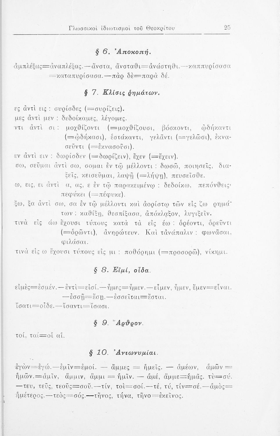 Μαθητικό βοήθημα Αρχαίων Ελληνικών Η' Γυμνασίου που περιέχει μετάφραση των Ειδυλλίων του Θεόκριτου, συντακτική ανάλυση και ερμηνευτικά σχόλια.