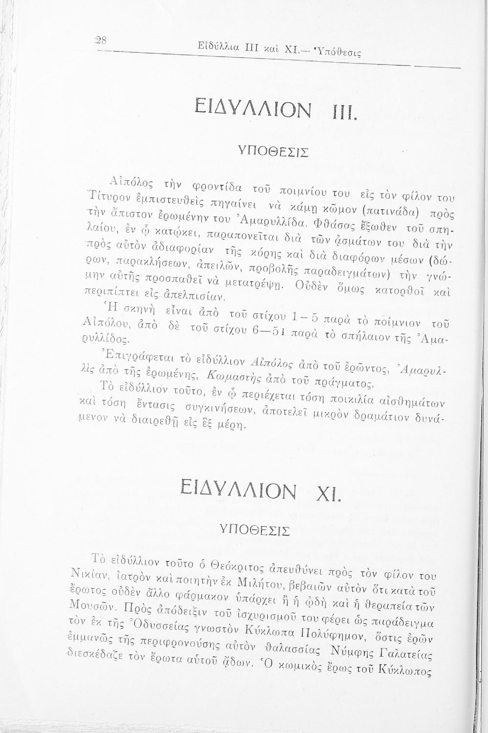 Σχολικό εγχειρίδιο Αρχαίων Ελληνικών που περιλαμβάνει τα ειδύλλια του Θεόκριτου, εισαγωγή στην βουκολική ποίηση, και στη ζωή και το έργο του Θεόκριτου, την υπόθεση του έργου και γραμματικές και συντακτικές παρατηρήσεις και λεξιλόγιο.