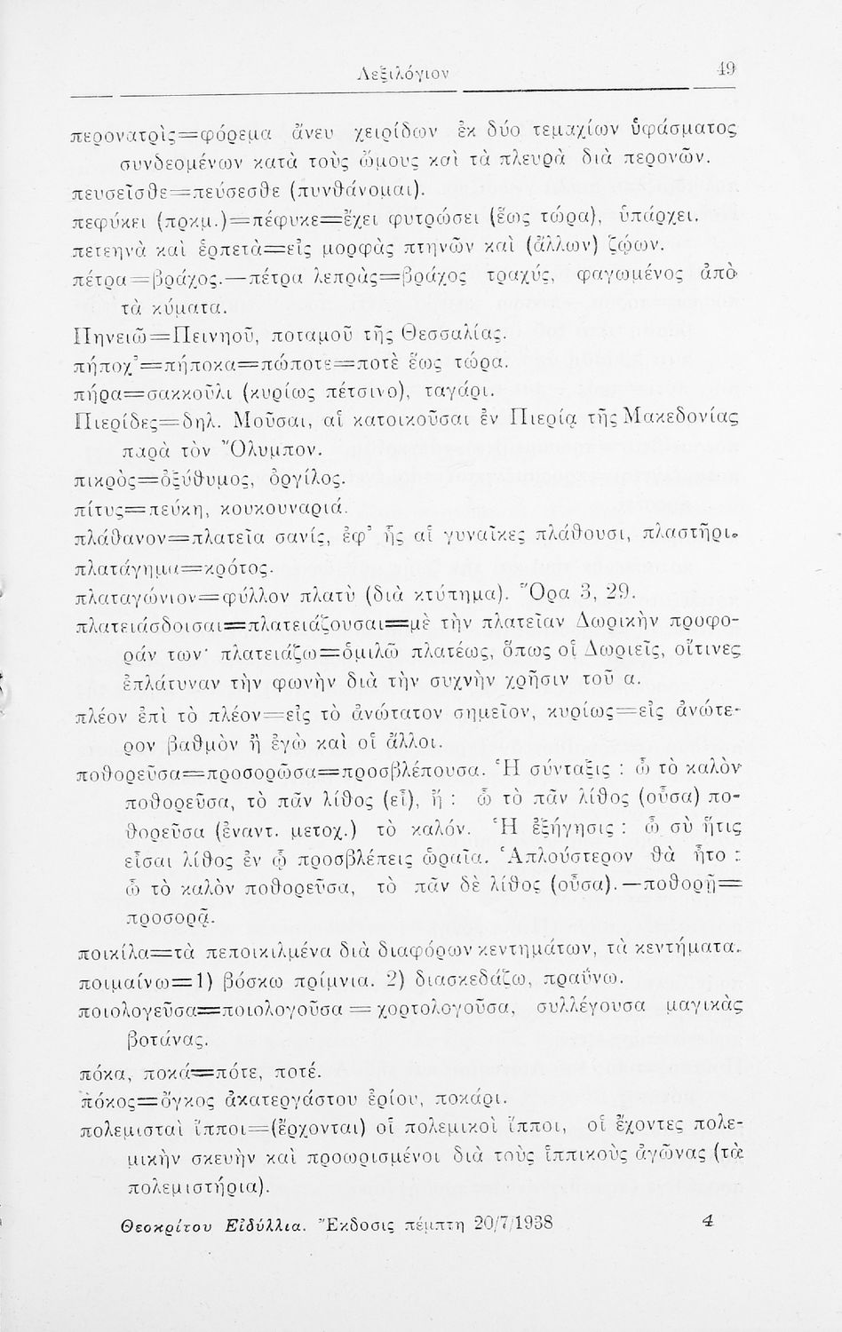 Σχολικό εγχειρίδιο Αρχαίων Ελληνικών Δ΄ Γυμνασίου που περιλαμβάνει τα Ειδύλλλια του Θεοκρίτου, και πραγματολογικές και λεξιλογικές παρατηρήσεις. Ο συγγραφέας ήταν διδάκτωρ Φιλολογίας.