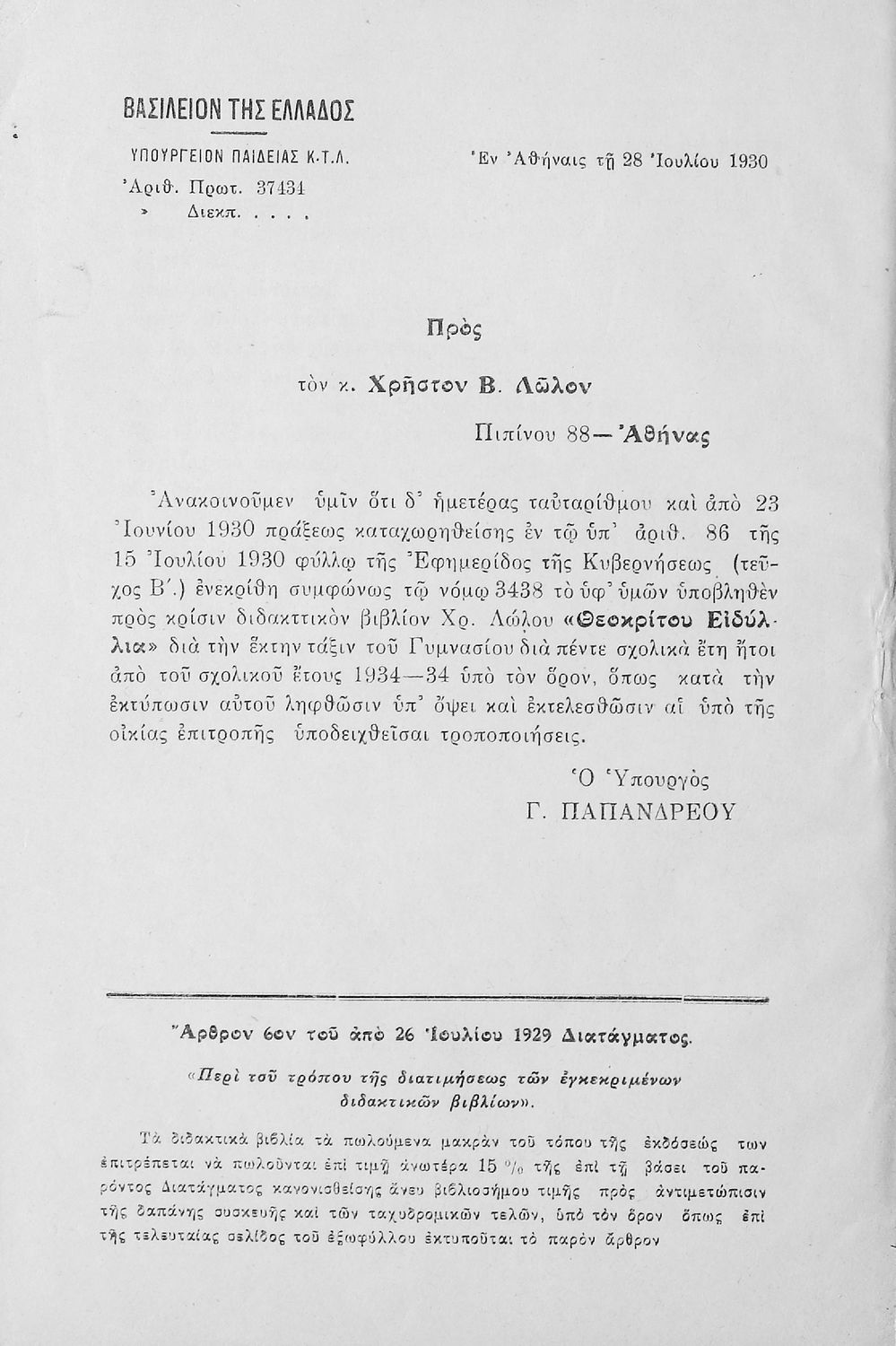 Υπουργική απόφαση / Σύμβαση: 37434/ 28-7-1930