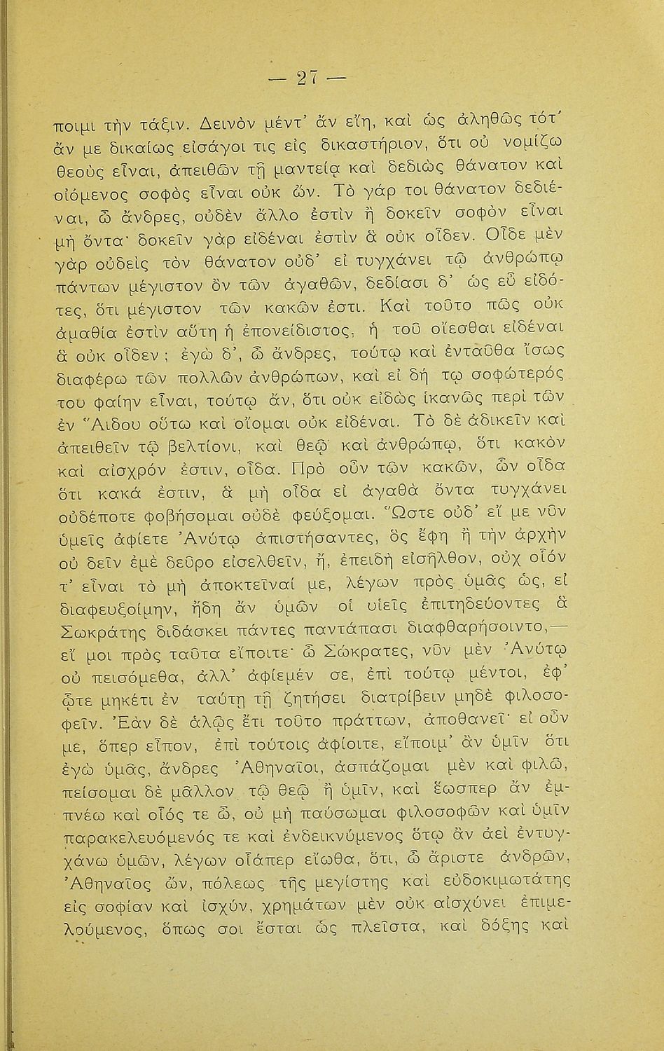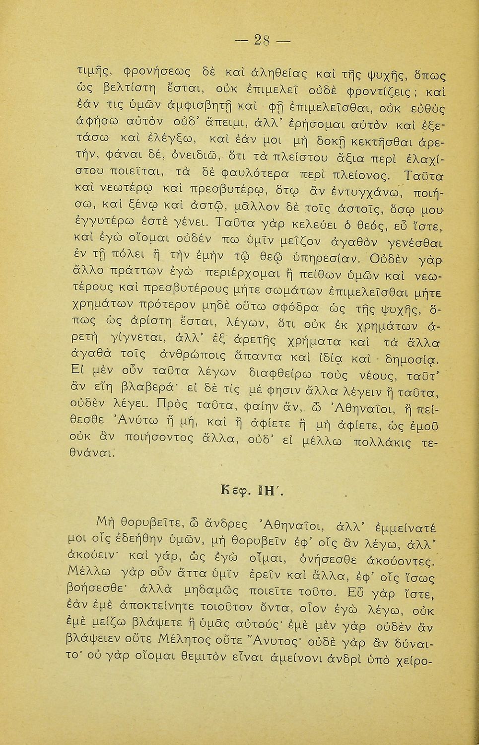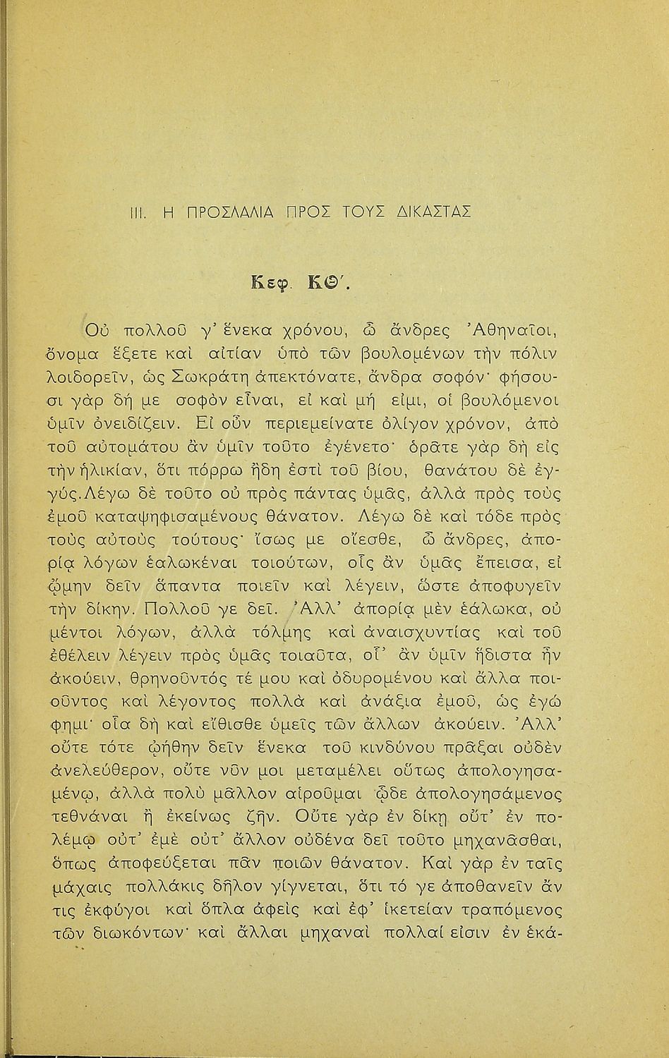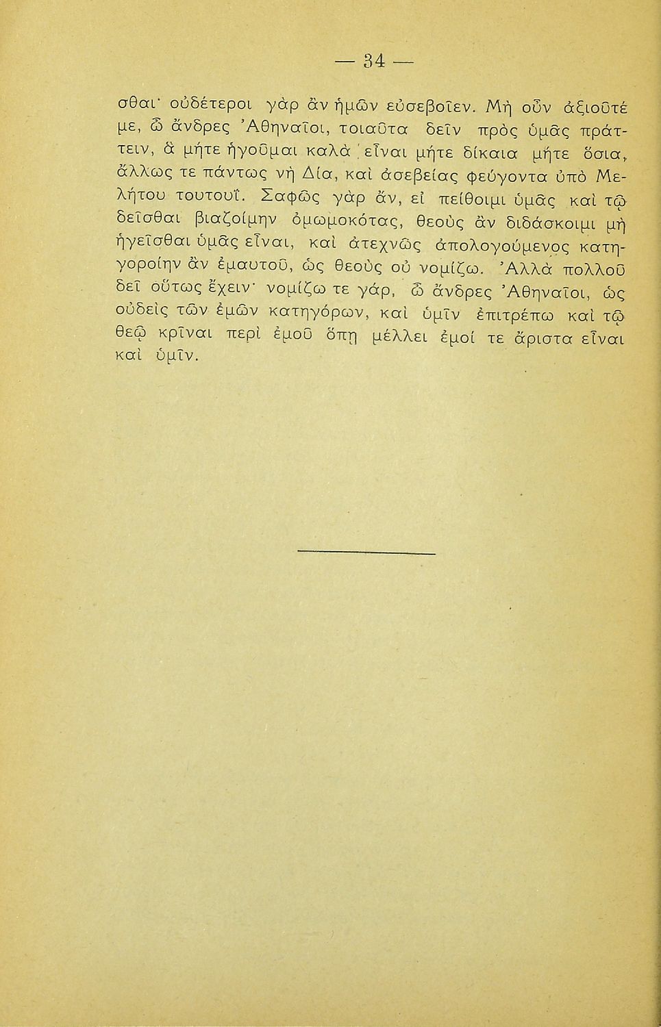 Μαθητικό βοήθημα Αρχαίων Ελληνικών της Γ΄ τάξης των τετρατάξιων Γυμνασίων. Το βιβλίο περιέχει σε μετάφραση το έργο του Πλάτωνα Απολογία του Σωκράτη.