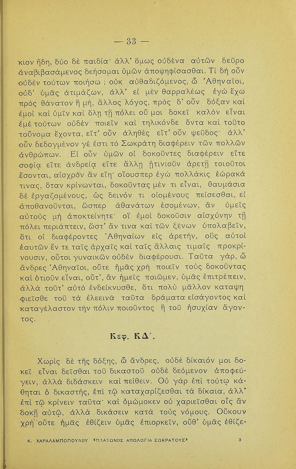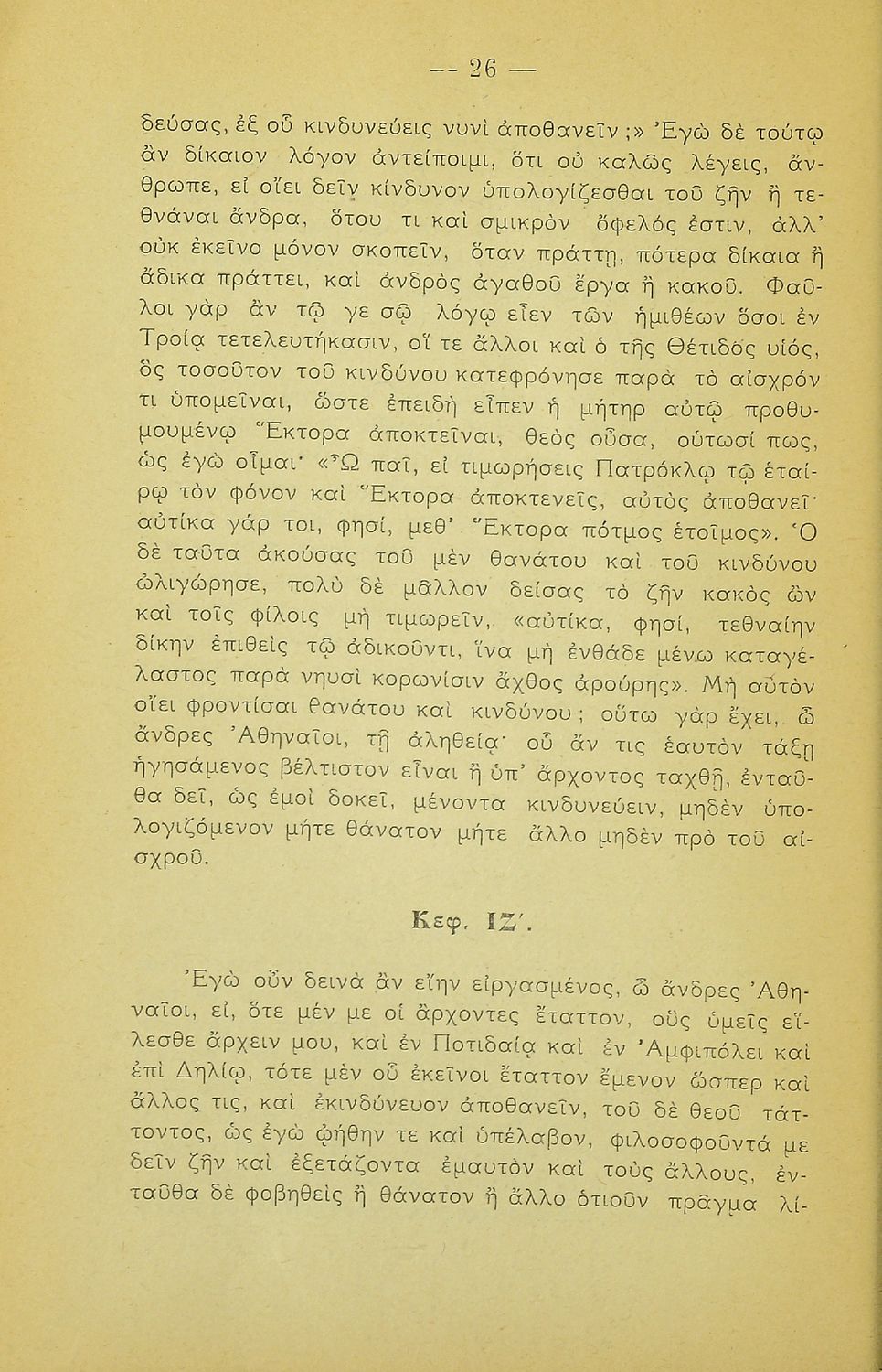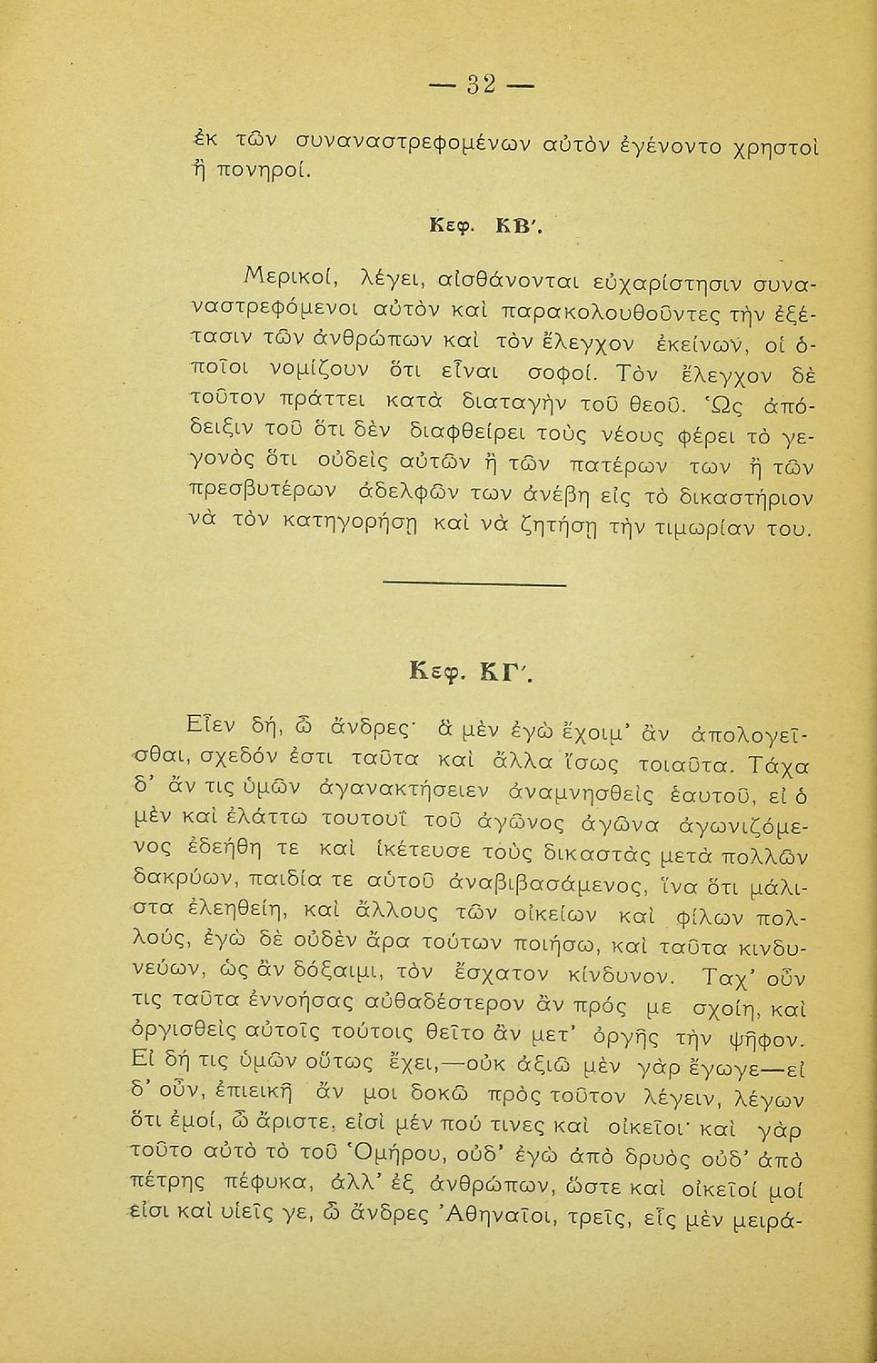 Μαθητικό βοήθημα Αρχαίων Ελληνικών της Γ΄ τάξης των τετρατάξιων Γυμνασίων. Το βιβλίο περιέχει σε μετάφραση το έργο του Πλάτωνα Απολογία του Σωκράτη.