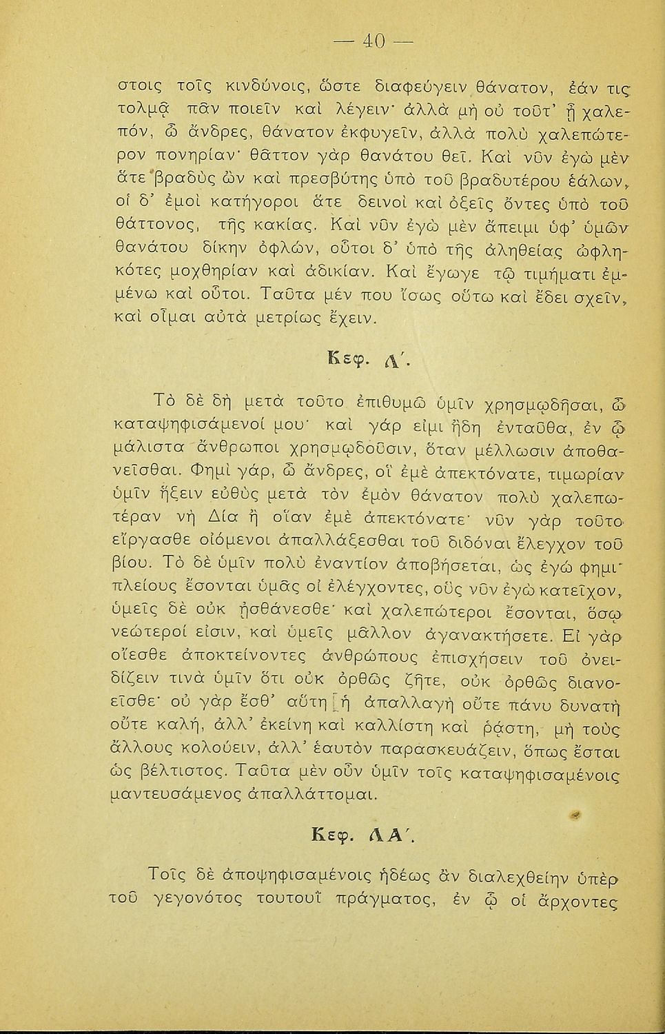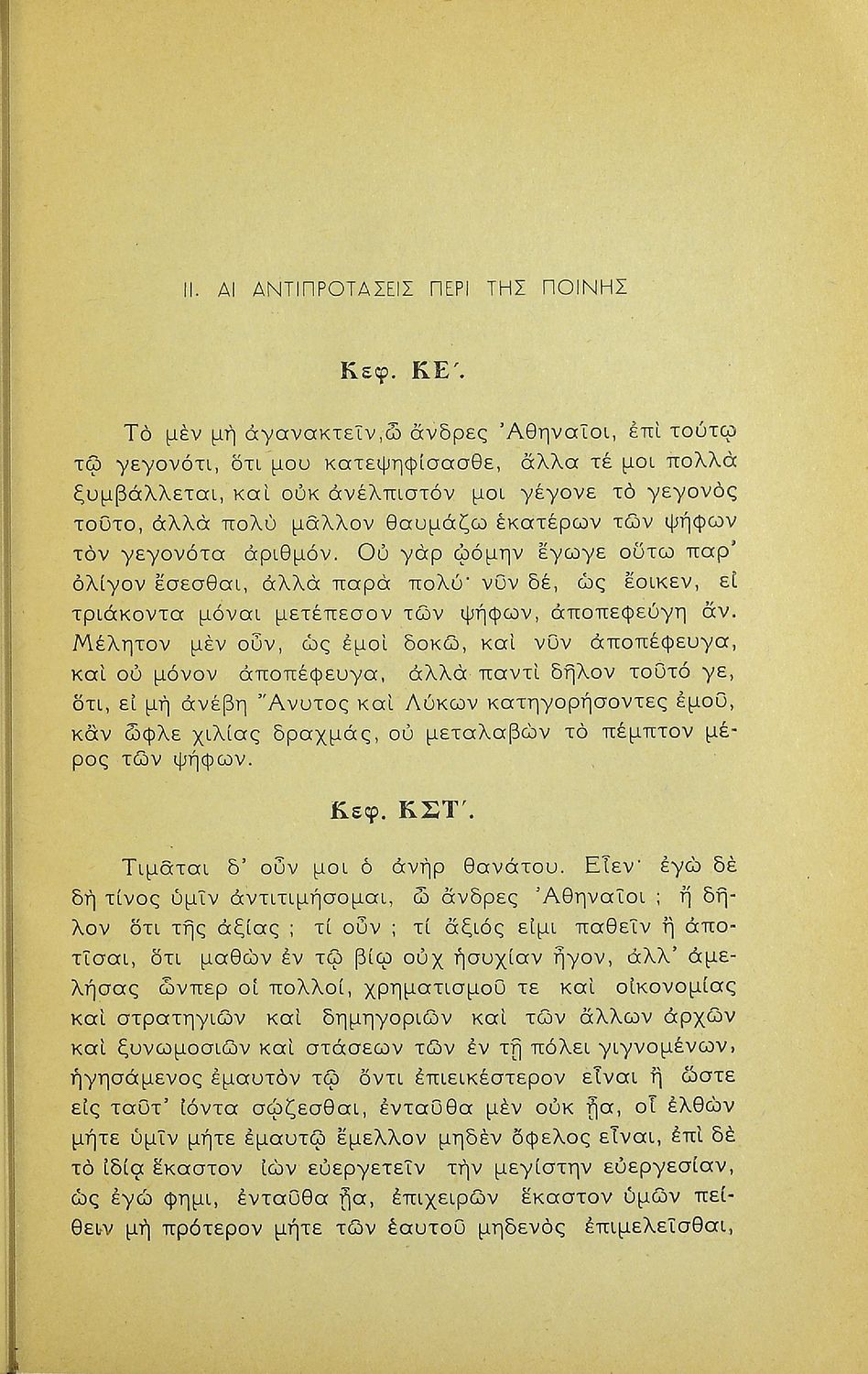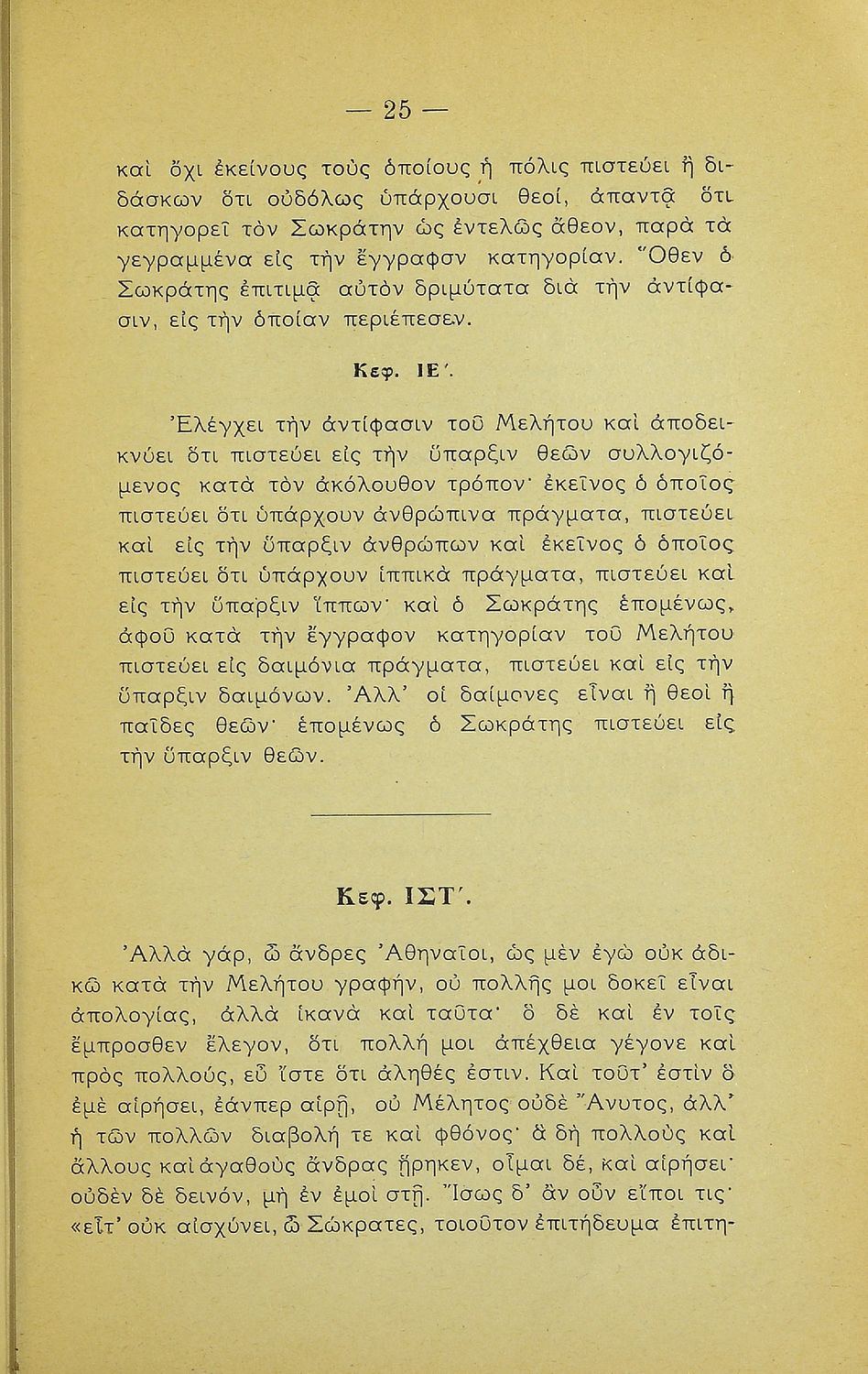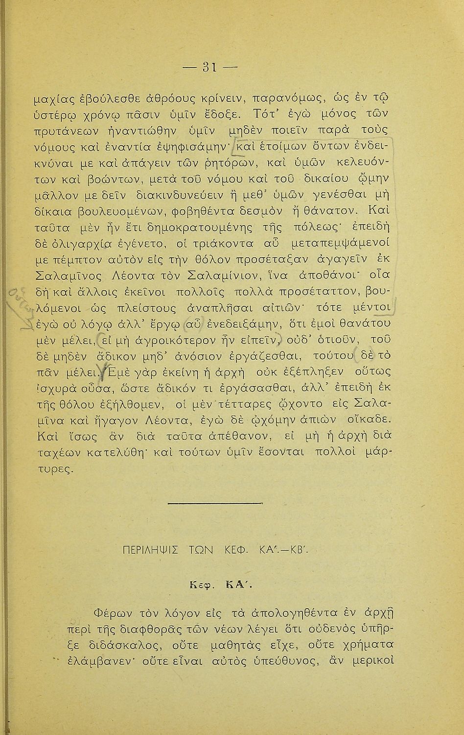 Μαθητικό βοήθημα Αρχαίων Ελληνικών της Γ΄ τάξης των τετρατάξιων Γυμνασίων. Το βιβλίο περιέχει σε μετάφραση το έργο του Πλάτωνα Απολογία του Σωκράτη.