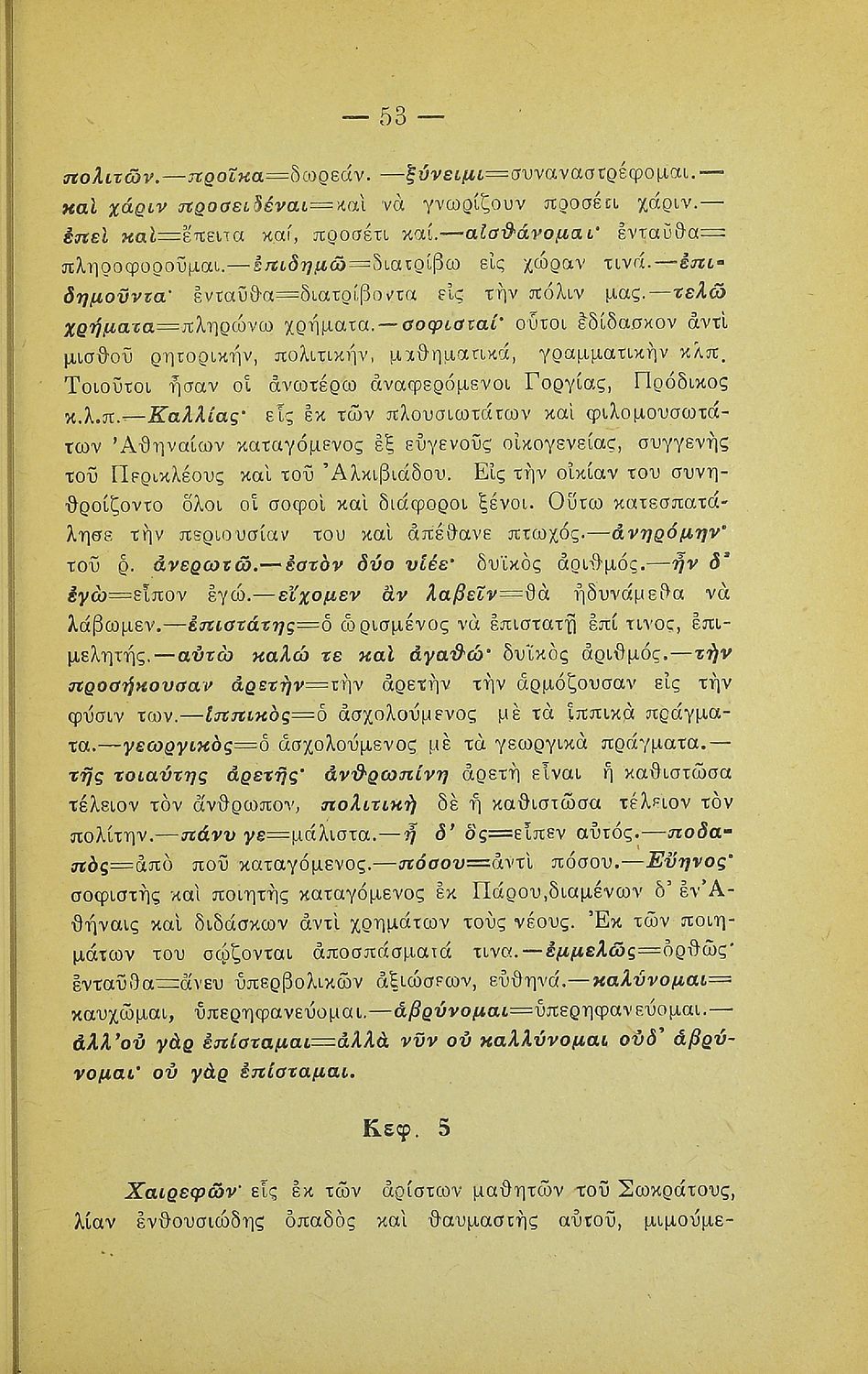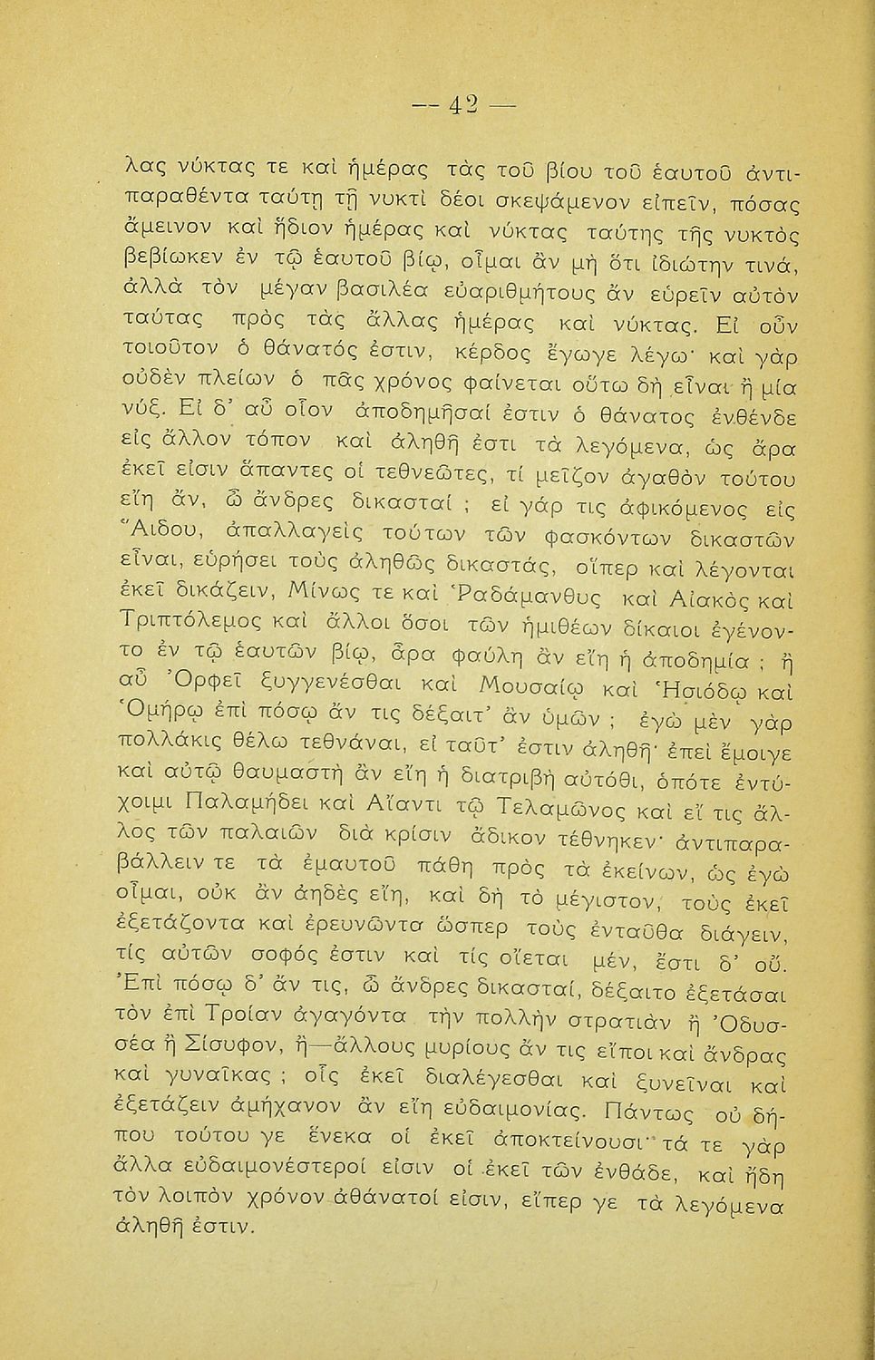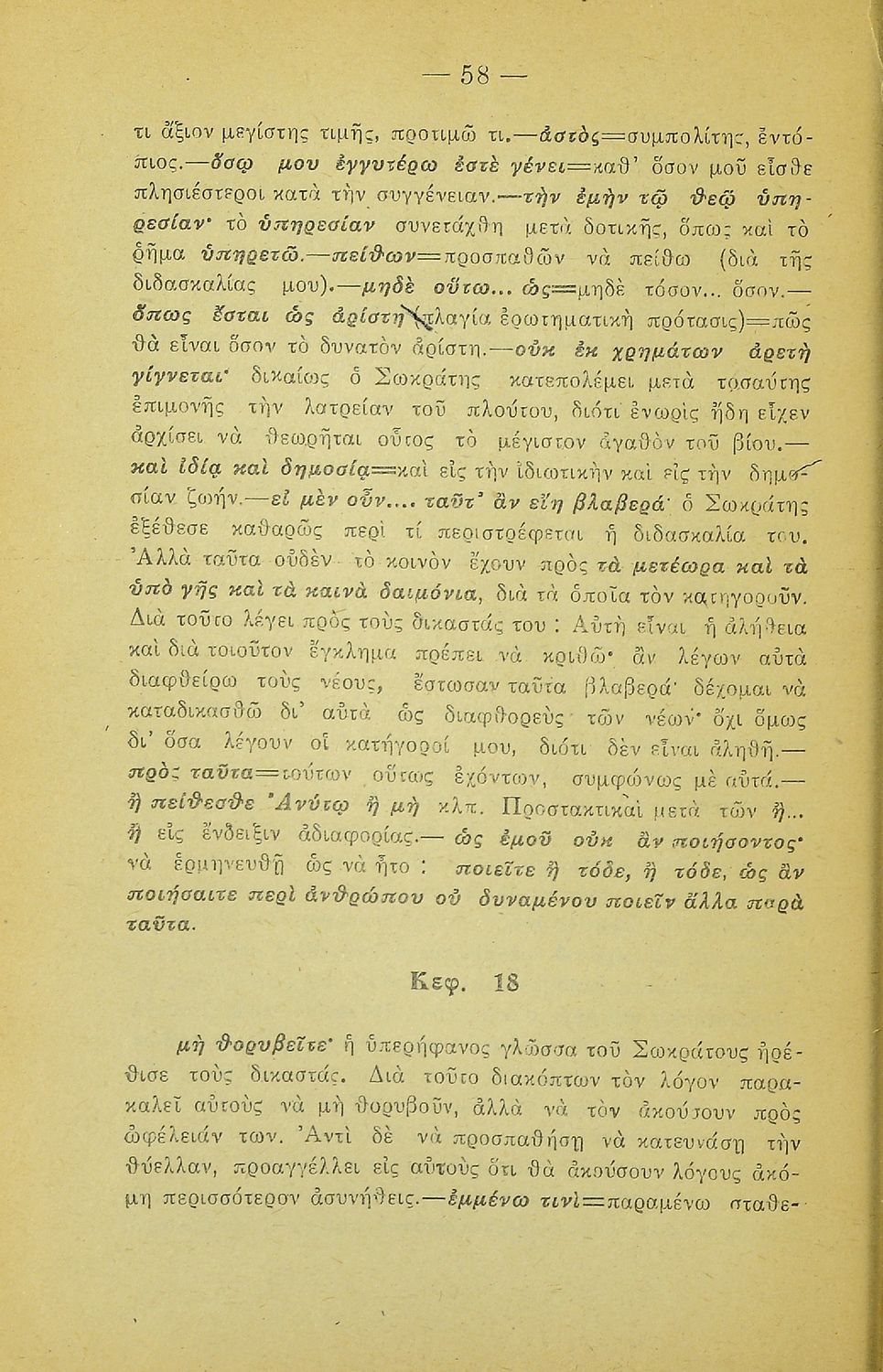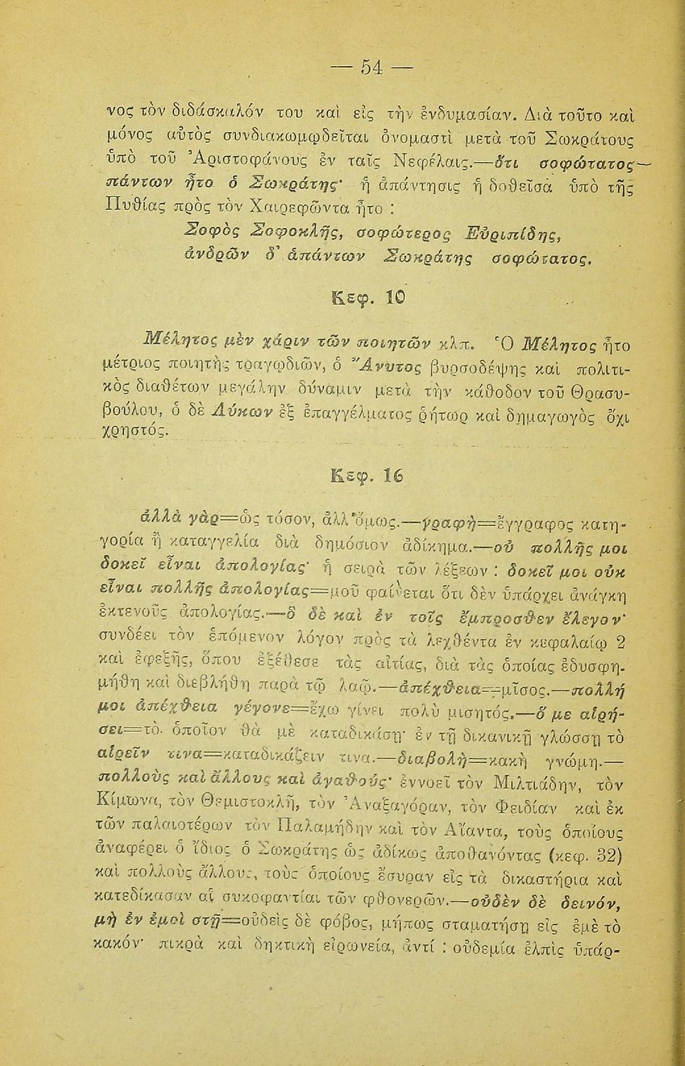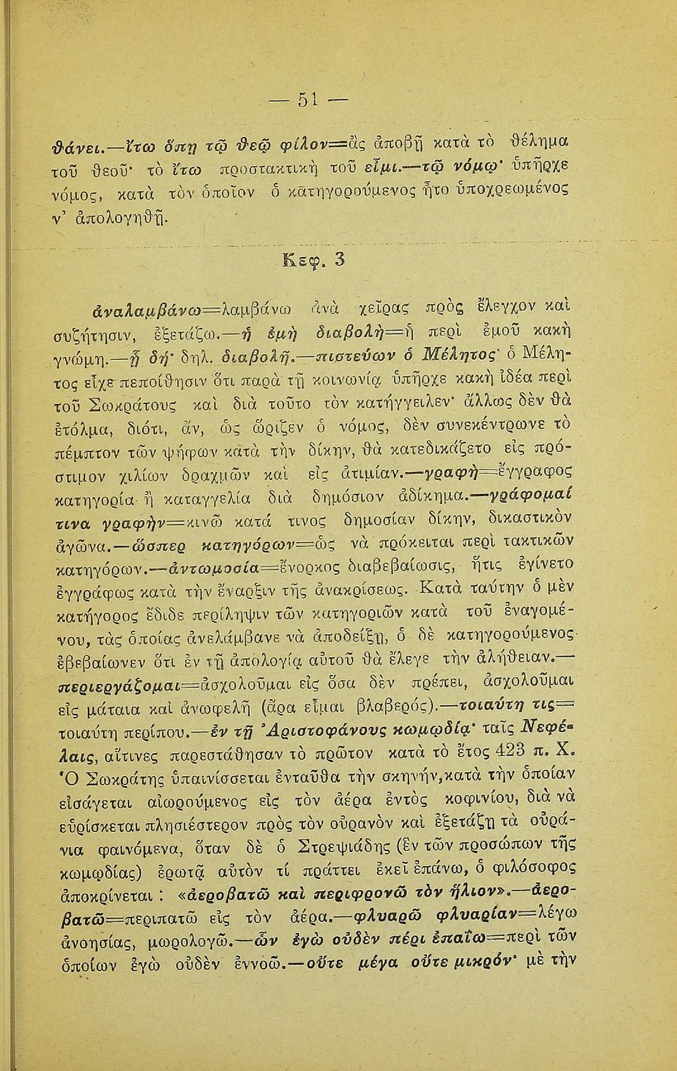 Μαθητικό βοήθημα Αρχαίων Ελληνικών της Γ΄ τάξης των τετρατάξιων Γυμνασίων. Το βιβλίο περιέχει σε μετάφραση το έργο του Πλάτωνα Απολογία του Σωκράτη.